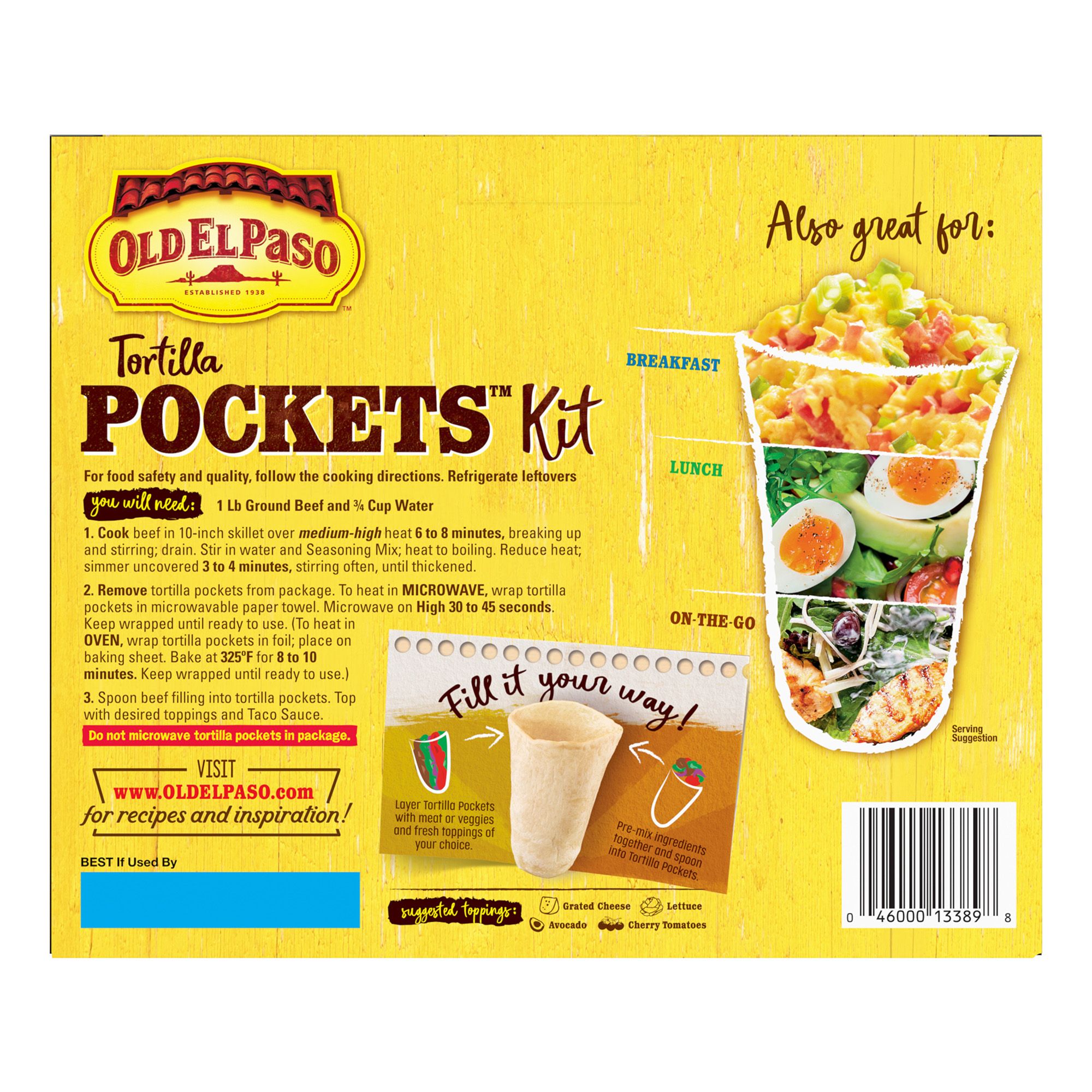 Old El Paso Tortilla Pockets Kit is a new, mess free way to enjoy taco night. Enjoy all the benefits of tortilla pockets in a convenient, easy-to-make kit that includes the category’s #1 taco seasoning and Old El Paso’s original taco sauce. The easy-to-hold flour tortillas are sealed at the bottom to help ensure no spill, mess, or dripping. No need to roll or fold the taco pockets, just decide what you what to put in them. Make taco night an easy breeze with Old El Paso Tortilla Pockets Taco Kit. Each package comes with eight tortilla pockets, taco sauce and seasoning. Just add meat and toppings. Use the seasoning and sauce to make taco meat and start stuffing your tortilla pockets.