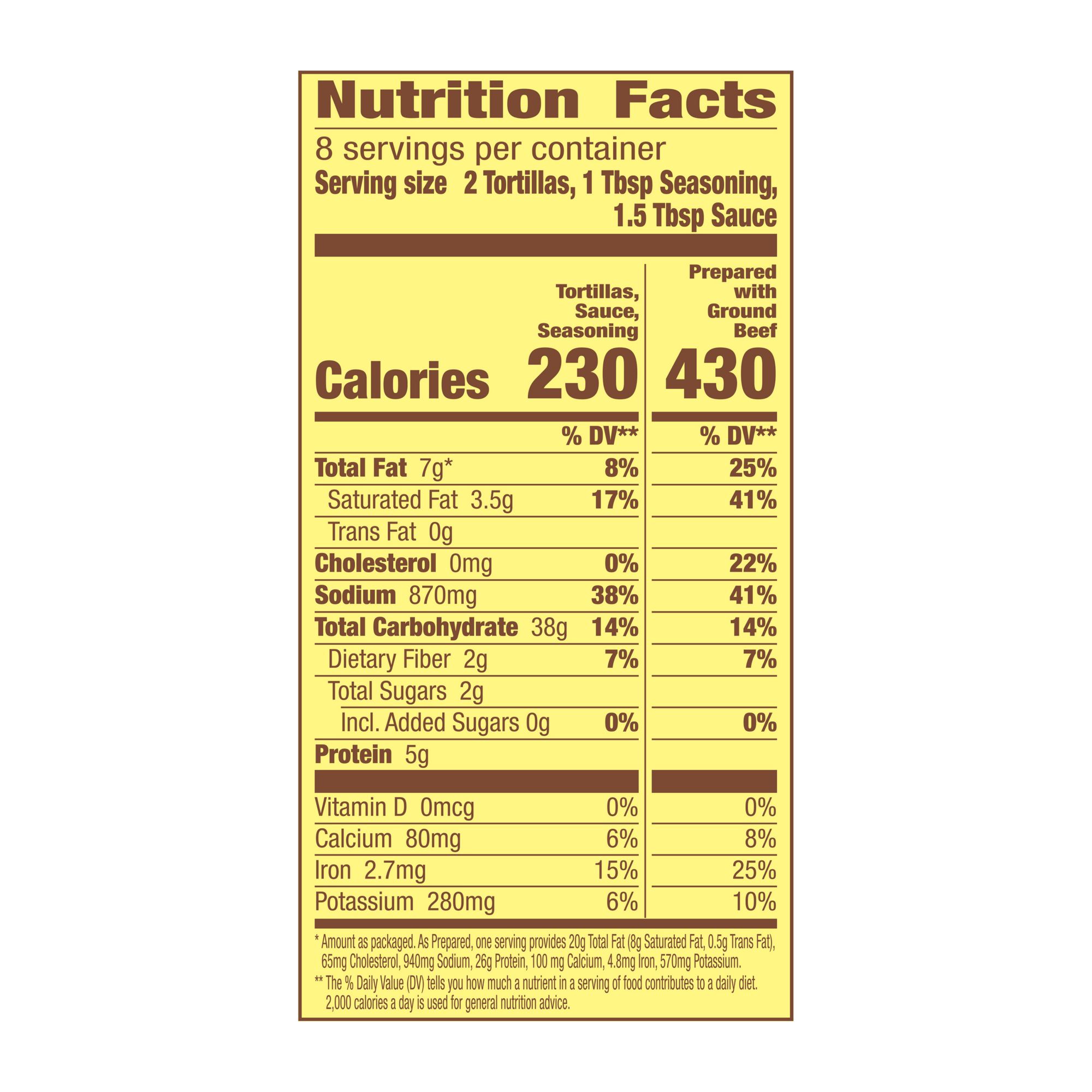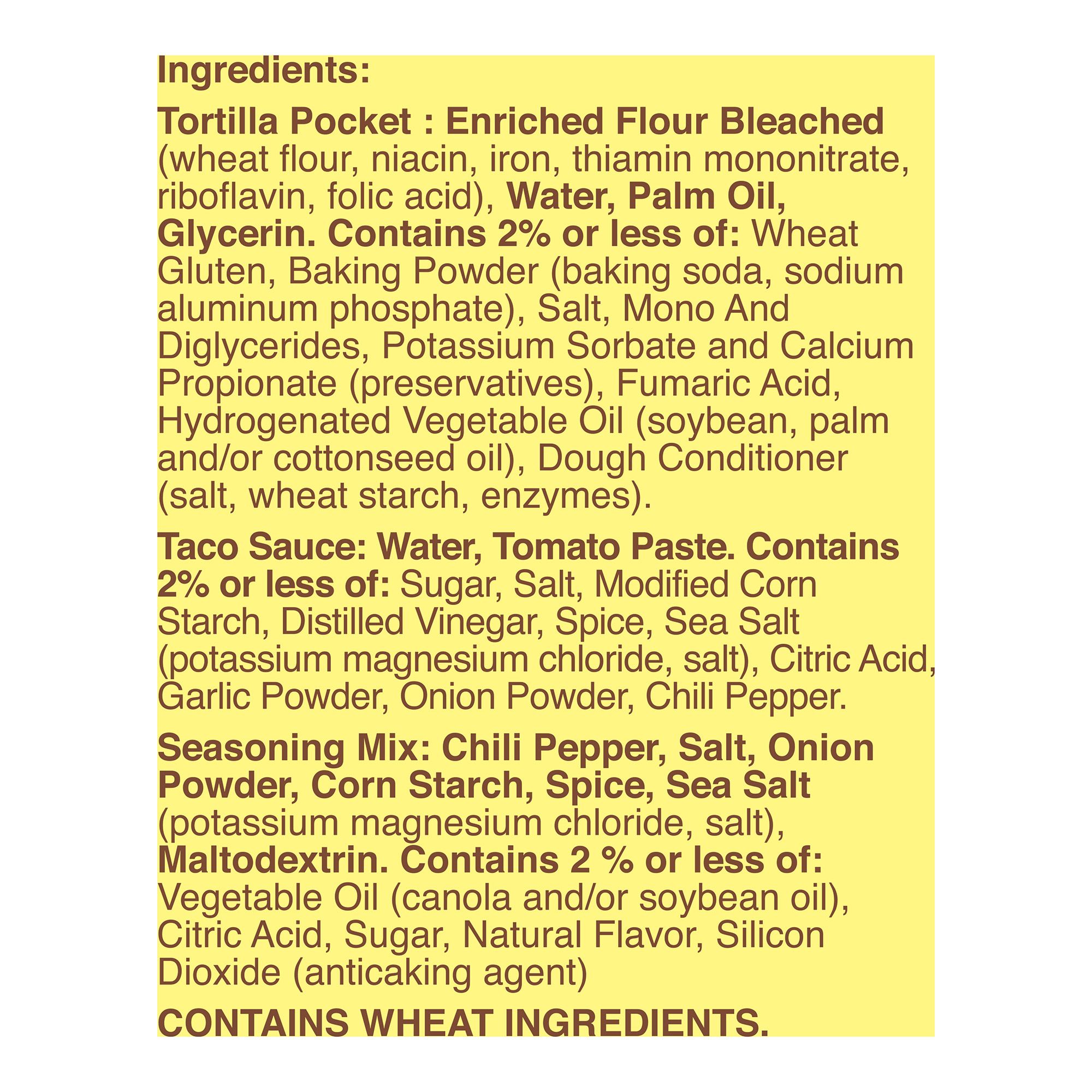 Ingredients: Tortilla Pocket: Enriched Flour Bleached (Wheat Flour, Niacin, Iron, Thiamin Mononitrate, Riboflavin, Folic Acid), Water, Palm Oil, Glycerin. Contains 2% Or Less Of: Wheat Gluten, Baking Powder (Baking Soda, Sodium Aluminum Phosphate), Salt, Mono And Diglycerides, Potassium Sorbate And Calcium Propionate (Preservatives), Fumaric Acid, Hydrogenated Vegetable Oil ( Soybean, Palm And/or Cottonseed Oil ), Dough Conditioner (Salt, Wheat Starch, Enzymes). Taco Sauce: Water, Tomato Paste. Contains 2% Or Less Of: Sugar, Salt, Modified Corn Starch, Distilled Vinegar, Spice, Sea Salt (Potassium Magnesium Chloride, Salt), Citric Acid, Garlic Powder, Onion Powder, Chili Pepper. Seasoning Mix: Chili Pepper, Salt, Onion Powder, Corn Starch, Spice, Sea Salt (Potassium Magnesium Chloride, Salt), Maltodextrin. Contains 2 % Or Less Of: Vegetable Oil (Canola And/or Soybean Oil), Citric Acid, Sugar, Natural Flavor, Silicon Dioxide (Anti-Caking Agent).