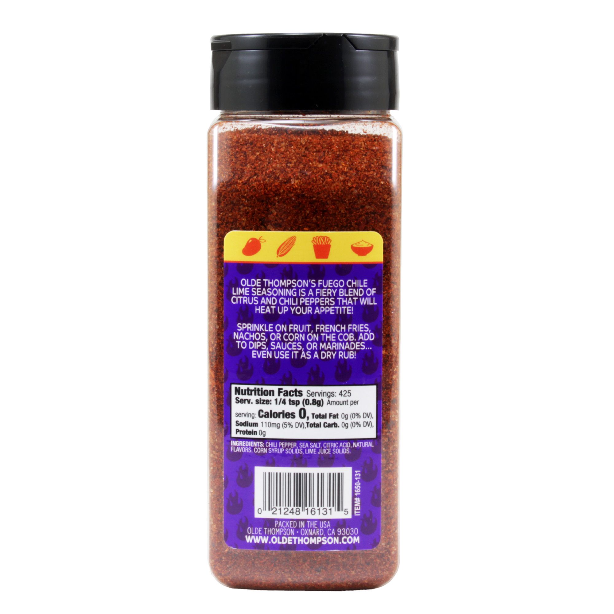 Olde Thompson Fuego Lime Chili Seasoning combines the perfect blend of spicy chili pepper with a twist of lime. This seasoning is perfect for adding a tangy flavorful kick to fish, poultry, vegetables, even fruit. Try sprinkling this seasoning on fruit, salads, chips, veggies, or popcorn. This seasoning is also great for chicken, seafood, beef or pork. Add to dips, sauces or marinades, and even use as a dry rub.