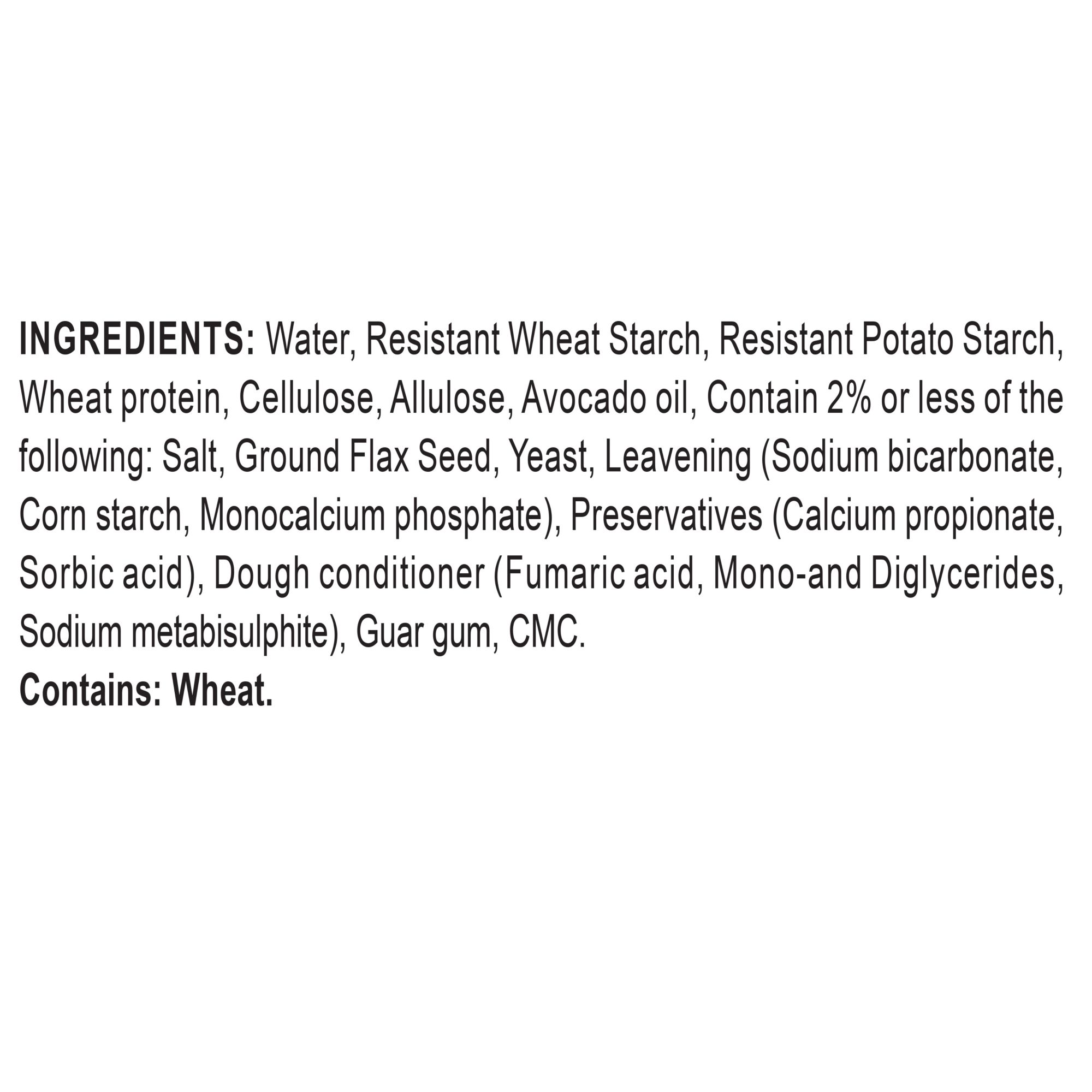 Ingredients: Water, Resistant Wheat Starch, Resistant Potato Starch, Wheat protein, Cellulose, Allulose, Avocado oil, Contain 2% or less of the following: Salt, Ground Flax Seed, Yeast, Leavening (Sodium bicarbonate, Corn starch, Monocalcium phosphate), Preservatives (Calcium propionate, Sorbic acid), Dough conditioner (Fumaric acid, Mono-and Diglycerides, Sodium metabisulphite), Guar gum, CMC.