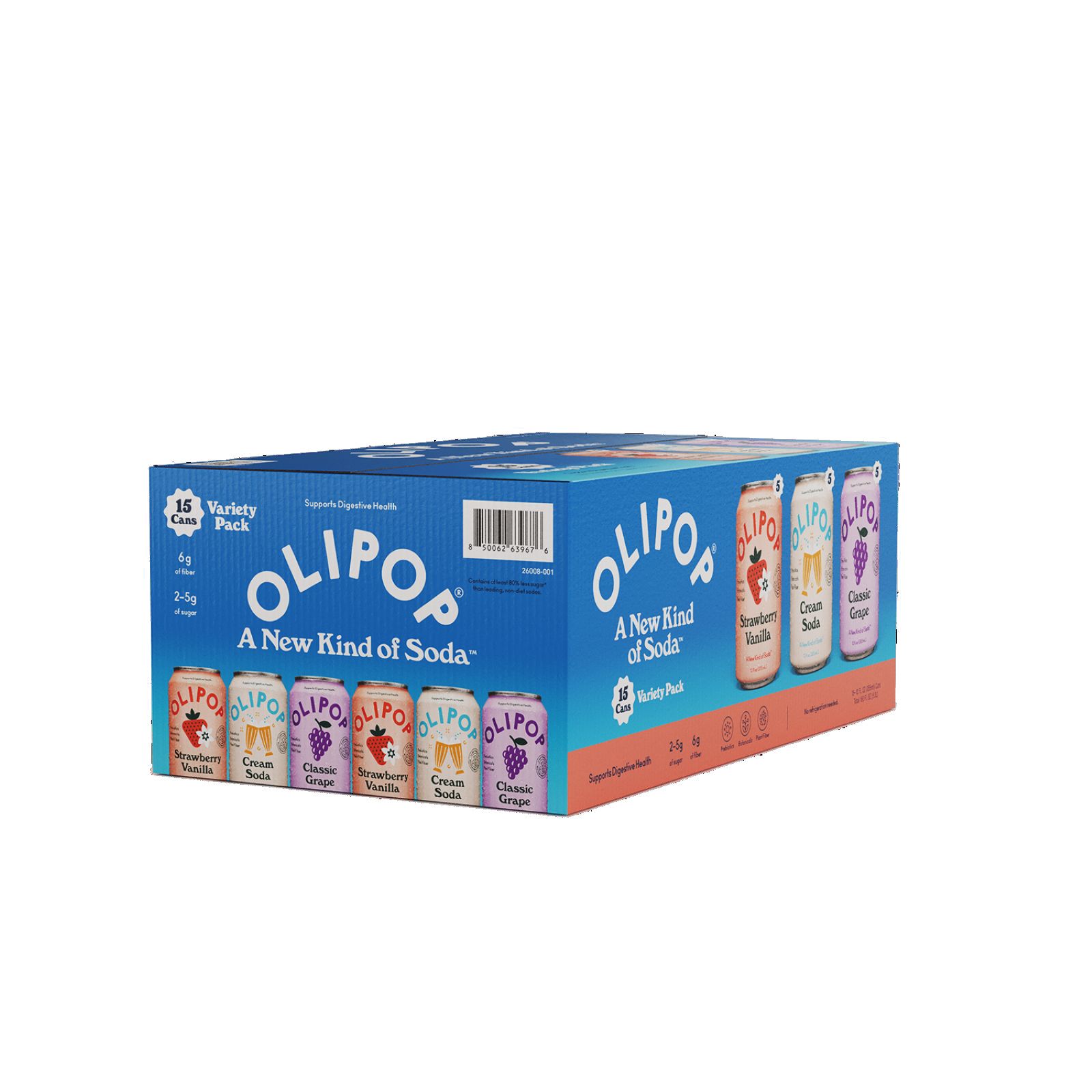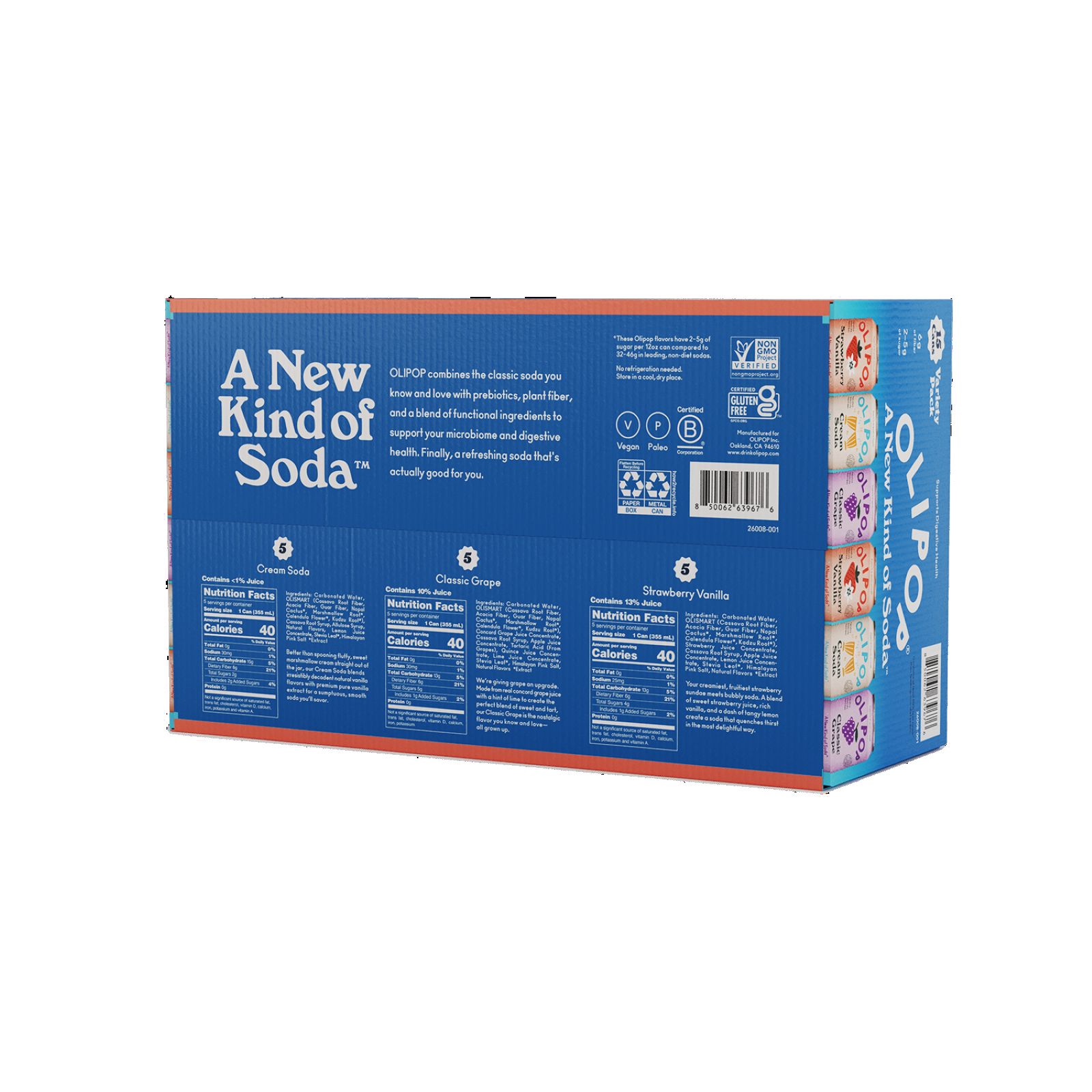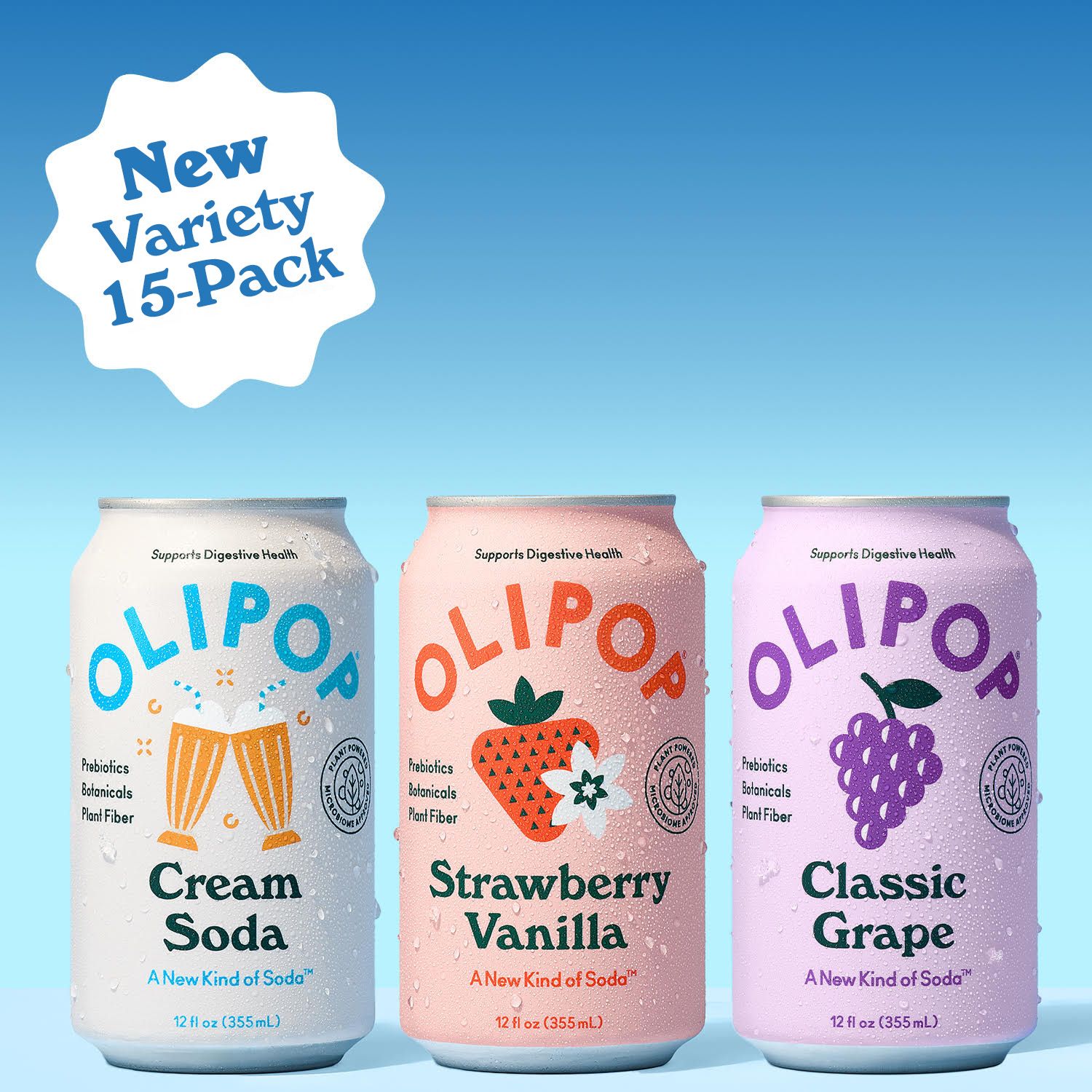 Olipop Prebiotic Soda Variety Pack, Strawberry Vanilla, Cream Soda, Classic Grape, 15 pk./12 fl. oz.