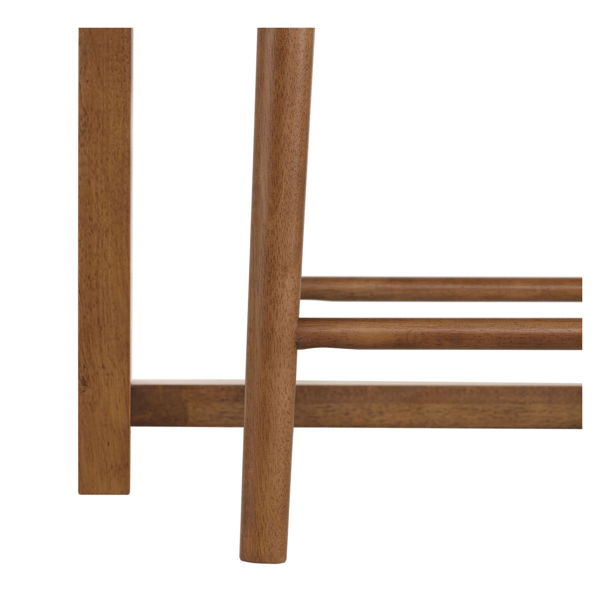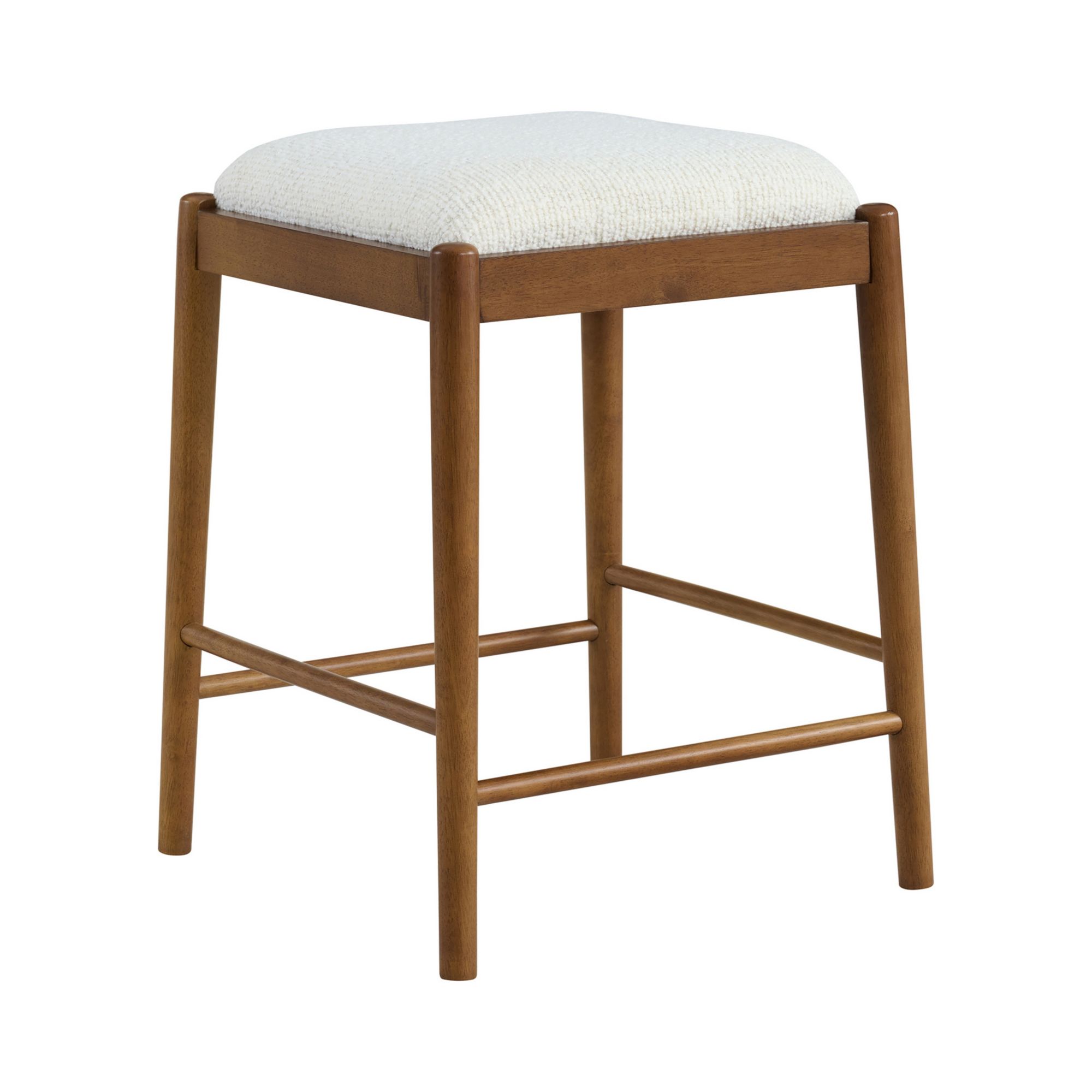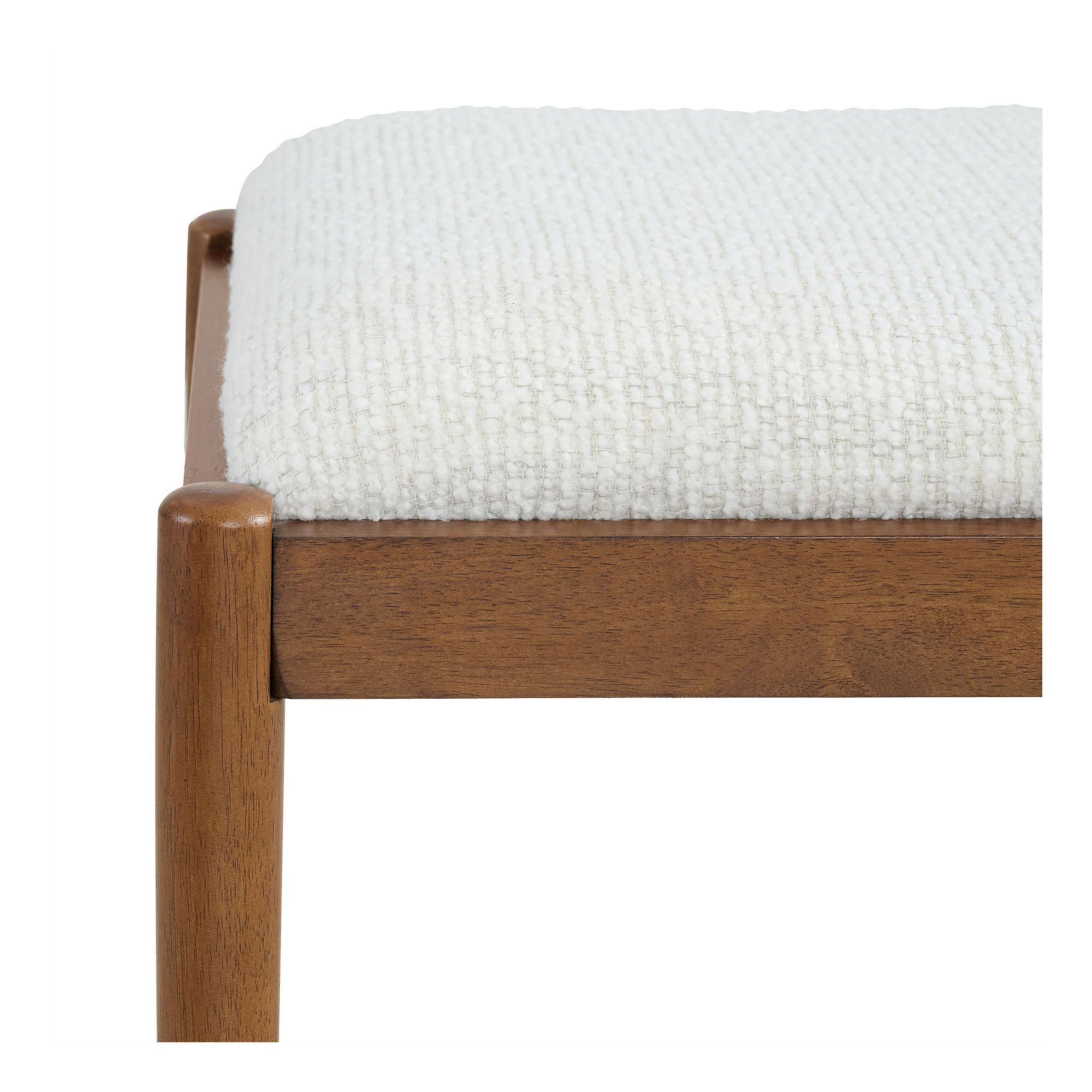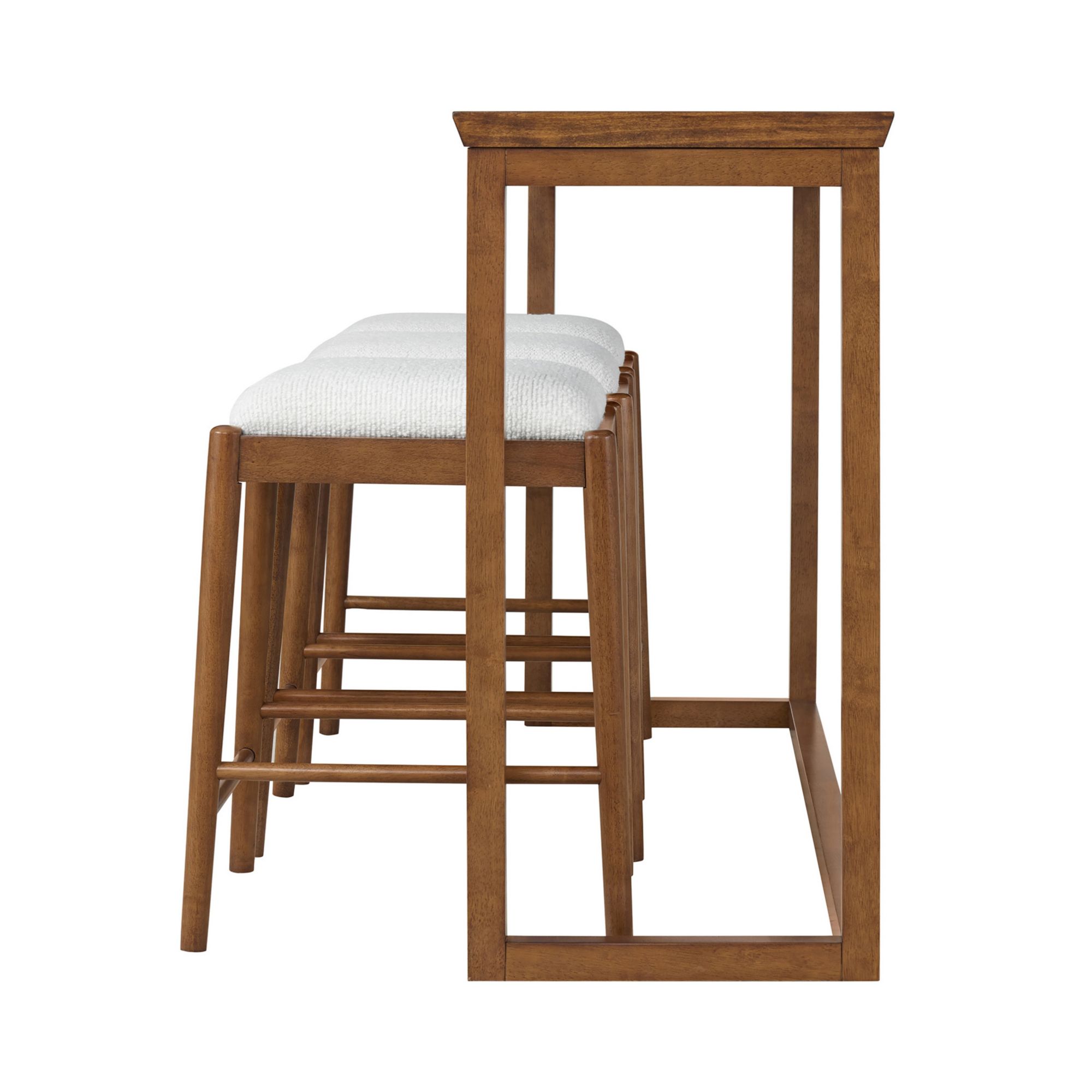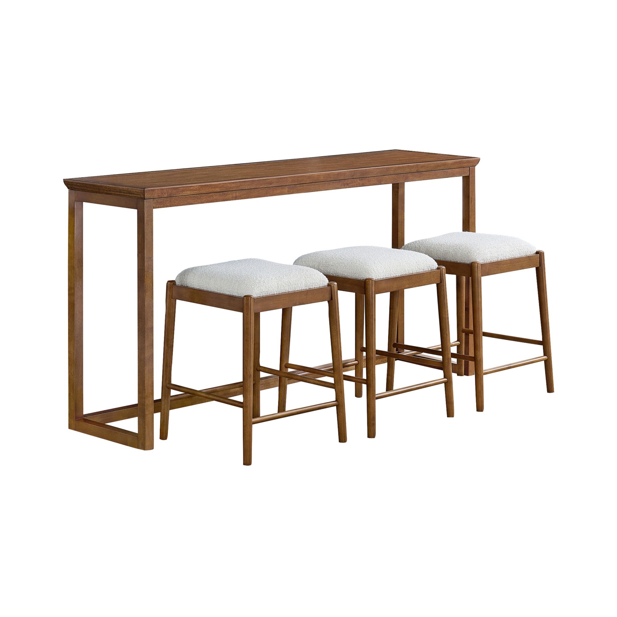 Add sophisticated style to your living room with the Olivette mid-century modern sofa table and stool set. Boasting an artisanal look, this versatile set showcases sleek lines and eye-catching details. The sofa table has a classic silhouette with a beveled tabletop edge, and the three backless stools have seats upholstered in a textured, beige bouclé. The tops of the stool legs peek past the surrounding frame delicately before tapering elegantly toward the floor. Constructed from rubberwood and poplar, this set features a walnut finish. Assembly required.