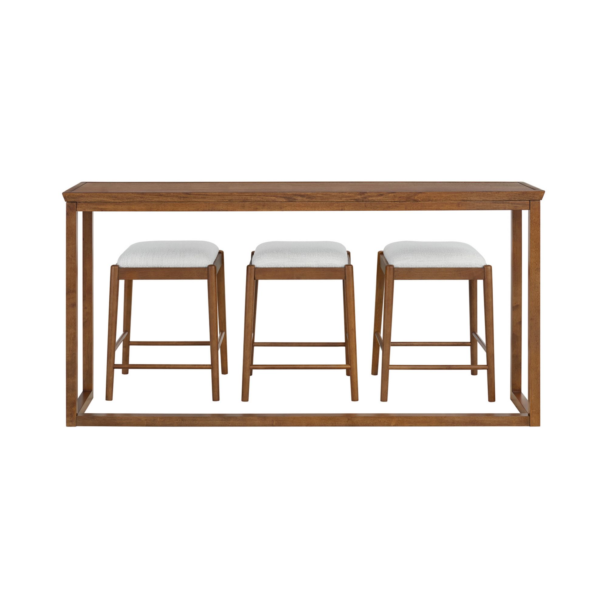 Exclusively at BJ's Constructed of rubberwood and poplar wood for long-lasting durability Overall Dimensions: Sofa Table: 36"H x 72"W x 18"D; Counter Stool: 24" H x 17.5" W x 17.5" D Item will ship in one box Spot or wipe clean with a damp cloth or sponge Recommended weight limit: 250 lbs. Residential use only Includes (1) wood sofa table, (3) backless counter height stools