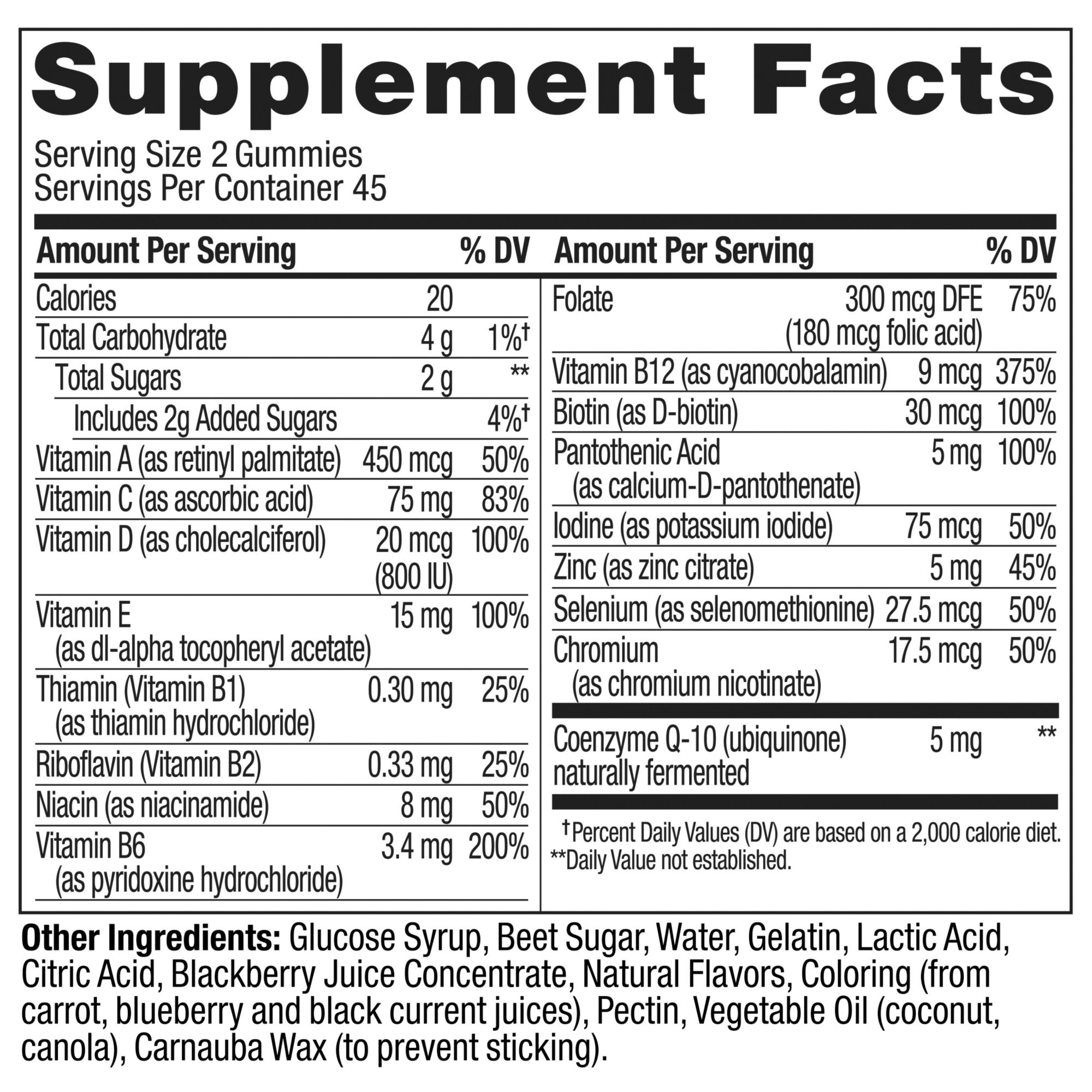 16 essential vitamins and minerals plus CoQ10 to amp up overall wellness B vitamins and CoQ10 support energy production to power your day Antioxidants like Vitamins A, C, and E help fight free radicals and promote a healthy heart How to take: Chew two gummies daily, no food or water needed Naturally flavored Blackberry Blitz, made with no artificial colors or flavors and gluten-free 200 gummies per bottle for a 100 day supply Includes 200 ct. bottle