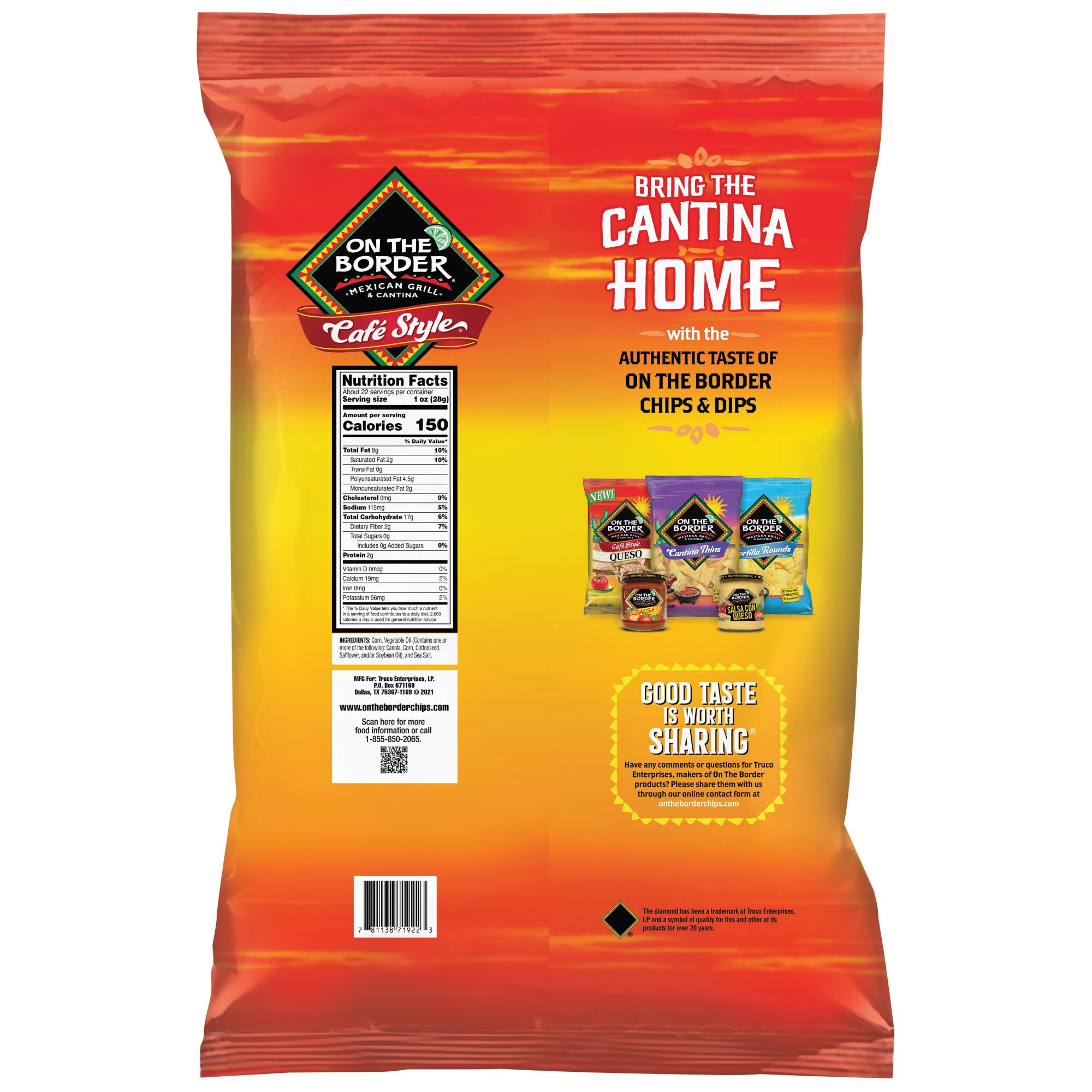 On The Border Cafe Style, tortilla chips are incredible alone or with your favorite dip thanks to their signature flaky, bubbly texture. These delicious restaurant-style tortilla chips are perfect with On The Border chunky salsa and On The Border salsa con queso.