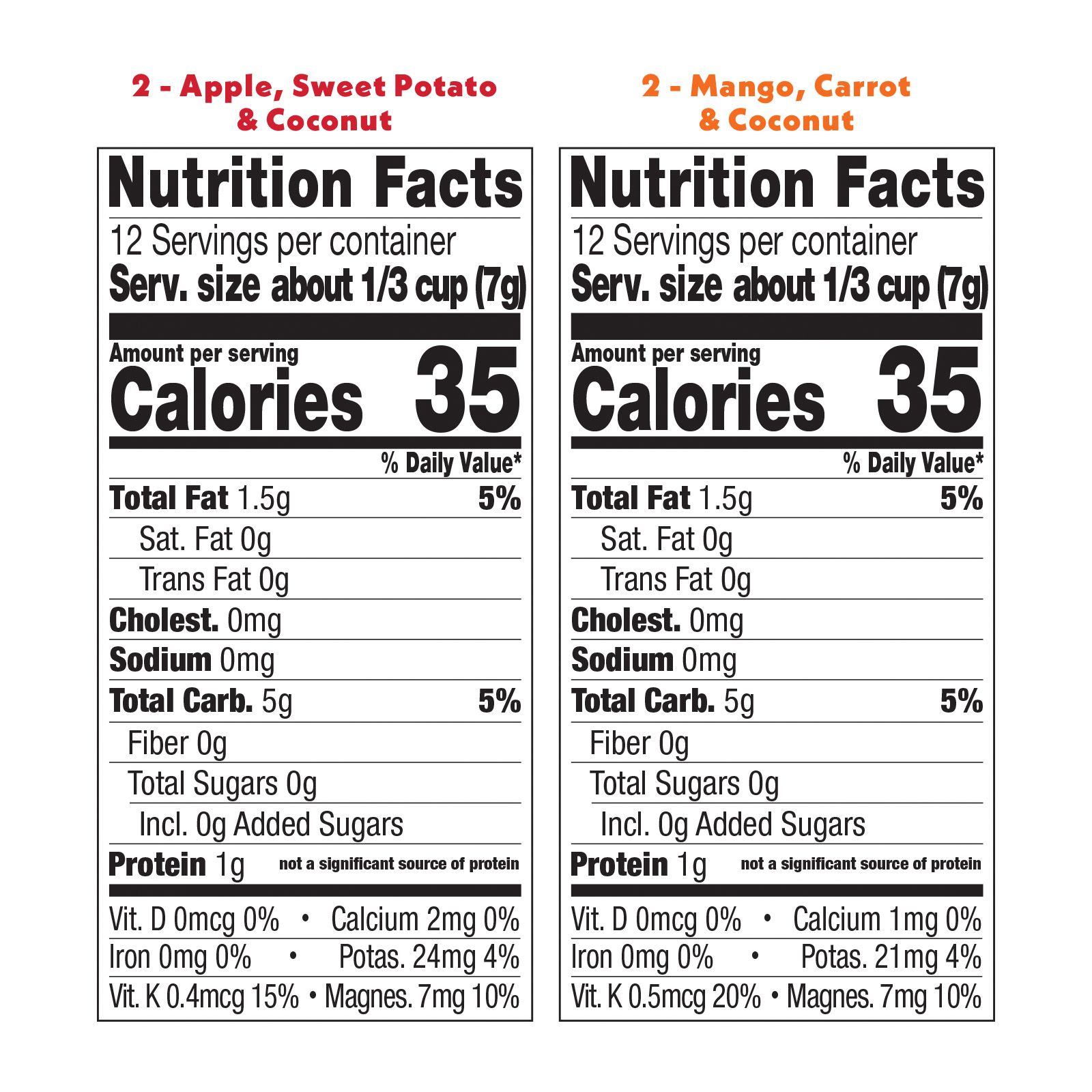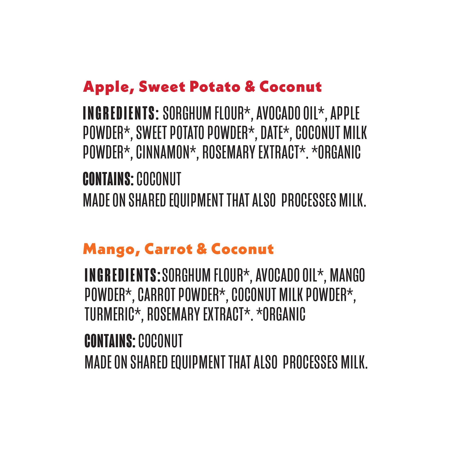 Simple & Clean Ingredient List: Made with avocado oil, our organic sorghum-based Fruit & Veggie Puffs include delicious flavors inspired by our Baby Food Pouches. No rice, corn, or cassava here! Snacktime Made Easy: Delicious fast-dissolving puffs that are easy to pick up and even easier to grab from your pantry and pour on a highchair tray! Pack-and-Snack Canister: Easy snack at home or on the go! Enjoy these light and airy puffs in the convenience of a pantry-safe portable multi-serve canister. Perfect for throwing in the diaper bag or popping in the daycare lunch bag. Designed with Babies in Mind: Designed for ages 10+ months. Fast-dissolving for safe self-feeding. Empower Little Ones: The perfect snack to introduce and encourage independent eating, develop early motor skills, and pincer grasp practice Includes (2) Apple, Sweet Potato & Coconut, (2) Mango, Carrot & Coconut