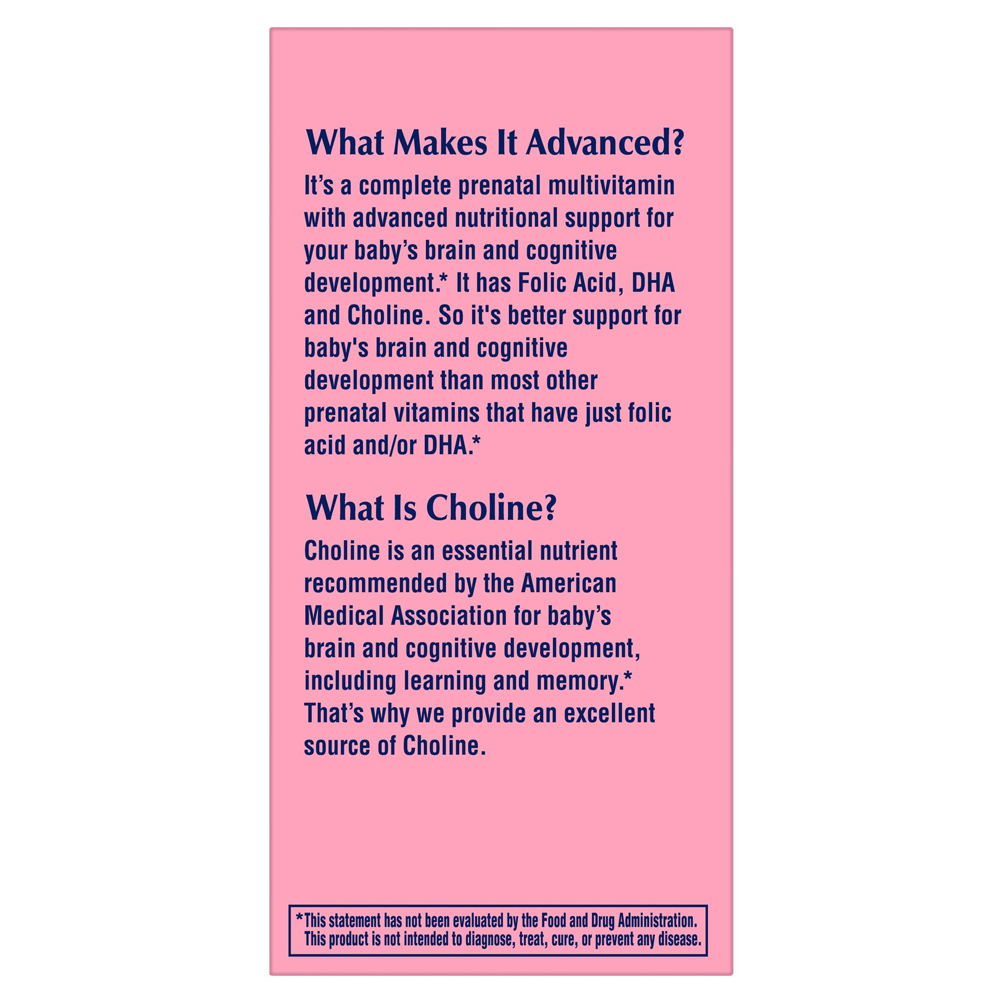 Less than 10% of US pregnant women are meeting the recommended intake of Choline of 450mg daily. One A Day Prenatal Advanced Multivitamin provides 110mg (20% of Daily Value), whereas other leading prenatal multivitamin brands only contain 0-55mg of Choline.