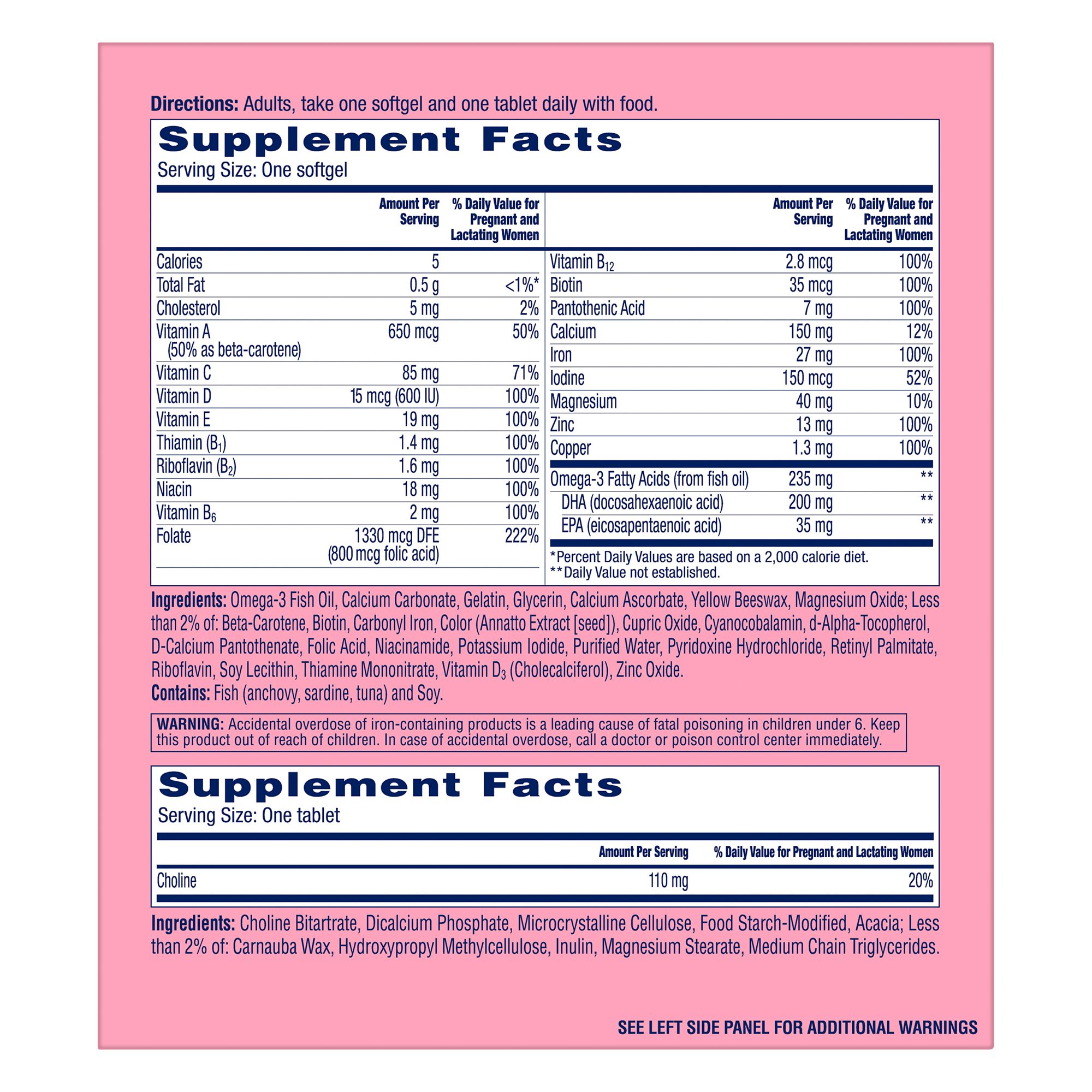 "Softgel: Omega-3 Fish Oil, Calcium Carbonate, Gelatin, Glycerin, Calcium Ascorbate, Yellow Beeswax, Magnesium Oxide; Less Than 2% of: Beta-carotene, Biotin, Carbonyl Iron, Color (Annatto Extract [seed]), Cupric Oxide, Cyanocobalamin, D-alpha-tocopherol, D-calcium Pantothenate, Folic Acid, Niacinamide, Potassium Iodide, Purified Water, Pyridoxine Hydrochloride, Retinyl Palmitate, Riboflavin, Soy Lecithin, Thiamine Mononitrate, Vitamin D3 (Cholecalciferol), Zinc Oxide. Choline Tablet: Choline Bitartrate, Dicalcium Phosphate, Microcrystalline Cellulose, Food Starch-modified, Acacia; Less Than 2% of Carnauba Wax, Hydroxypropyl Methylcellulose, Inulin, Magnesium Stearate, Medium Chain Triglycerides"