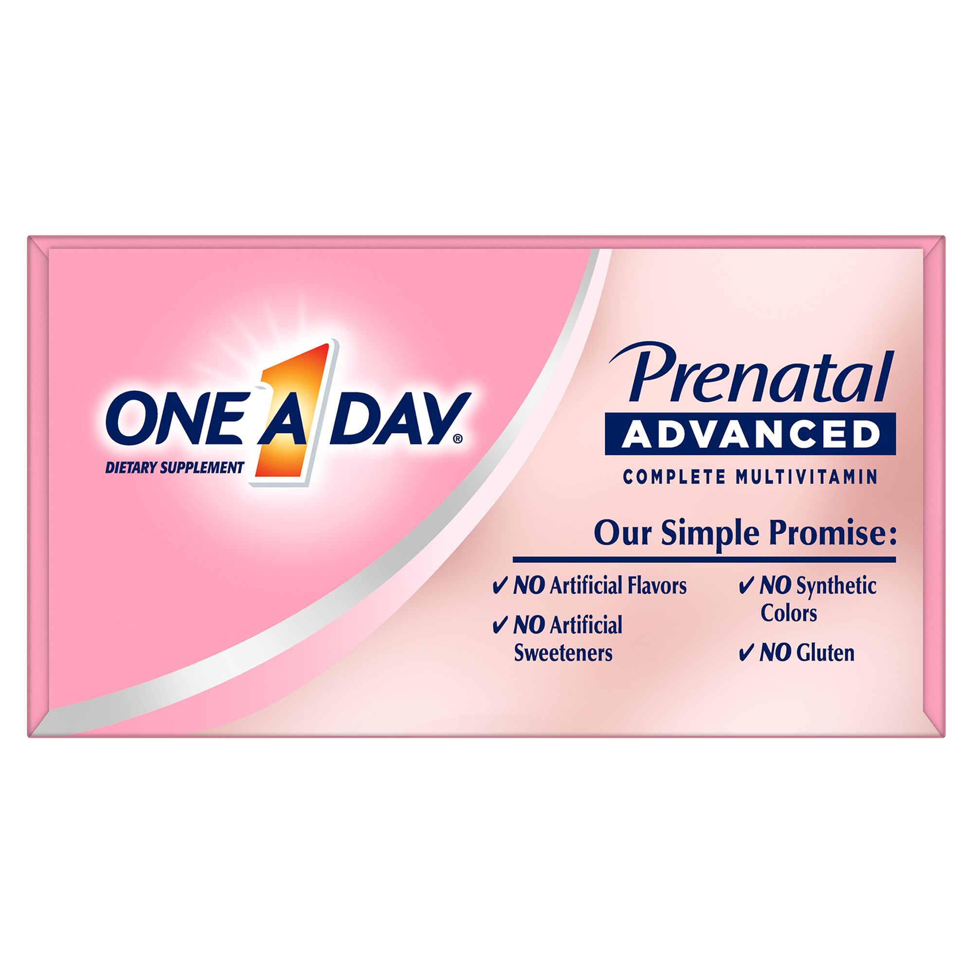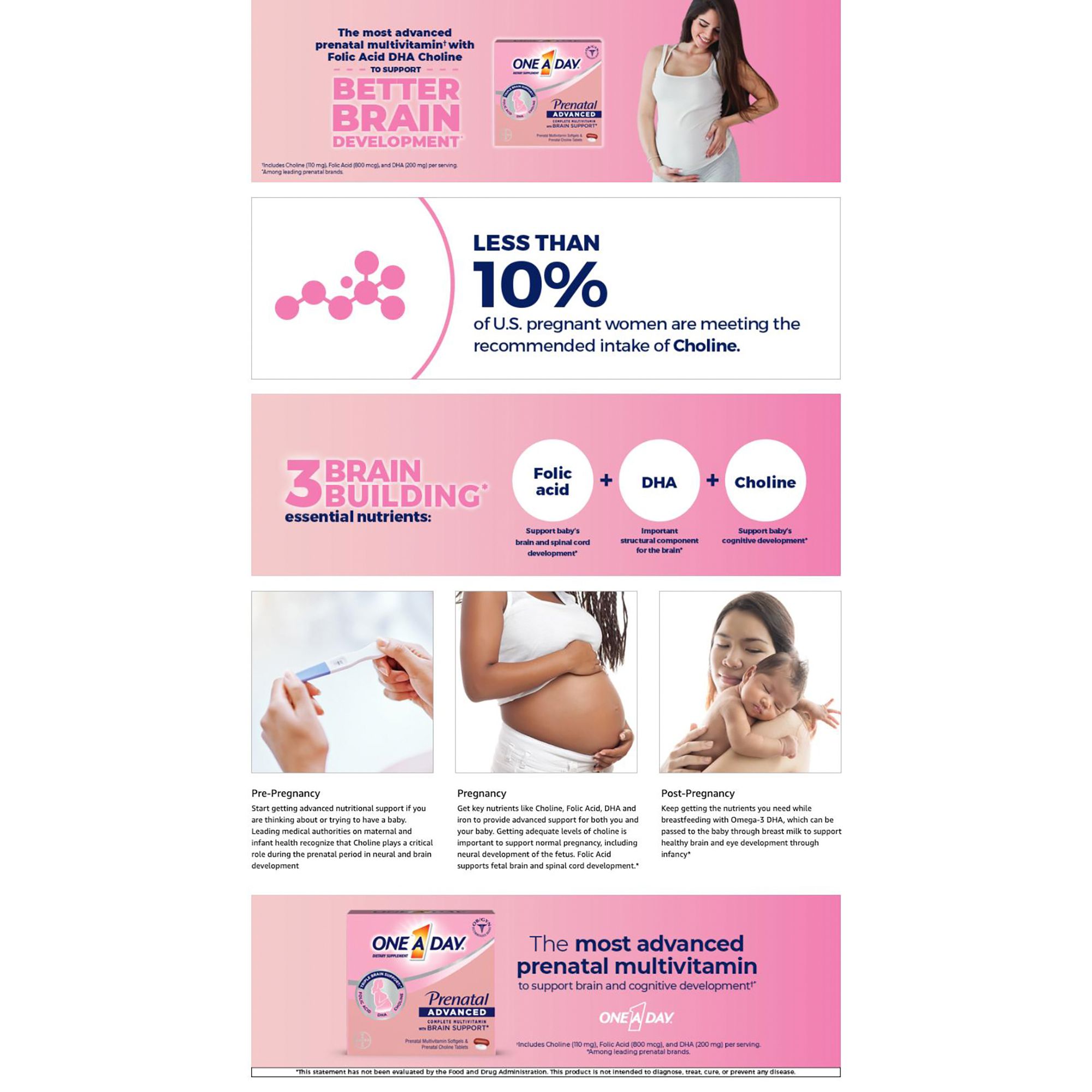 One 90 ct. bottle of One A Day prenatal advanced multivitamin soft gels, one 90 ct. bottle of One A Day advanced prenatal choline tablets #1 OB/GYN recommended prenatal vitamin OTC Brand The most advanced prenatal multivitamin for brain and cognitive development† with three brain-essential nutrients including 110mg Choline* The only prenatal multivitamin† with an excellent source of Choline to help support baby’s brain and spinal cord development* Excellent source of folic acid to help support baby’s cognitive development* Includes 200mg of DHA, an important structural component of the brain* Two pills per serving – One multivitamin softgel (with folic acid, DHA and iron) and one choline tablet