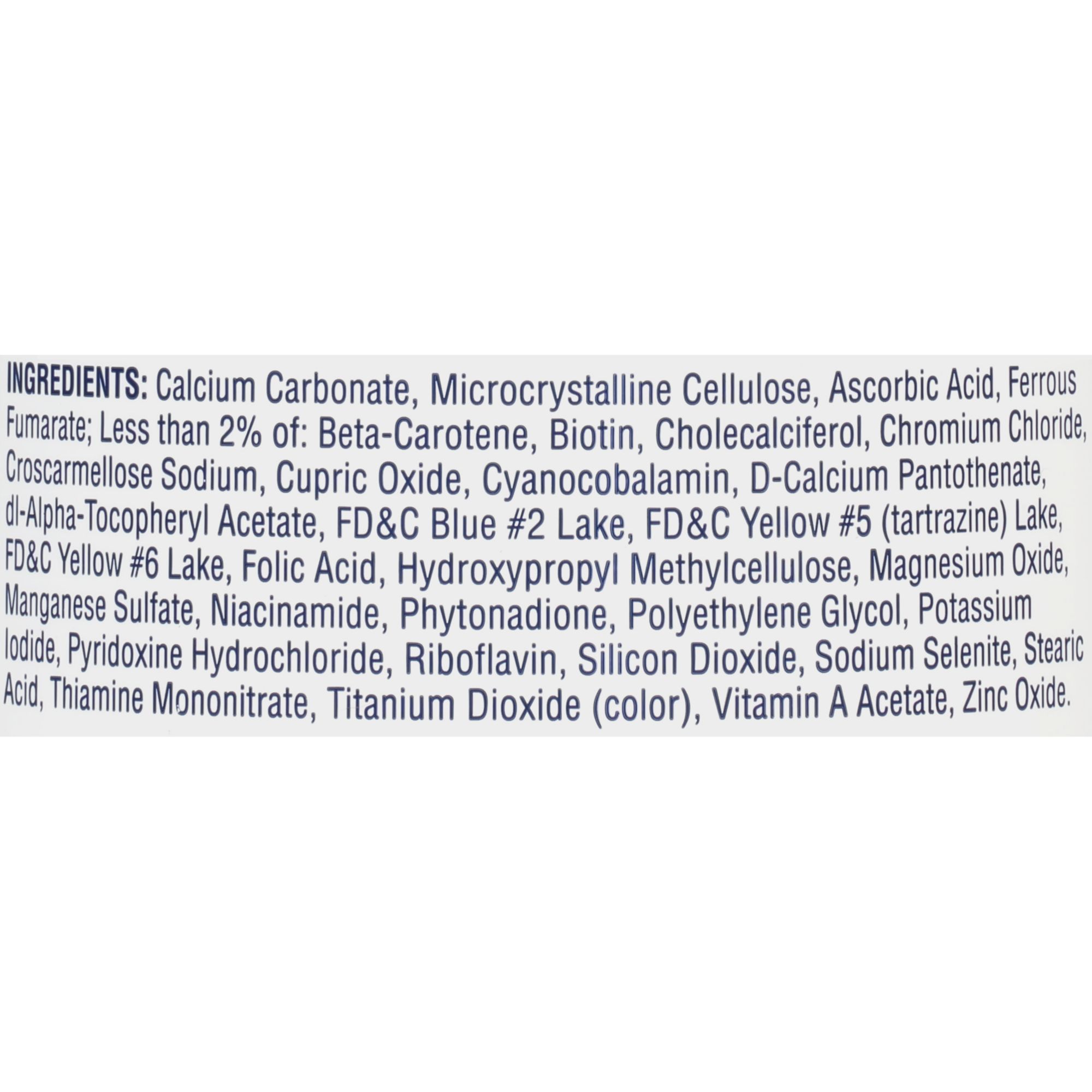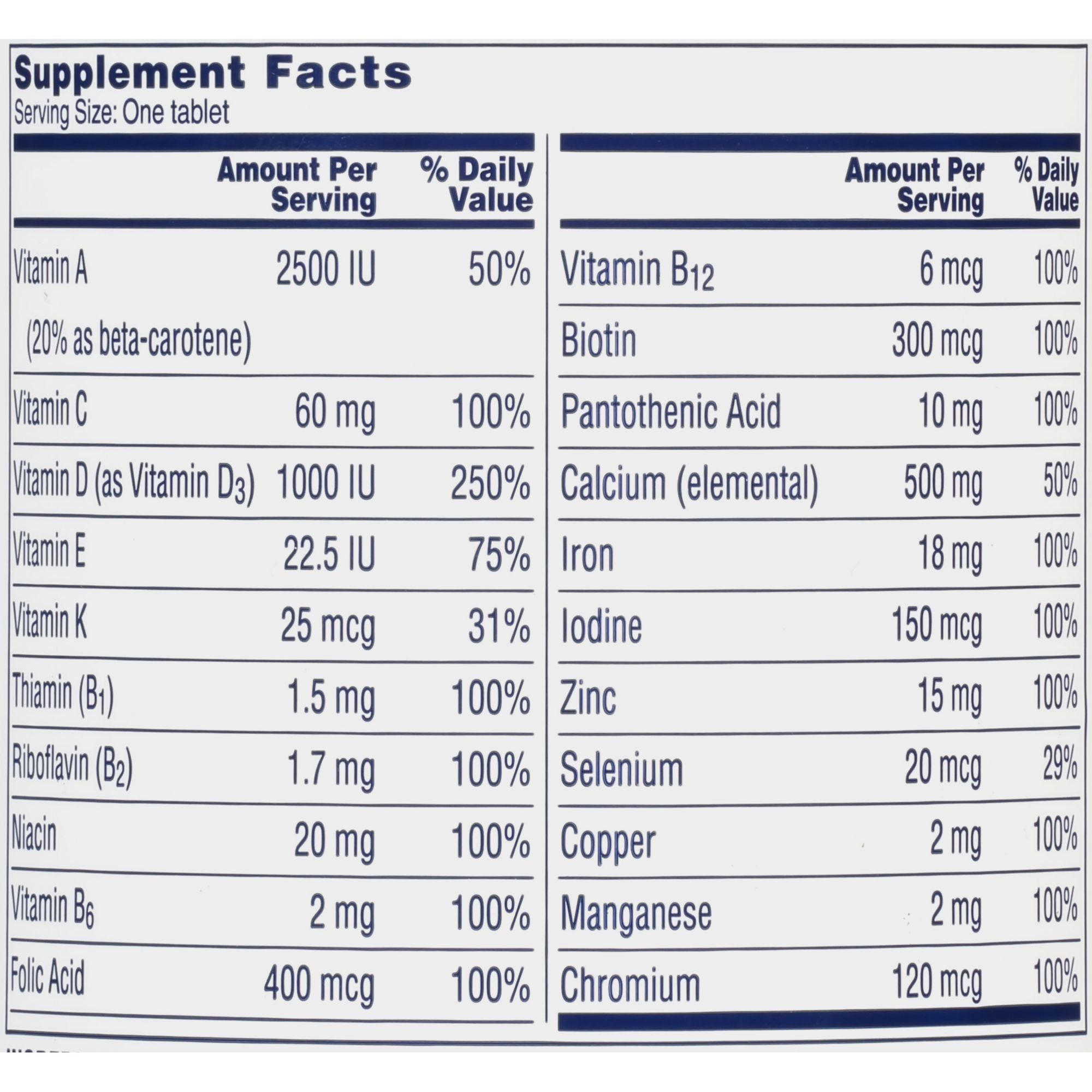 One A Day Women's Multivitamin offers a wide variety of key nutrients in a single tablet. One A Day Women's Multivitamin is ideal for women who are proactive about their health. This easy-to-take tablet contains vitamins A, B6, B12, C, D, E, and K as well as riboflavin, thiamin, niacin, folic acid, pantothenic acid, iodine, copper, biotin, iron, selenium, chromium, calcium, zinc and manganese. One A Day Women's Multivitamin is formulated to support* bone health, immune health, skin health, heart health** and physical energy by helping to convert food to fuel. One A Day Women's Daily Multivitamins are free of gluten, wheat, soy allergens, dairy, artificial flavors and artificial sweeteners. Adult women should take one tablet daily with food. Up to 90% of Americans fall short in getting key nutrients from food alone (vitamin A by 50%, vitamin C by 40%, vitamin D by 90%, vitamin E by 90% and calcium by 50%). One A Day Multivitamins can provide nutritional support that you and your family may need.