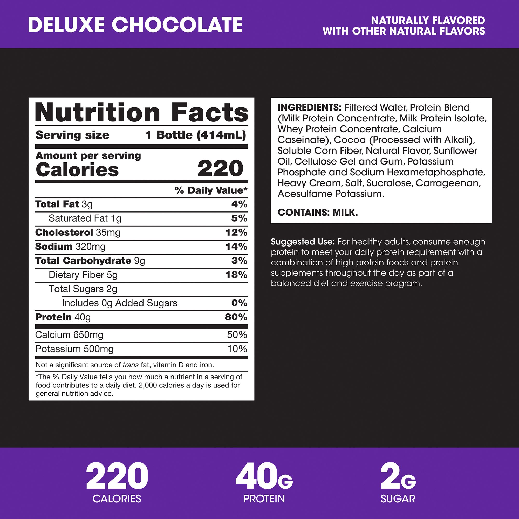 Ingredients: Filtered Water, Protein Blend (Milk Protein Concentrate, Milk Protein Isolate, Whey Protein Concentrate, Calcium Caseinate), Cocoa (Processed with Alkali), Soluble Corn Fiber, Natural Flavor, Sunflower Oil, Cellulose Gel and Gum, Potassium Phosphate and Sodium Hexametaphosphate, Heavy Cream, Salt, Sucralose, Carrageenan, Acesulfame Potassium. Contains: Milk.