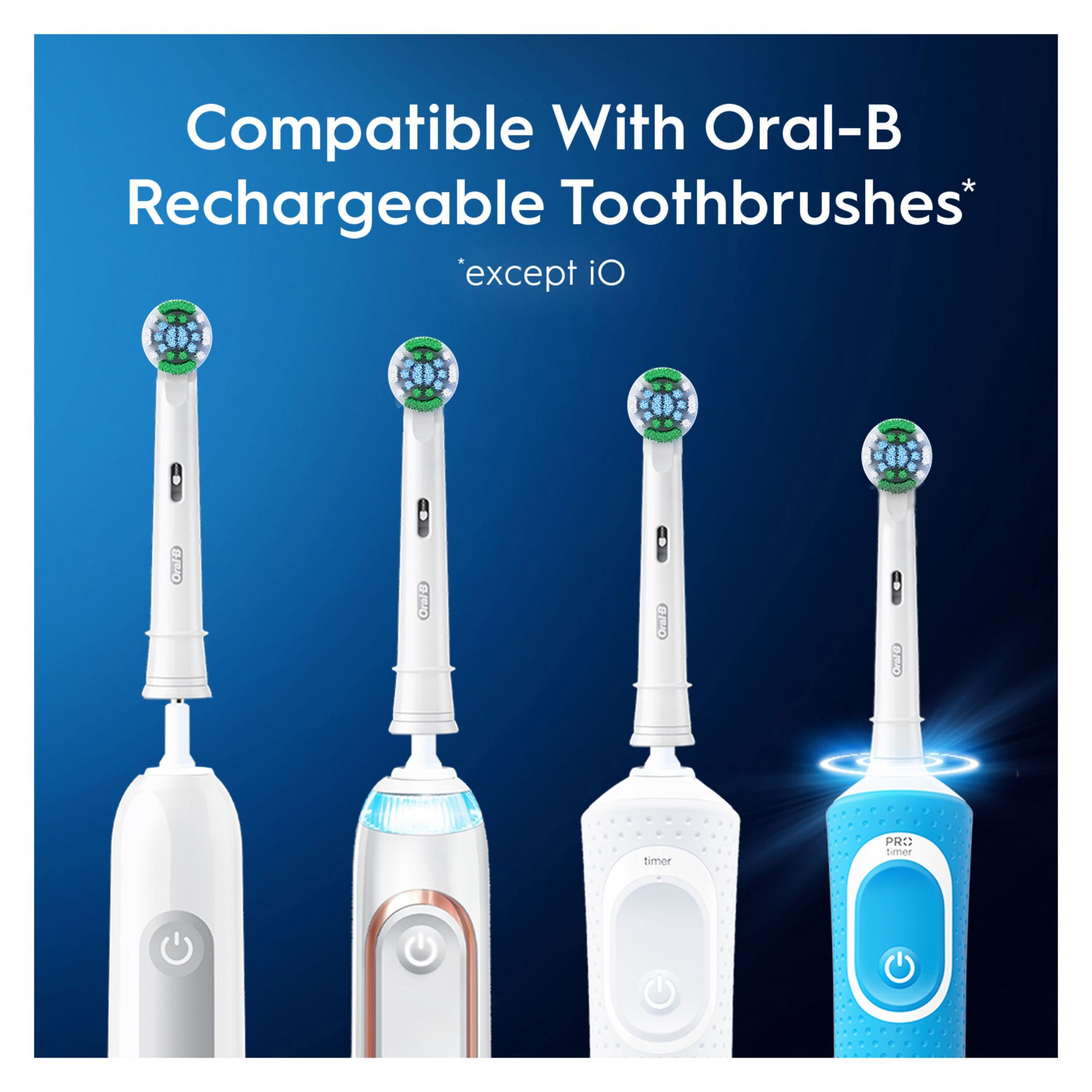 Compatible with all Oral-B rechargeable toothbrushes, except for Oral-B iO Toothbrushes