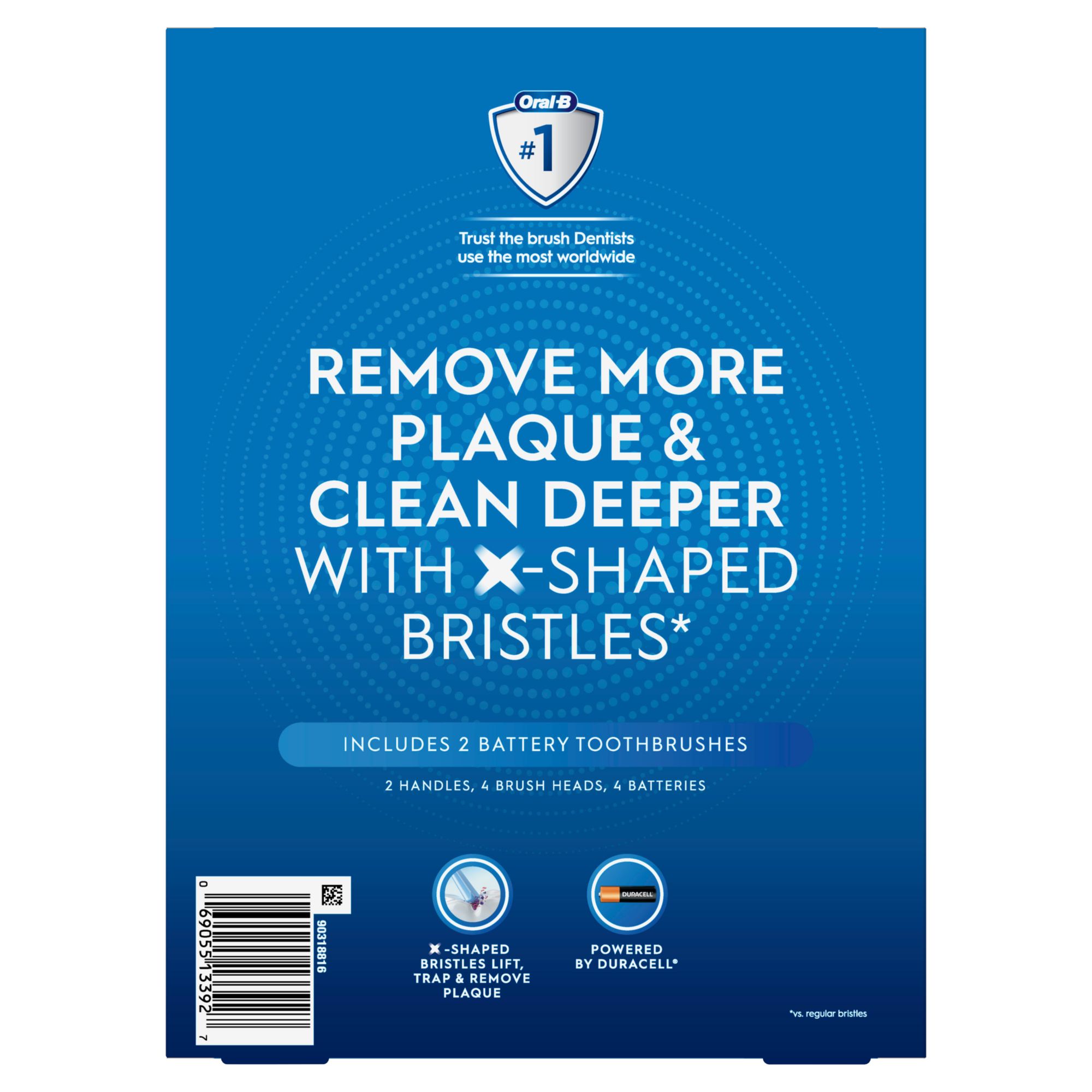 Power up for a better clean with the Oral-B Pro Advantage Battery-Powered Toothbrush. The Oral-B Pro Advantage Toothbrush's CrossAction bristles are perfectly angled to surround each tooth and remove plaque bacteria-even between teeth. To give you a consistent performance and superior clean, the Oral-B Pro Advantage was created with a ProCore battery that delivers an optimal performance with every use. This Oral-B battery-powered toothbrush was inspired by dental professional tools, the round shape of the brush head gives you an advanced clean with every use by surrounding each tooth for an individual tooth-by-tooth deep clean. To improve your oral health, the Oral-B toothbrush brushes away plaque and food particles from hard-to-reach places. This battery-powered toothbrush contains a 2-minute timer to ensure a complete clean after every brush, and it includes 2 handles, 4 replacement heads, and 4 AA batteries. This Oral-B battery-powered toothbrush is compatible with a variety of Oral-B replacement brush heads for every dental need. Oral-B Toothbrushes: Trust the brush dentists use most worldwide.*