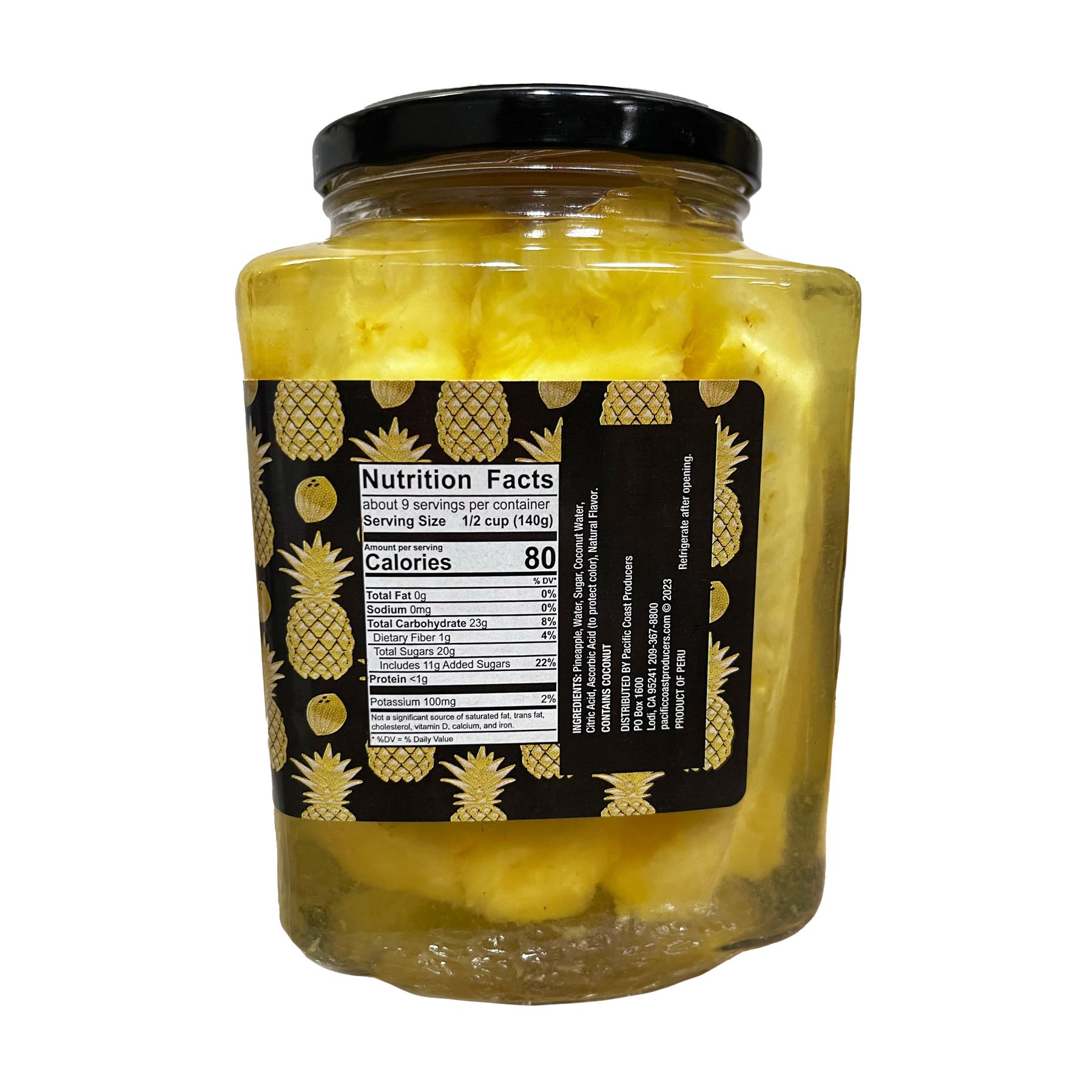 Ingredients: Pineapple, Water, Sugar, Coconut Water, Citric Acid, Ascorbic Acid (To Protect Color), Natural Flavor.