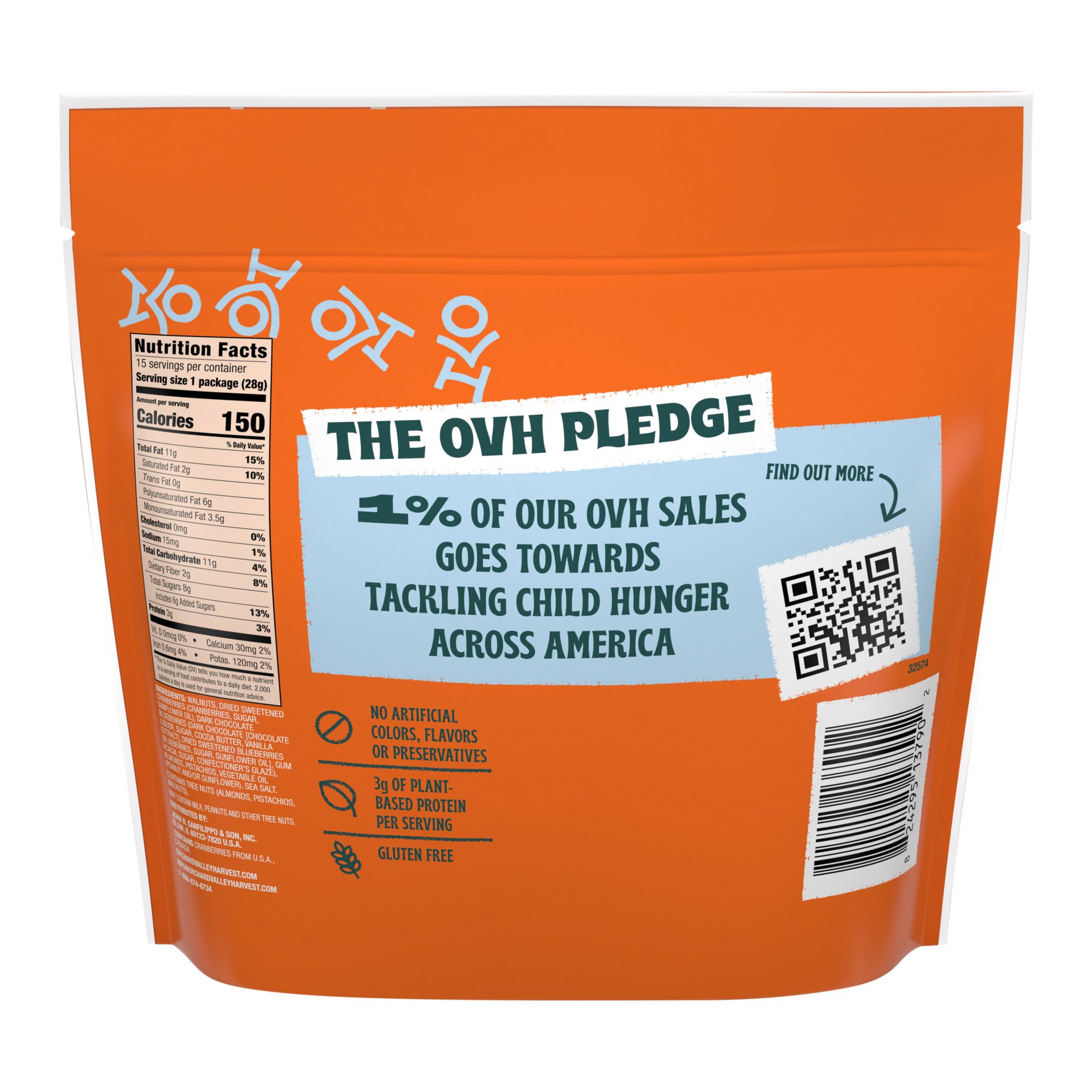 Real, wholesome goodness - OMG Omega-3 Mix contains an irresistible blend of walnuts, dark chocolate covered blueberries, sweetened cranberries, almond and pistachios, perfect for enjoying at home or on-the go, on your own or sharing with others. This crave-worthy mix presents the perfect balance of sweet and salty flavors, while also being an excellent source of ALA Omega-3 and boasting 3g of plant-based protein per serving. Moreover, it is gluten-free, making it a delicious and nutritious choice. Enjoy guilt-free, indulgence - Orchard Valley Harvest OMG Omega-3 Mix are gluten-free, Non-GMO Project verified, and free from artificial colors, flavors, and preservatives. Indulge in the snacks that give back - Orchard Valley Harvest is dedicated to helping stop food insecurity, committing one percent of OVH proceeds to tackle child hunger across America.