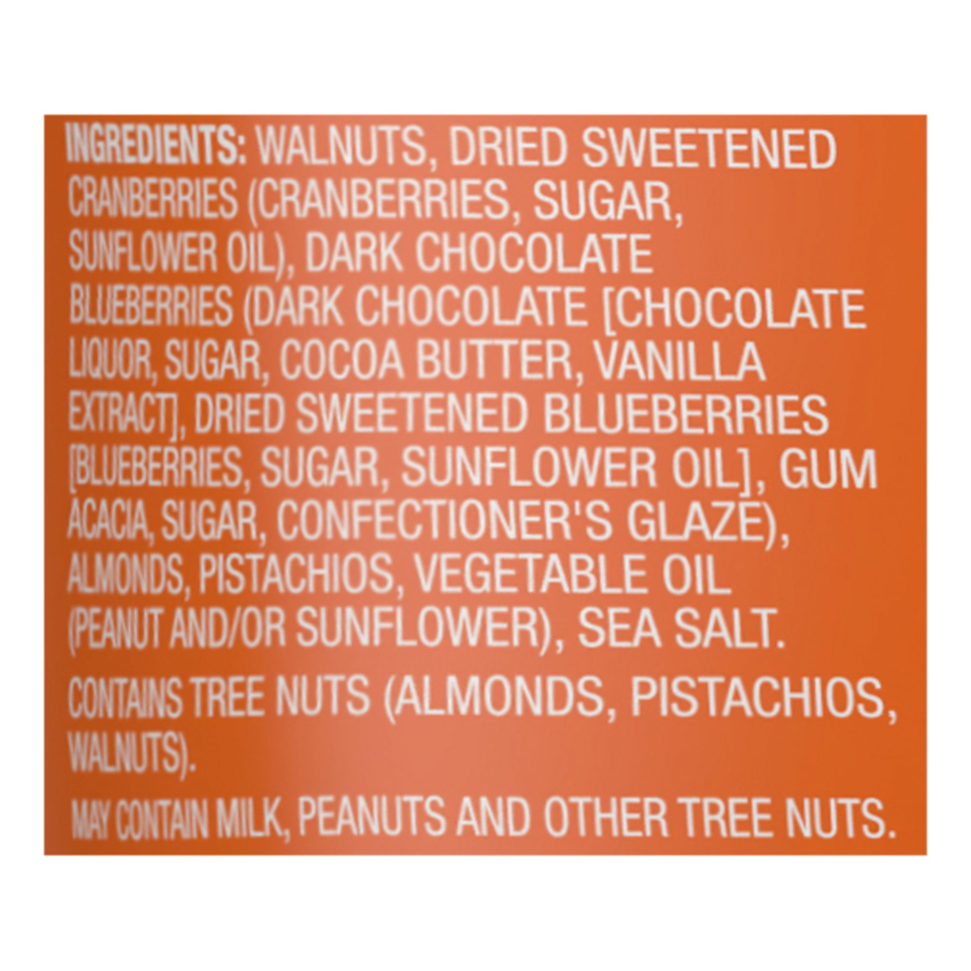 Ingredients: Walnuts, Dried Sweetened Cranberries(cranberries, Sugar, Sunflower Oil), Dark Chocolate Blueberries (Dark Chocolate[chocolate Liquor, Sugar,cocoa Butter, Vanilla Extract], Dried Sweetened Blueberries [Blueberries, Sugar, Sunflower Oil], Gum Acacia, Sugar, Confectioner's Glaze), Almonds, Pistachios, Vegetable Oil (Peanut And/or Sunflower), Sea Salt.