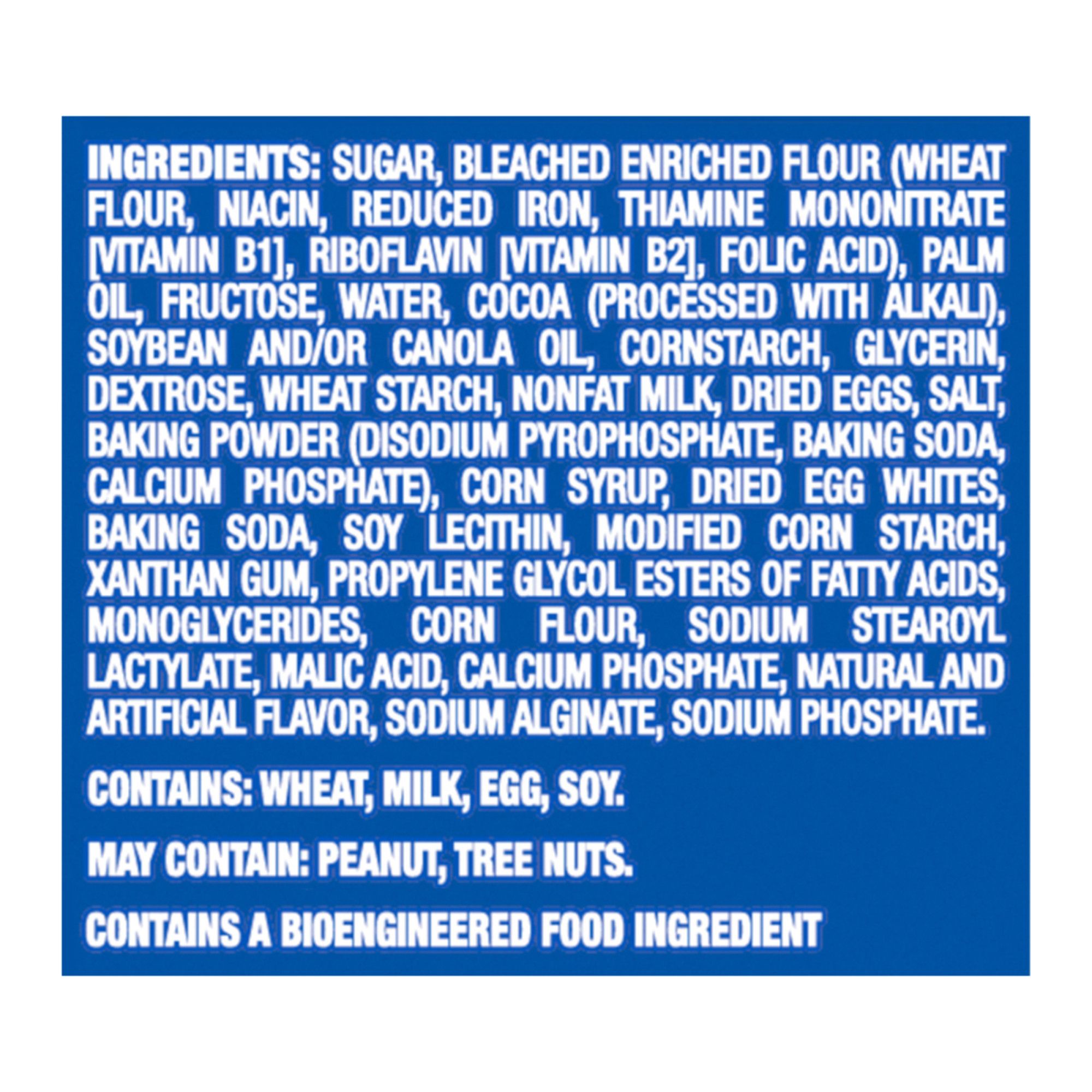 Ingredients: Sugar, Bleached Enriched Flour (Wheat Flour, Niacin, Reduced Iron, Thiamine Mononitrate [Vitamin B1], Riboflavin [Vitamin B2], Folic Acid), Palm Oil, Fructose, Cornstarch, Water, Cocoa (Processed With Alkali), Soybean And/or Canola Oil, Glycerin, Dextrose, Nonfat Milk, Dried Eggs, Salt, Baking Powder (Disodium Pyrophosphate, Baking Soda, Calcium Phosphate), Corn Syrup, Dried Egg Whites, Baking Soda, Soy Lecithin, Modified Corn Starch, Xanthan Gum, Propylene Glycol Esters Of Fatty Acids, Monoglycerides, Corn Flour, Sodium Stearoyl Lactylate, Malic Acid, Calcium Phosphate, Natural And Artificial Flavor, Sodium Alginate, Sodium Phosphate. Contains: Egg, Milk, Wheat, Soy. May Contain: Peanut, Tree Nuts.