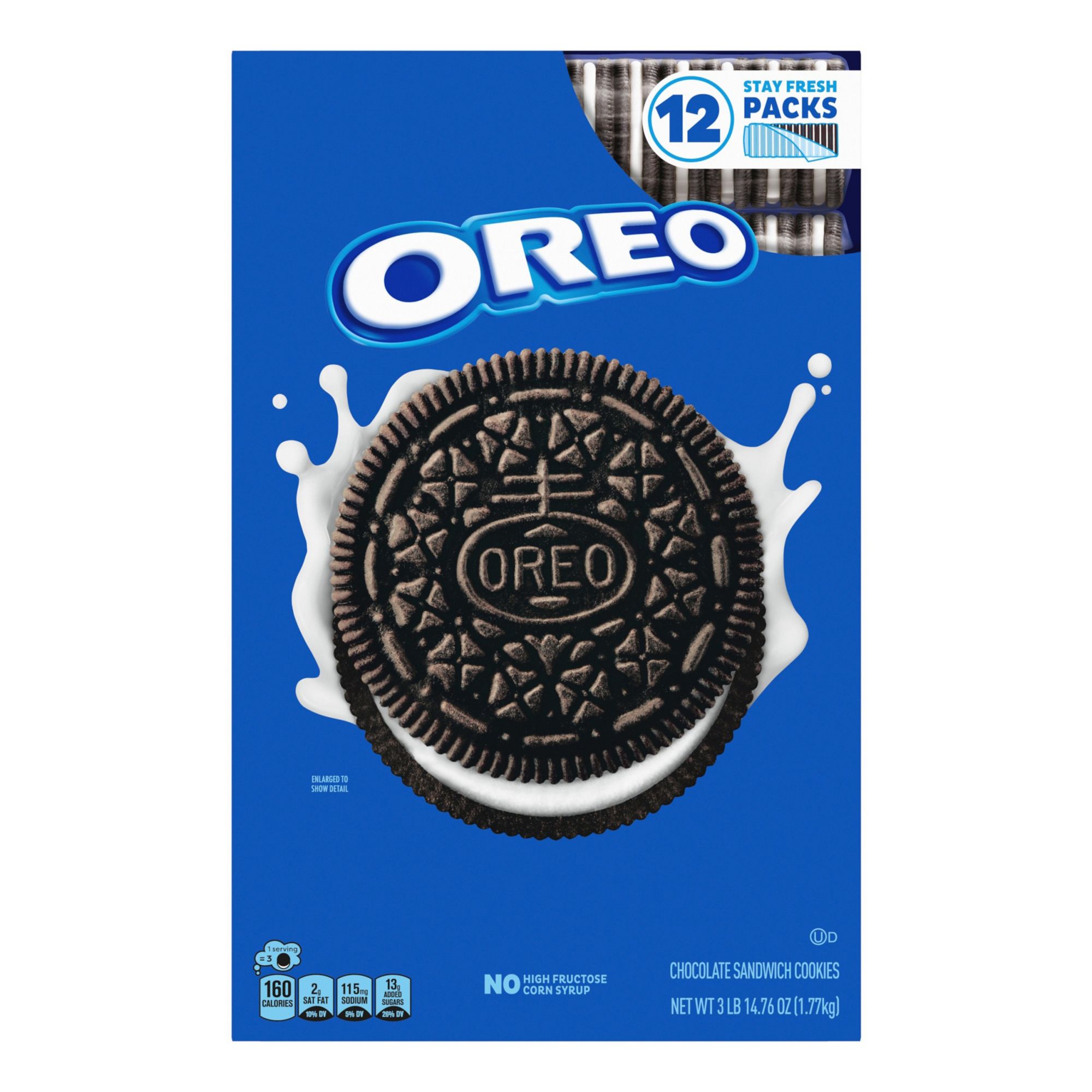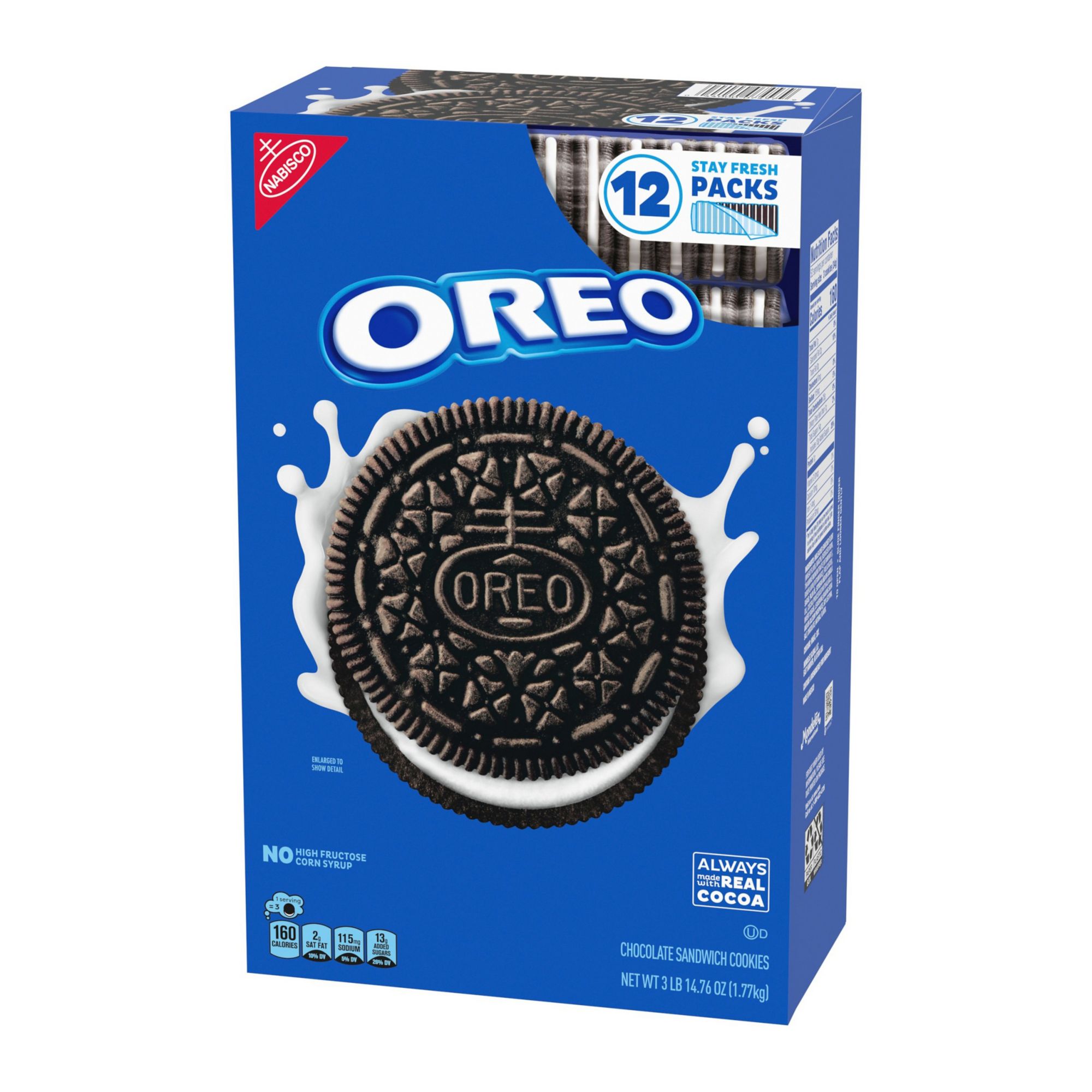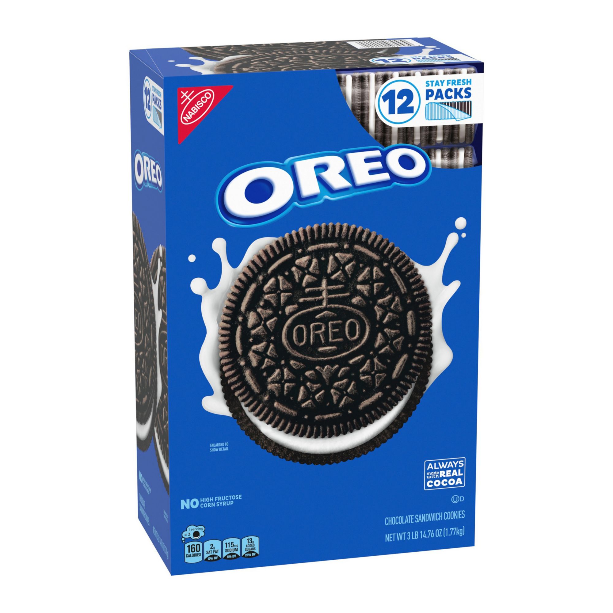 Take a delicious break with Oreo Chocolate Sandwich Cookies, America's favorite sandwich cookie for over 100 years. Supremely dunkable, Always made with real cocoa, Oreo cookies sandwich Oreo creme filling between two chocolate wafers--making them milk's favorite cookie. Although delicious enough alone, Oreo cookies are a great addition to your favorite desserts like cheesecake and brownies. Crush Oreo cookies as a fun ice cream topping or milkshake mix-in. If you like baking, try adding crushed Oreo cookies into cookie dough or on top of cupcakes. Need a recipe for a big crowd? Create themed Oreo Cookie Balls and decorate them for any holiday such as Christmas, Halloween, Valentine’s Day and Easter or any special occasion such as baby showers, birthday parties or sporting event. This large box of Oreo Cookies contains 62.76 ounces of cookies, providing plenty to hand out as treats at school functions, birthday parties, office gatherings or summer picnics. The durable box makes it easy to stack these bulk cookies among other bulk snacks in your home or office pantry or cabinet. Original Oreo chocolate cookies are packaged in 12 individually wrapped sleeves, that keep bulk cookies fresh and ready to share or use in recipes.