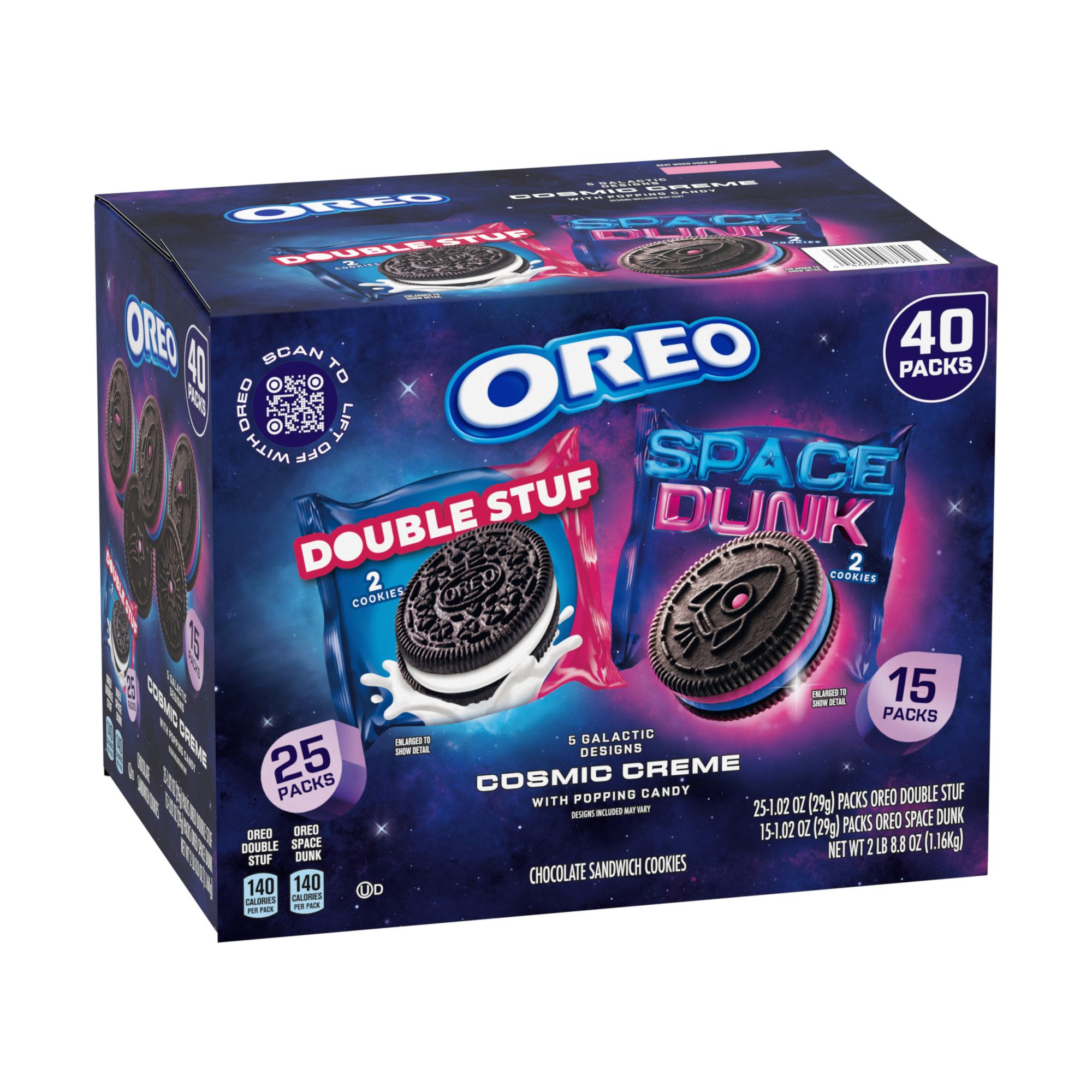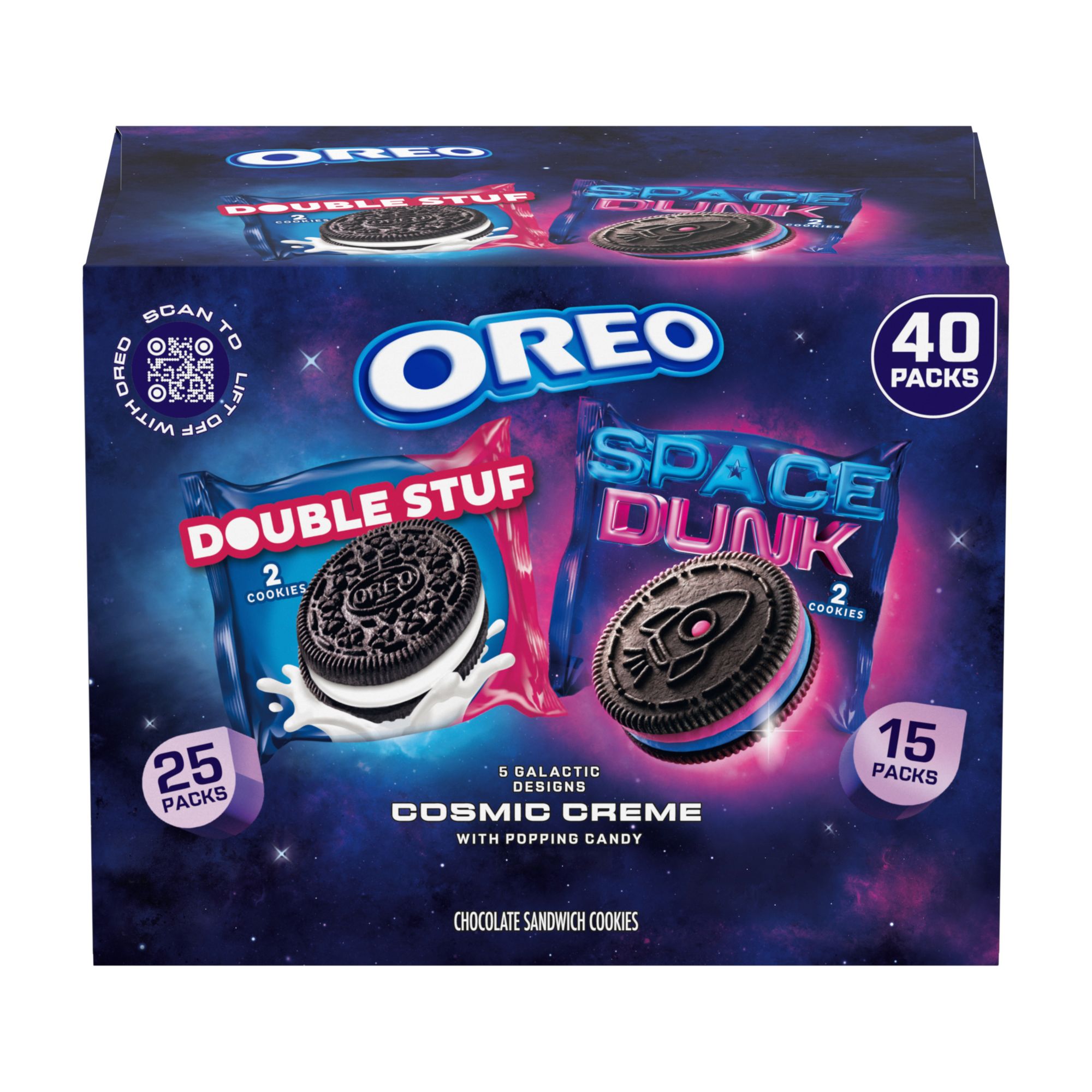 Lift off with Oreo and this limited edition Oreo Space Dunk and Double Stuf Chocolate Sandwich Cookie Variety Pack! This out-of-this-world variety pack includes forty total two-count Oreo cookie snack packs: 15 Space Dunk Oreo chocolate sandwich cookies and 25 Oreo Double Stuf chocolate sandwich cookies. Space Dunk Oreo cookies boldly go where no cookie has gone before, featuring signature chocolate wafer cookies filled with two layers of cosmic flavored creme with popping candy and decorated with five never-before-seen galactic cutout designs, including a Telescope, Astronaut, Stargaze, Shooting Star and Rocket. Wondering what Cosmic Creme tastes like? The pink and blue cosmic creme is marshmallow flavored. Oreo Double Stuf Chocolate Sandwich Cookies are supremely dunkable and delicious with a glass of ice-cold milk. This Oreo cookie variety pack is great for space-themed parties and Space birthday celebrations, and they’re stellar sweet treats during movie night or simply enjoying as home or office snacks. The individually wrapped bulk cookie packs keep these Certified Kosher cookies fresh and ready for snacking, sharing, or taking on the go for your next launch. Scan the QR code on the pack to lift off with Oreo. Explore the wonders of space and find that playfulness is out there!