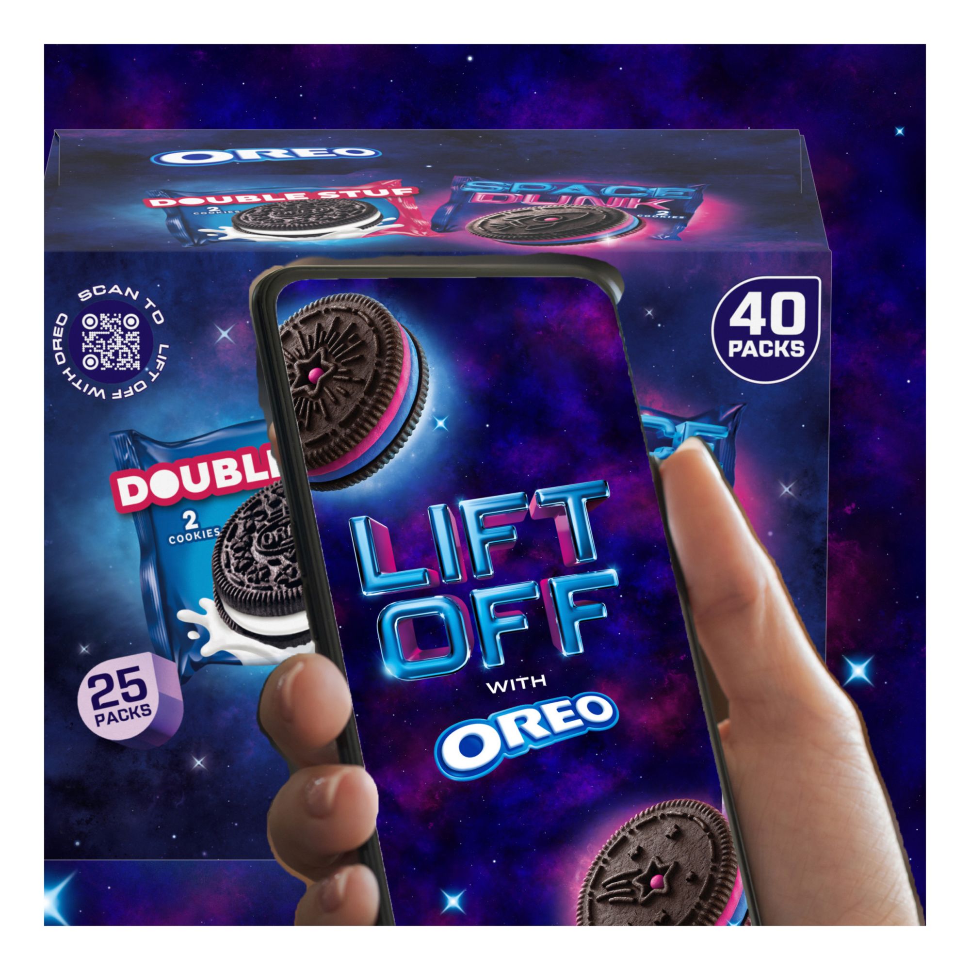Scan the QR code on pack to lift off with Oreo for a fun space adventure