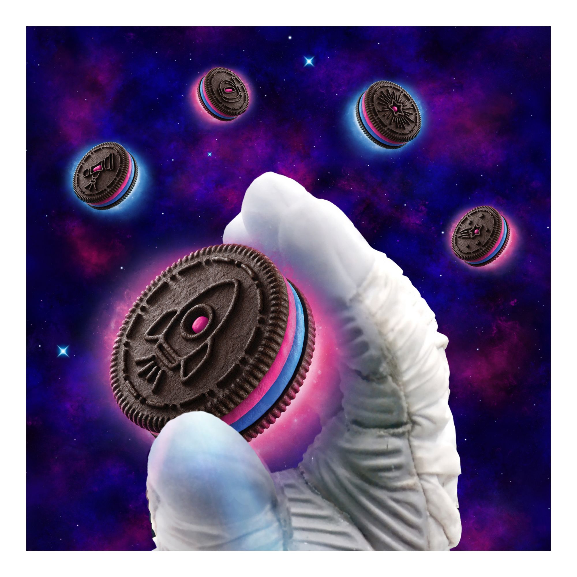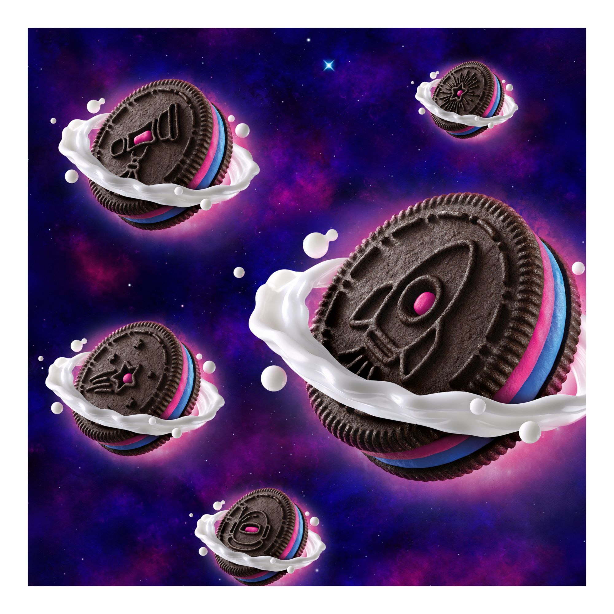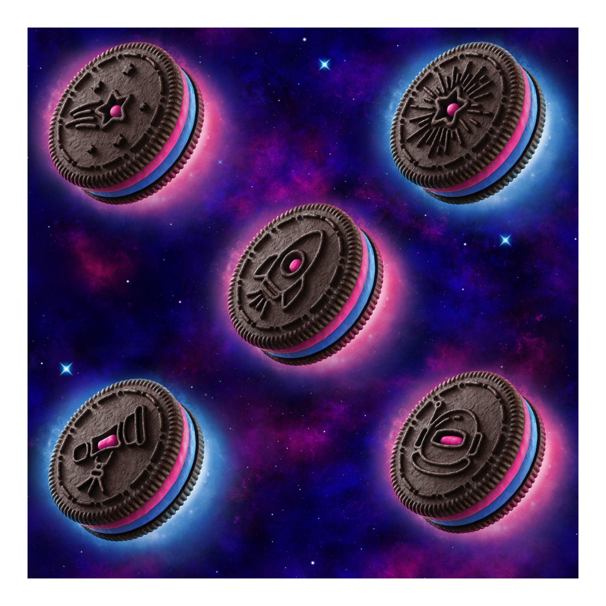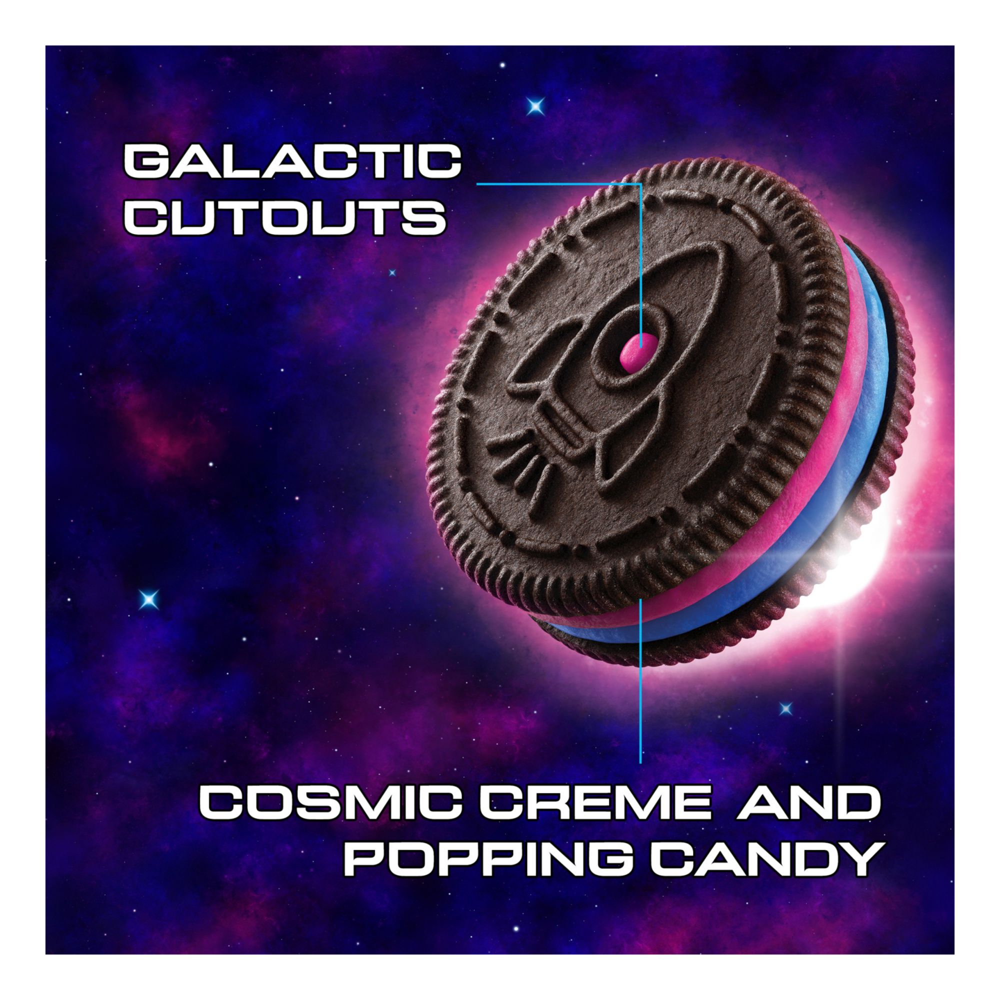 Oreo Space Dunk cookies are chocolate wafer cookies filled with Cosmic Creme with popping candy and galactic cutout designs