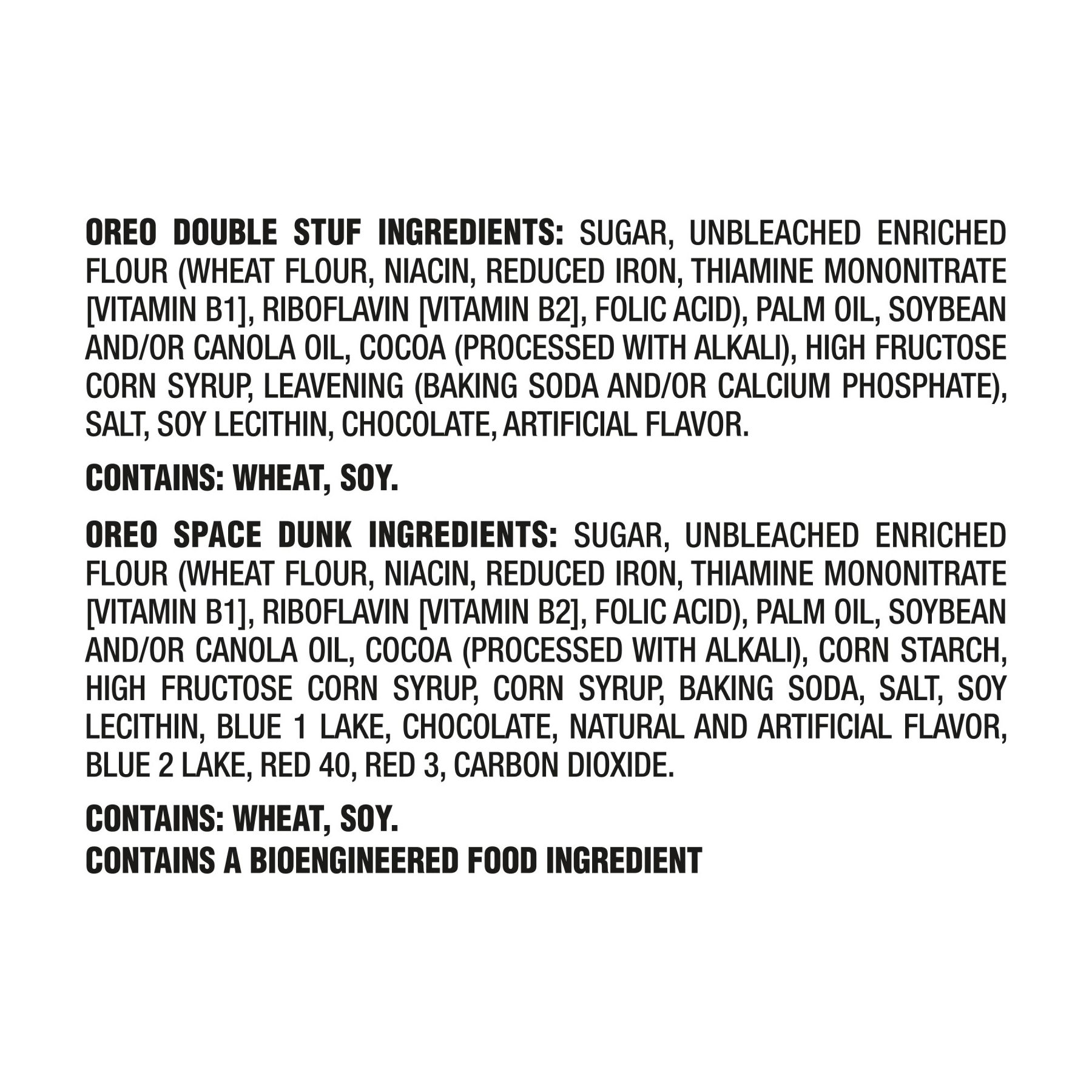 Ingredients: Oreo Chocolate Ingredients: Sugar, Unbleached Enriched Flour (Wheat Flour, Niacin, Reduced Iron, Thiamine Mononitrate [Vitamin B1], Riboflavin [Vitamin B2], Folic Acid), Palm Oil, Soybean And/or Canola Oil, Cocoa (Processed With Alkali), High Fructose Corn Syrup, Leavening (Baking Soda And/or Calcium Phosphate), Salt, Soy Lecithin, Chocolate, Artificial Flavor.contains: Wheat, Soy. Oreo Original Ingredients: Sugar, Unbleached Enriched Flour (Wheat Flour, Niacin, Reduced Iron, Thiamine Mononitrate [Vitamin B1], Riboflavin [Vitamin B2], Folic Acid), Palm Oil, Soybean And/or Canola Oil, Cocoa (Processed With Alkali), Corn Starch, High Fructose Corn Syrup, Corn Syrup, Baking Soda, Salt, Soy Lecithin, Blue 1 Lake, Chocolate, Natural And Artificial Flavor, Blue 2 Lake, Red 40, Red 3, Carbon Dioxide. Contains: Wheat, Soy.
