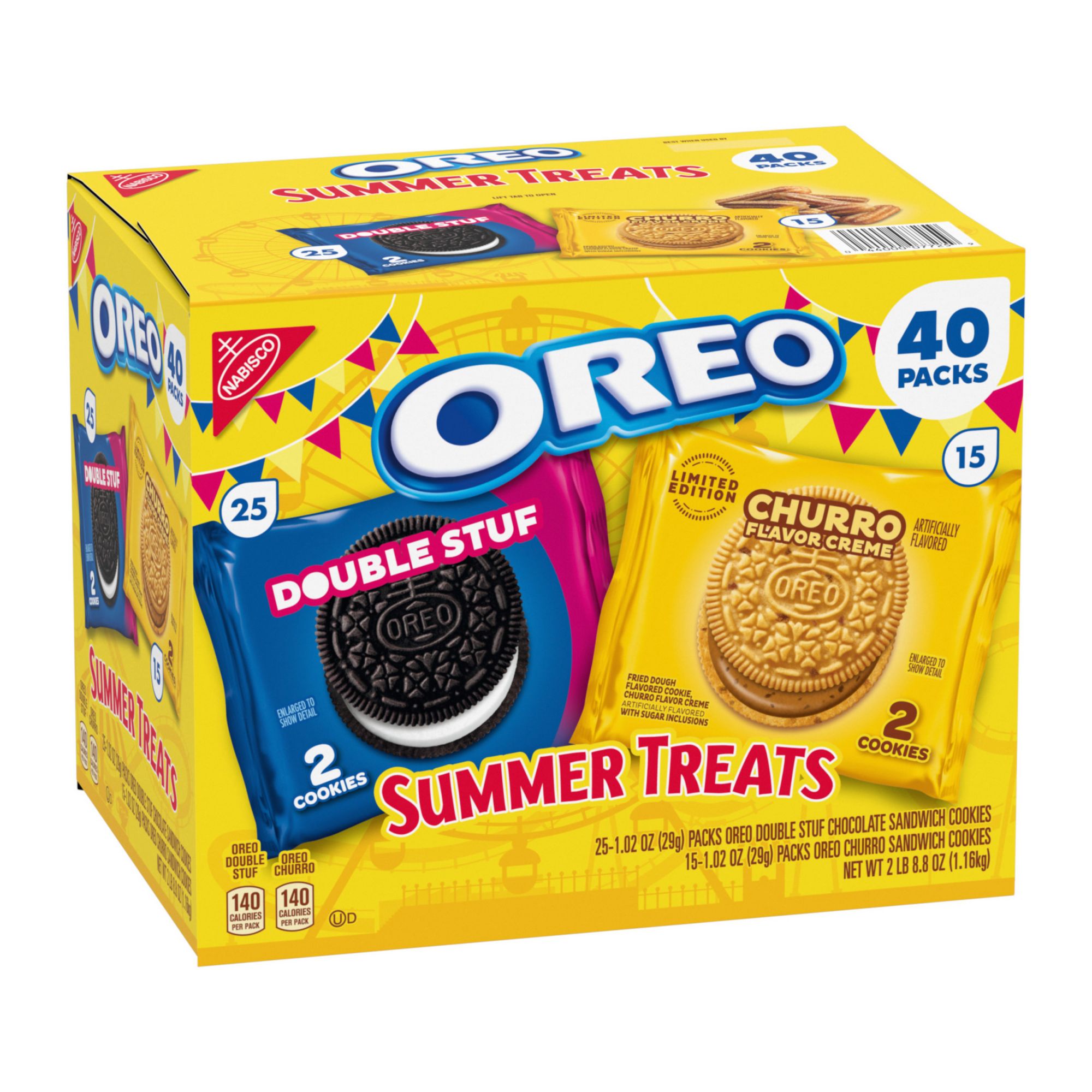This Summer Treats Oreo Sandwich Cookies Variety Pack includes a delicious duo of individually wrapped two-cookie snack packs with Oreo Double Stuf or Oreo Churro Flavor Creme sandwich cookies, offering two ways to add some sweetness to your everyday moments and summer celebrations. Oreo Double Stuf Chocolate Sandwich Cookies pair the classic Oreo chocolate wafer cookie with nearly 2x the amount of Oreo creme. Oreo Churro Sandwich Cookies are a deliciously sweet treat inspired by traditional cinnamon sugar churros. These limited edition snack cookies feature a unique fried dough-flavored wafer and churro-flavor creme with sugar inclusions, plus the signature Oreo cookie embossment. These tasty and fun snacks make wonderful birthday treats, July 4th party favors, or easy desserts for picnics and barbecues. Enjoy these sweet snacks on their own, with your midday meal as lunch snacks, or with milk or ice cream for an afternoon treat. Individually packaged with two Oreo cookies each for convenient, on-the-go portability, these kosher cookie snack packs are the ideal office snacks, travel snacks, and vending machine snacks. With this bulk cookies box of 40 cookie snack packs, including 25 Oreo Double Stuf and 15 Oreo Churro Flavor Creme Cookies, you'll be ready for any snacking occasion.