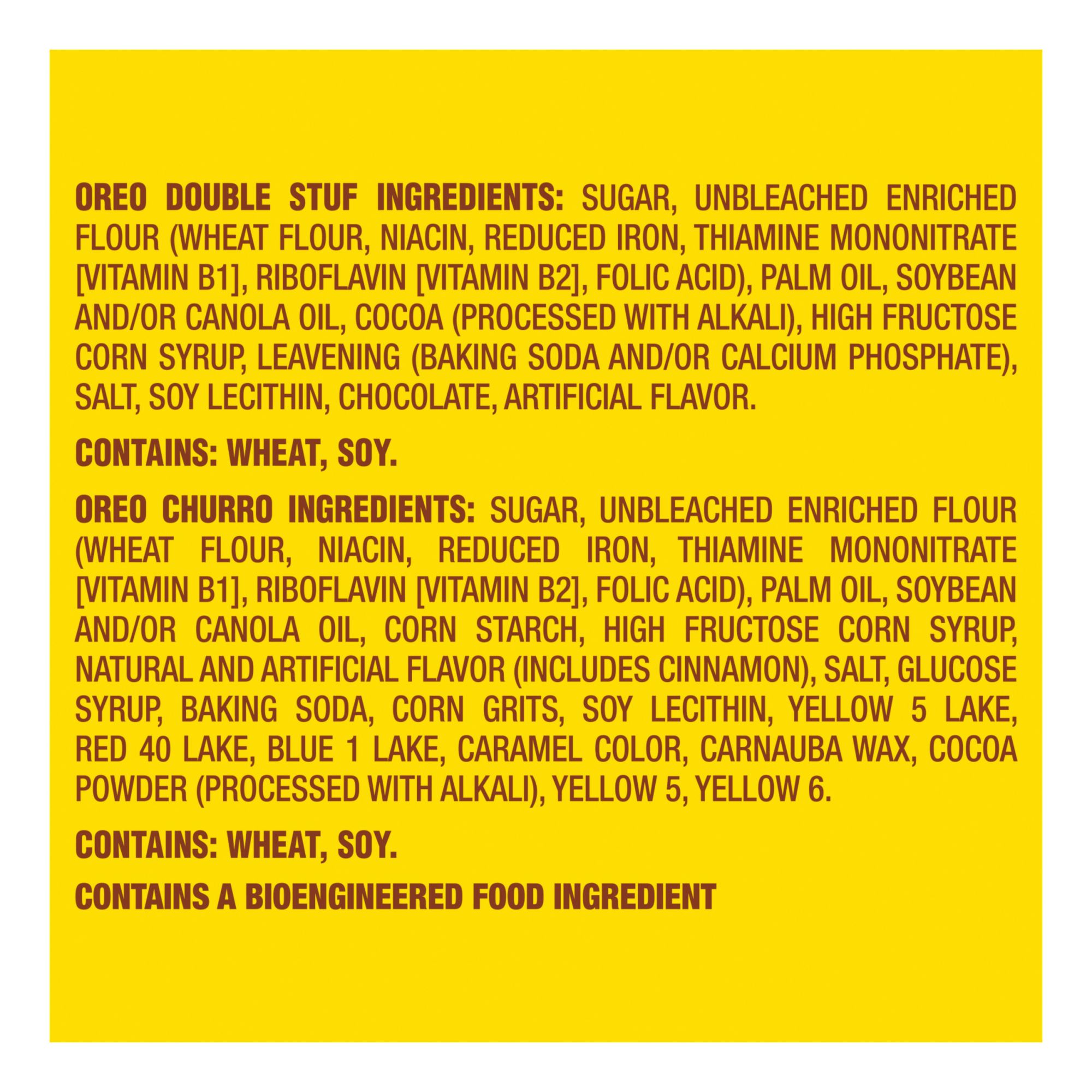 Ingredients: Oreo Chocolate Ingredients: Sugar, Unbleached Enriched Flour (Wheat Flour, Niacin, Reduced Iron, Thiamine Mononitrate [Vitamin B1], Riboflavin [Vitamin B2], Folic Acid), Palm Oil, Soybean And/or Canola Oil, Cocoa (Processed With Alkali), High Fructose Corn Syrup, Leavening (Baking Soda And/or Calcium Phosphate), Salt, Soy Lecithin, Chocolate, Artificial Flavor. Contains: Wheat, Soy. Oreo Cinnamon Ingredients: Sugar, Unbleached Enriched Flour (Wheat Flour, Niacin, Reduced Iron, Thiamine Mononitrate [Vitamin B1], Riboflavin [Vitamin B2], Folic Acid), Palm Oil, Soybean And/or Canola Oil, Corn Starch, High Fructose Corn Syrup, Natural And Artificial Flavor (Includes Cinnamon), Salt, Glucose Syrup, Baking Soda, Corn Grits, Soy Lecithin, Yellow 5 Lake, Red 40 Lake, Blue 1 Lake, Caramel Color, Carnauba Wax, Cocoa Powder (Processed With Alkali), Yellow 5, Yellow 6.contains: Wheat, Soy.