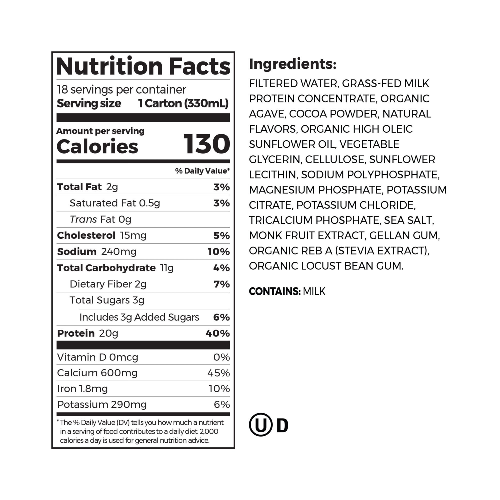 Ingredients: Filtered Water, Grass-Fed Milk Protein Concentrate, Organic Agave, Cocoa Powder, Natural Flavors, Organic High Oleic Sunflower Oil, Vegetable Glycerin, Cellulose, Sunflower Lecithin, Sodium Polyphosphate, Magnesium Phosphate, Potassium Citrate, Potassium Chloride, Tricalcium Phosphate, Sea Salt, Monk Fruit Extract, Gellan Gum, Organic Reb A (Stevia Extract), Organic Locust Bean Gum.