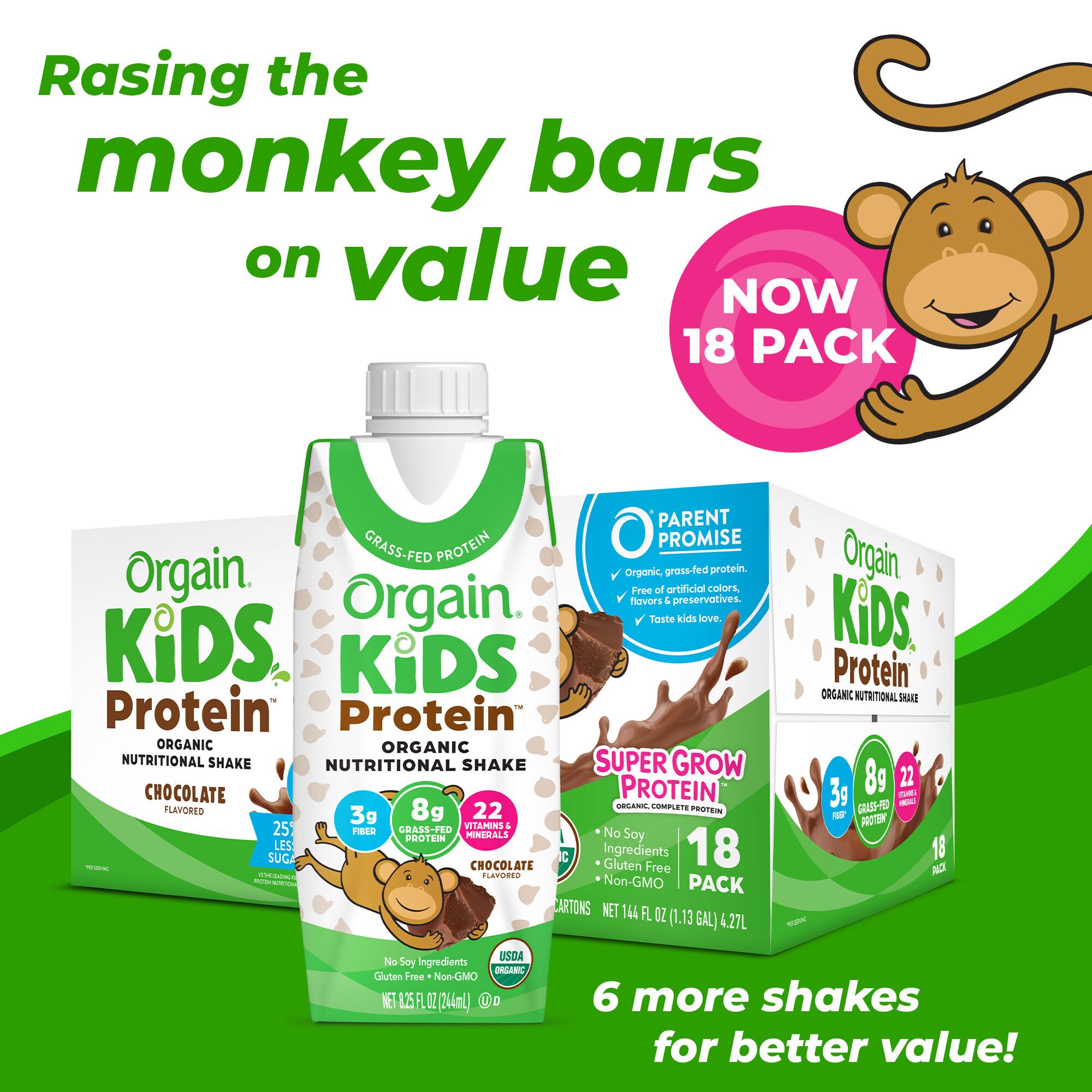 Raising the monkey bars on taste. When it comes to wholesome ingredients, we don’t monkey around. Here at Orgain, our Kids Organic Nutritional Shakes give kiddos the delicious taste they want with the nutrition they need, including 8 grams of Organic grass-fed milk protein, 22 vitamins and minerals and never any artificial colors, flavors, preservatives or sweeteners. This barrel of fun is crafted to be smooth and udderly creamy with kid-friendly flavors like Chocolate, Vanilla and Strawberry that even the pickiest of eaters will love. Our shakes have 25% less sugar vs other leading kids' high protein nutrition shakes*, so you can feel good about what you put into your kid’s body, without the fear of a sugar crash. Not to mention, because it’s from Orgain, everything is as clean as it gets, meaning each serving of Kids Organic Nutritional Shakes includes 10 Organic fruits and veggies and immunity boosting vitamins including Vitamins B12, C, D and Zinc, but is free from nuts, eggs, gluten and soy. These shakes are perfect for those hectic, on the go mornings, or as quick snacks to fuel up before and after activities. Good, clean, and all-in-one nutrition ready for you to take on the go, whenever and wherever you need it. So, what are you waiting for? Time to get your shake on!
