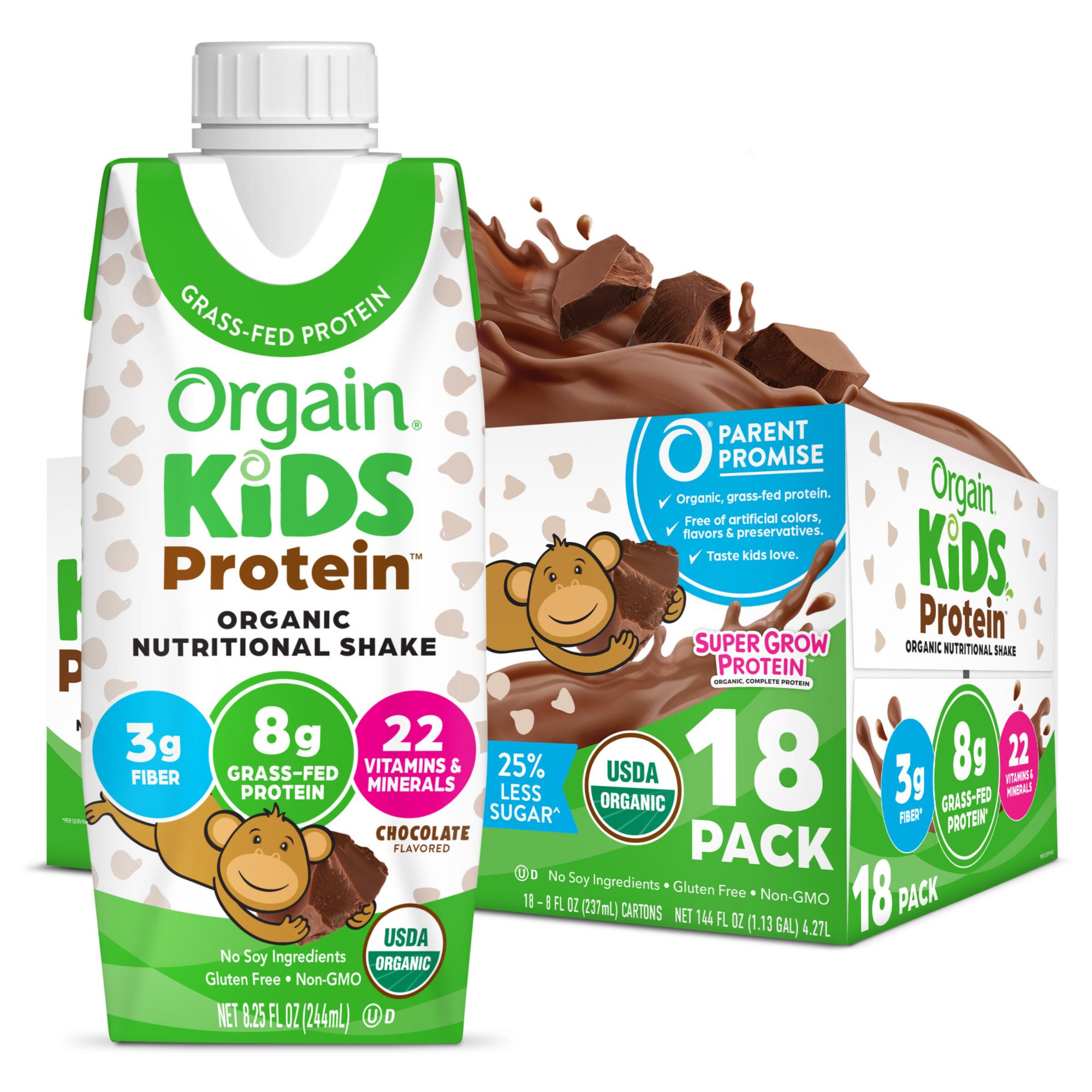 Orgain Kids Organic Grass Fed 8g Protein Nutritional Shake, Chocolate, 18 ct./8 fl. oz.