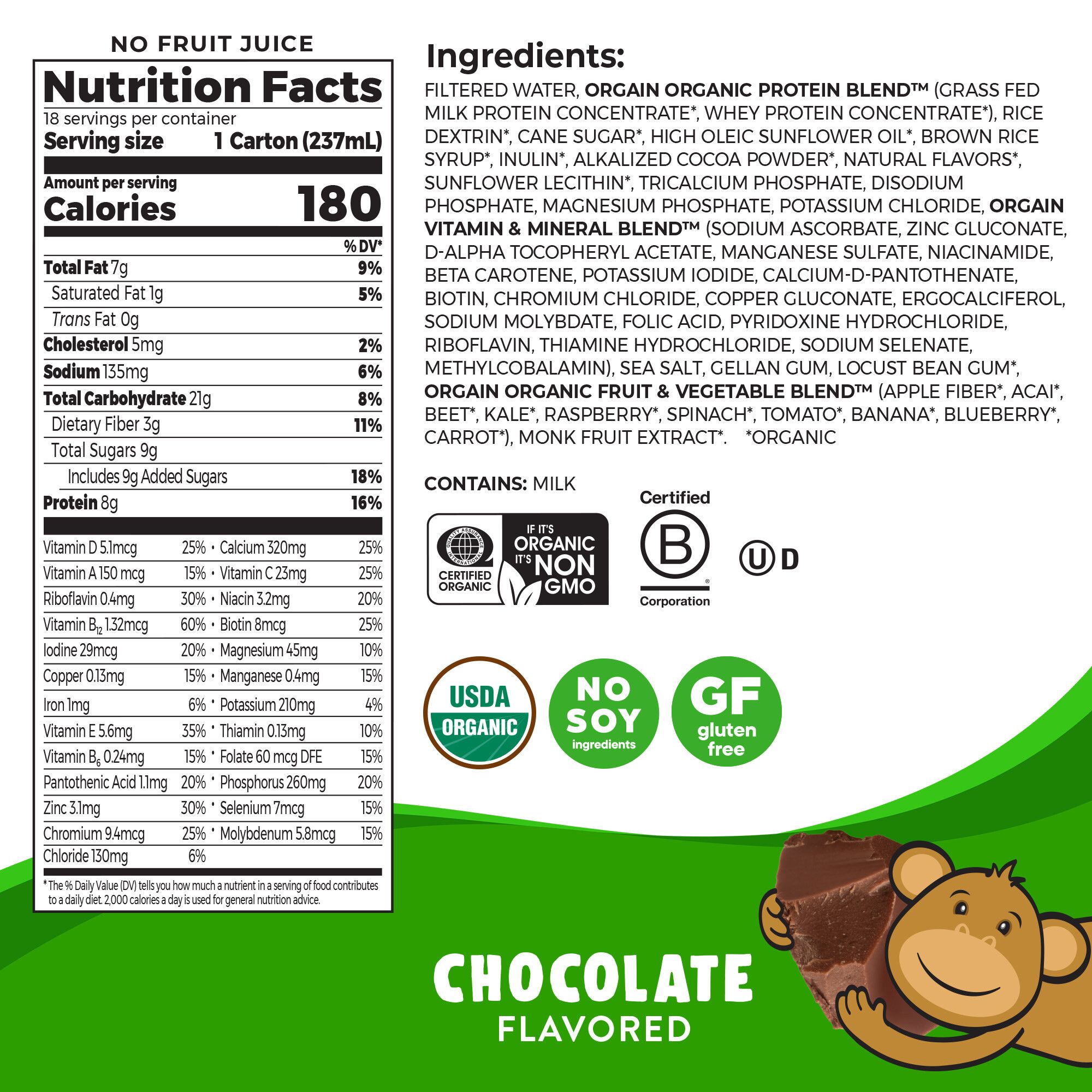 Ingredients: Filtered Water, Orgain Organic Protein Blend™ (Grass Fed Milk Protein Concentrate*, Whey Protein Concentrate*), Rice Dextrin*, Cane Sugar*, High Oleic Sunflower Oil*, Brown Rice Syrup*, Inulin*, Alkalized Cocoa Powder*, Natural Flavors*, Sunflower Lecithin*, Tricalcium Phosphate, Disodium Phosphate, Magnesium Phosphate, Potassium Chloride, Orgain Vitamin & Mineral Blend™ (Sodium Ascorbate, Zinc Gluconate, D-Alpha Tocopheryl Acetate, Manganese Sulfate, Niacinamide, Beta Carotene, Potassium Iodide, Calcium-D-Pantothenate, Biotin, Chromium Chloride, Copper Gluconate, Ergocalciferol, Sodium Molybdate, Folic Acid, Pyridoxine Hydrochloride, Riboflavin, Thiamine Hydrochloride, Sodium Selenate, Methylcobalamin), Sea Salt, Gellan Gum, Locust Bean Gum*, Orgain Organic Fruit & Vegetable Blend™ (Apple Fiber*, Acai*, Beet*, Kale*, Raspberry*, Spinach*, Tomato*, Banana*, Blueberry*, Carrot*), Monk Fruit Extract*. *Organic