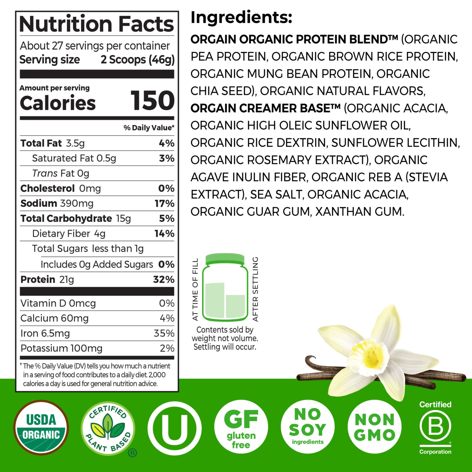 What makes this the #1 plant protein powder brand in the U.S.^? Is it the smooth and creamy flavor? The delicious taste without the grit? The fact that it serves up 21 grams* of organic, vegan protein? Or that it's so easy to prepare? Truthfully, it's all of this and so much more. Our protein blend consists of organic peas, brown rice, mung bean, and chia seeds, to provide a complete protein with all nine essential amino acids. Not only does our plant-based protein powder serve up the tastiest, creamiest protein, but it's also made with clean ingredients and higher standards in mind! Enjoy a protein powder that's certified USDA organic, non-GMO, and made without soy, dairy, gluten, or artificial preservatives, sweeteners or flavors. On top of all of that, it boasts 4g* prebiotic + fiber, and 1g of sugar*, and has 150 calories.* Plus, when it comes to flavor and versatility, this powder delivers. Mix our plant-based protein powders with your favorite smoothies, almond or oat milk, and even baking mixes to add a good, clean boost. At Orgain we celebrate taste, and we take it seriously because we recognize that part of living a vibrant life is loving what you eat. Go ahead, fuel up with the powder that's a treat for both your taste buds and your body so you can have energy to keep on going!^Source: In the U.S., Circana data latest 52 weeks ending 07.13.2025 *per serving