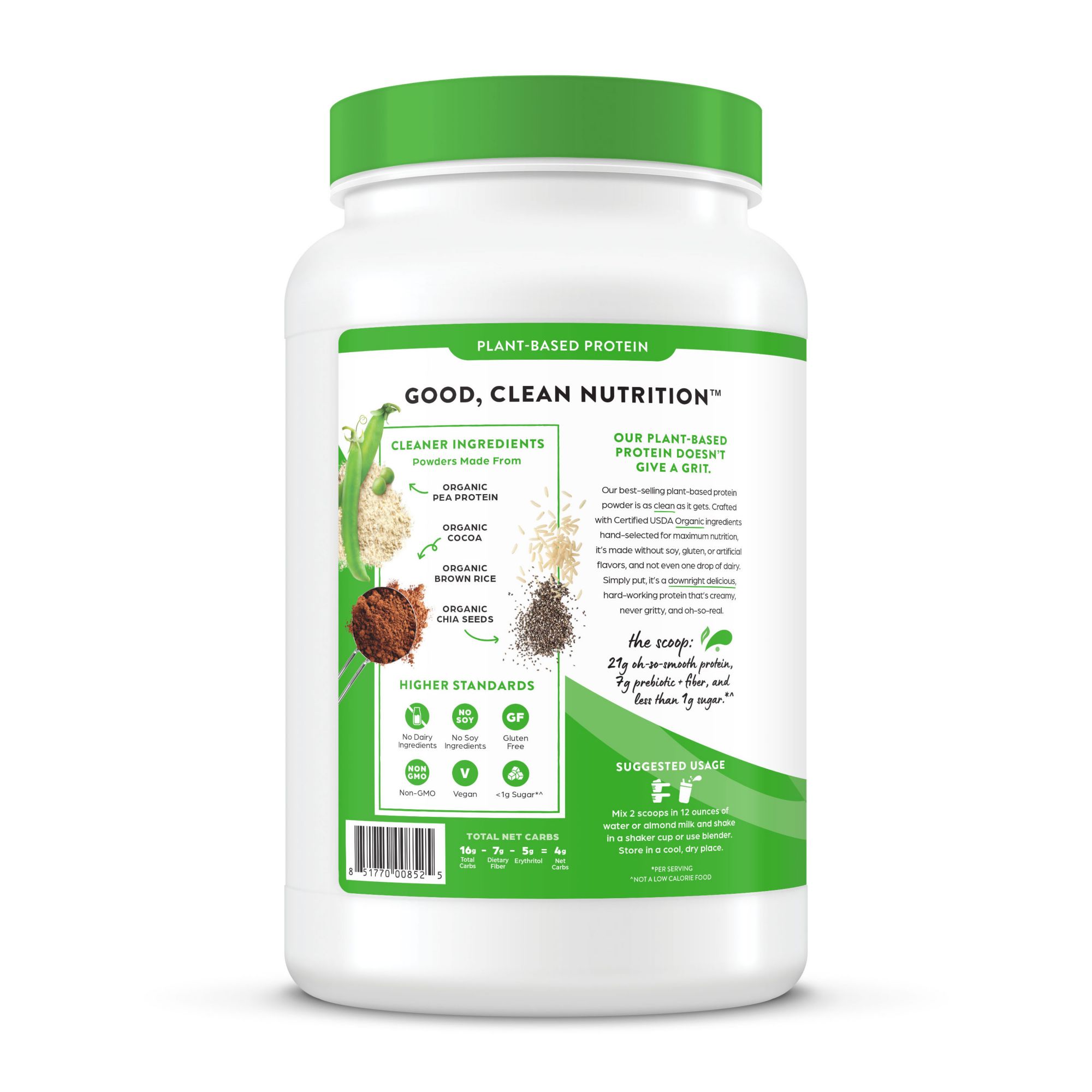 Cleaner ingredients: 21g plant protein and 0g sugar per serving. Our protein blend consists of organic peas, brown rice, and chia seeds, to provide a complete protein with all nine essential amino acids. It also features 7g of prebiotic + fiber* for gut support.