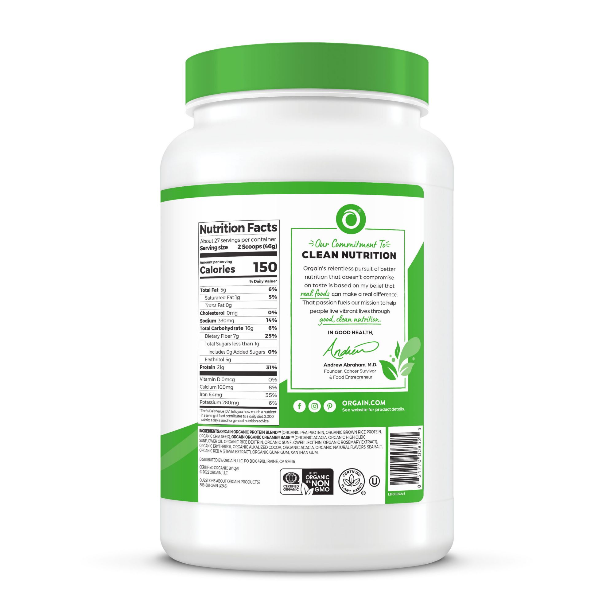 Ingredients: Orgain Organic Protein Blend™ (Organic Pea Protein, Organic Brown Rice Protein, Organic Mung Bean Protein, Organic Chia Seed), Orgain Creamer Base™ (Organic Acacia, Organic High Oleic Sunflower Oil, Organic Rice Dextrin, Sunflower Lecithin, Organic Rosemary Extract), Organic Alkalized Cocoa, Organic Natural Flavors, Organic Agave Inulin Fiber, Organic Reb A (Stevia Extract), Sea Salt, Organic Acacia, Organic Guar Gum, Xanthan Gum.