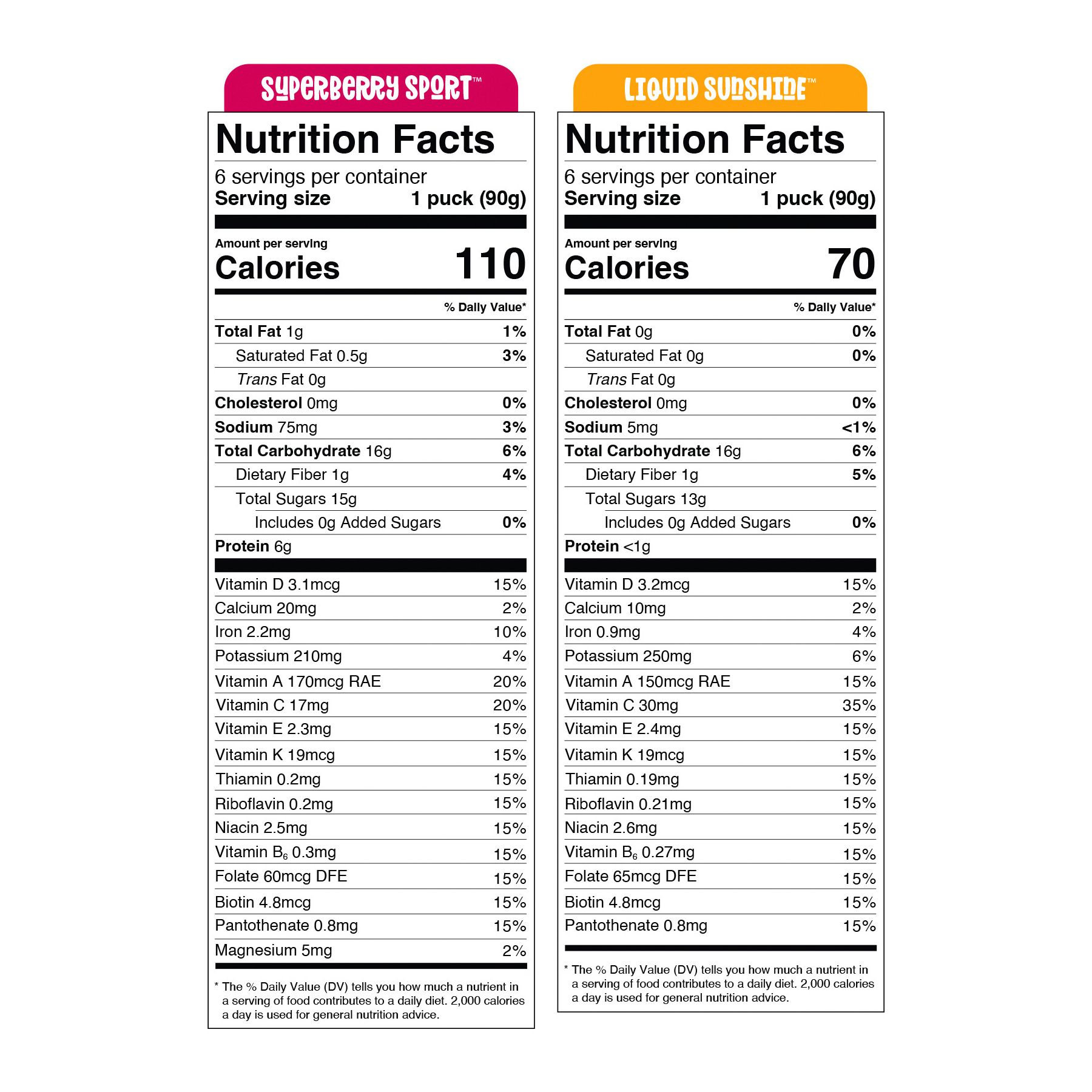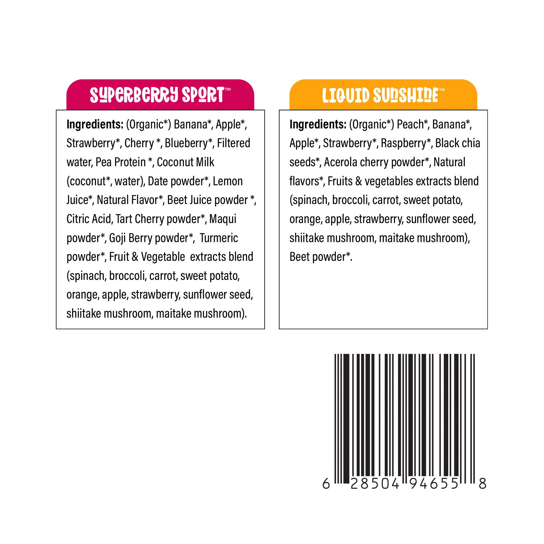 Ingredients Superberry Sport Ingredients: (Organic*) Banana, Apple*, Strawberry*, Cherry*, Blueberry*, Filtered Water, Pea Protein*, Coconut Milk (Coconut*, Water), Date Powder *, Lemon Juice* Natural Flavor*, Beet Juice Powder*, Citric Acid, Tart Cherry Powder*, Maqui Powder*, Goji Berry Powder*, Tumeric Powder*, Fruit & Vegetable Extract Blend (Spinach, Broccoli, Carrot, Sweet Potato, Orange, Apple, Strawberry, Sunflower Seed, Shitake Mushroom, Maitake Mushroom) *Organic Ingredients Liquid Sunshine Ingredients: (Organic*) Peach*, Banana*, Apple*, Strawberry*, Raspberry*, Black Chia Seeds*, Acerola Cherry Powder*, Natural Flavors*, Fruits & Vegetables Extracts Blend (Spinach, Broccoli, Carrot, Sweet Potato, Orange, Apple, Strawberry, Sunflower Seed, Shiitake Mush-Room, Maitake Mushroom), Beet Powder*.