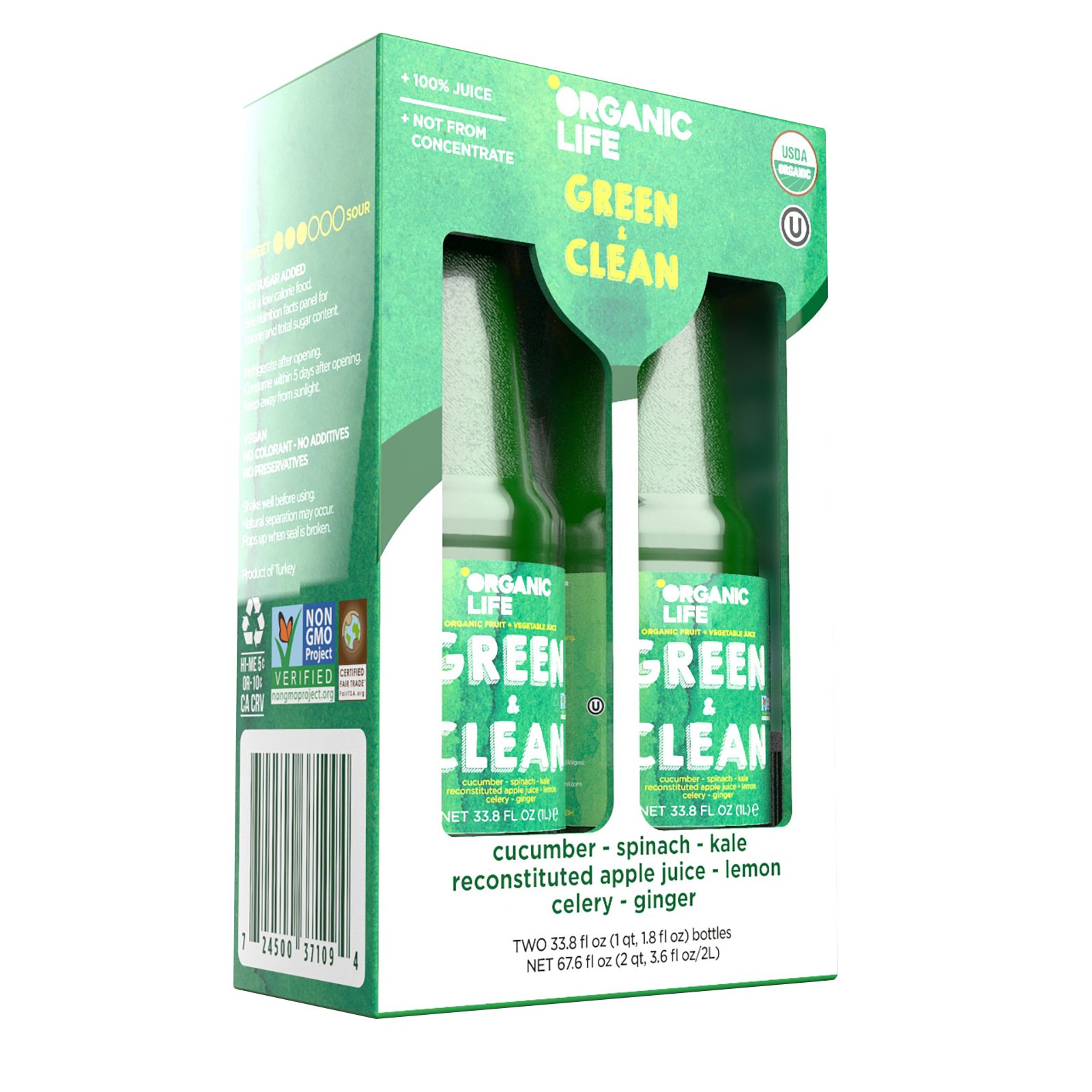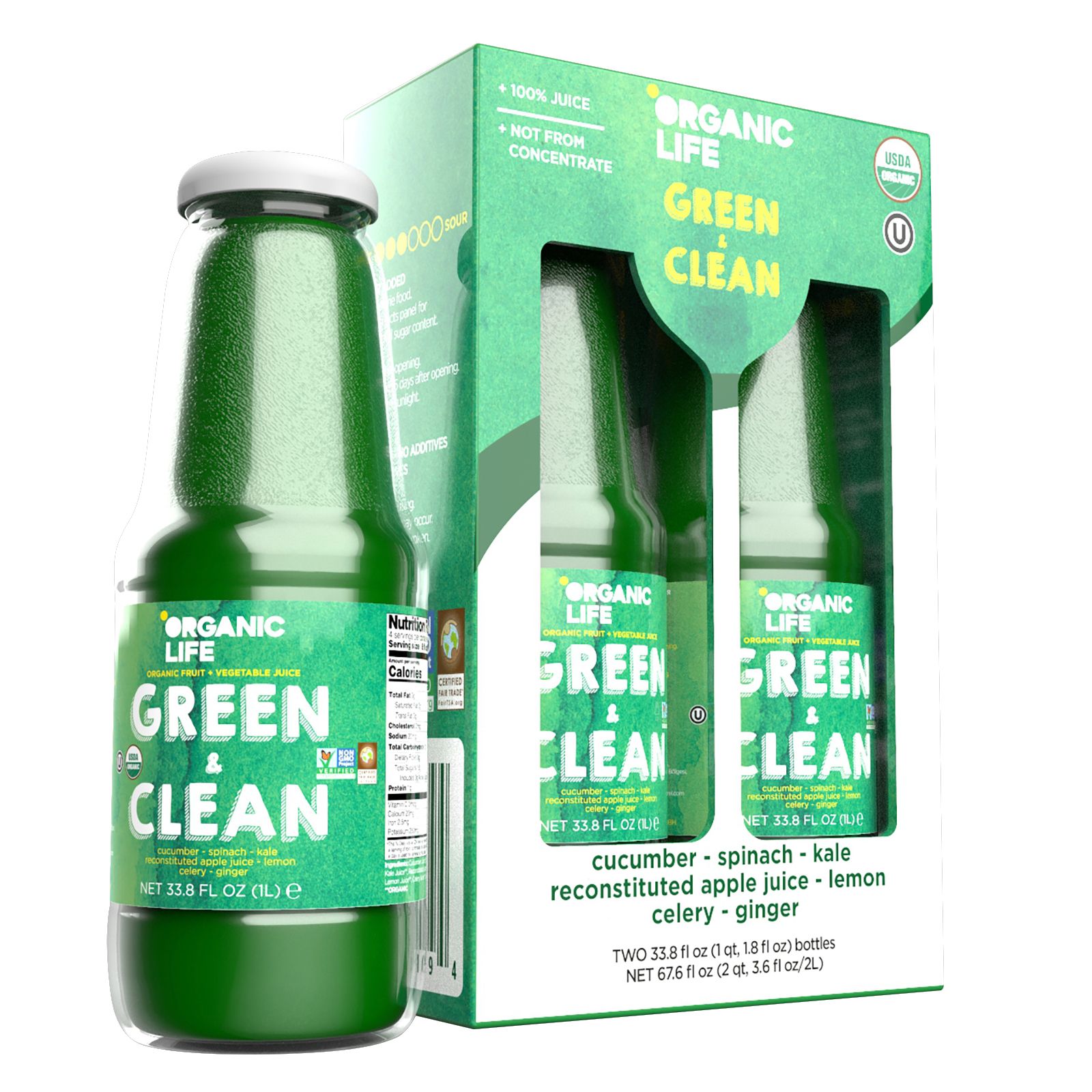 Organic Life Green & Clean is a 100% juice with no sugar added. Made from blending all your favorite greens like kale and spinach which are sweetened with a hint of apple juice. It is a superfood-powered punch. Organic Life Green & Clean organic, non-GMO, Kosher, and Vegan. It is the perfect blend of sweet and sour to start your day off strong.