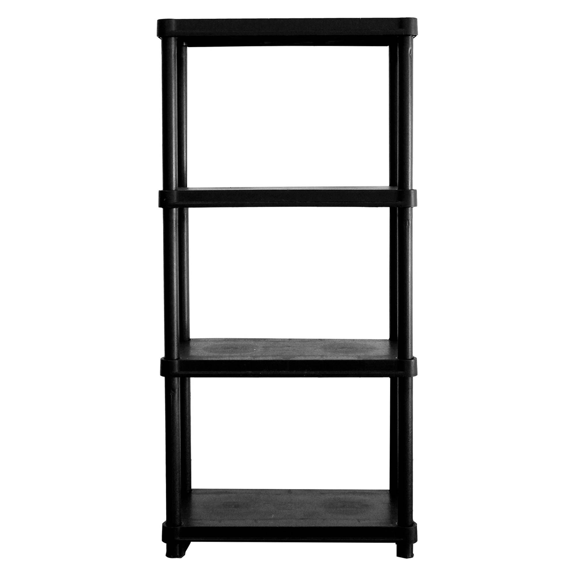 Four-tier shelving system For small to medium size items Assembles in just minutes No tools required Easy to clean Holds up to 55 lbs. per shelf, evenly distributed Includes 4-Tier 12" x 24" Resin Shelving System