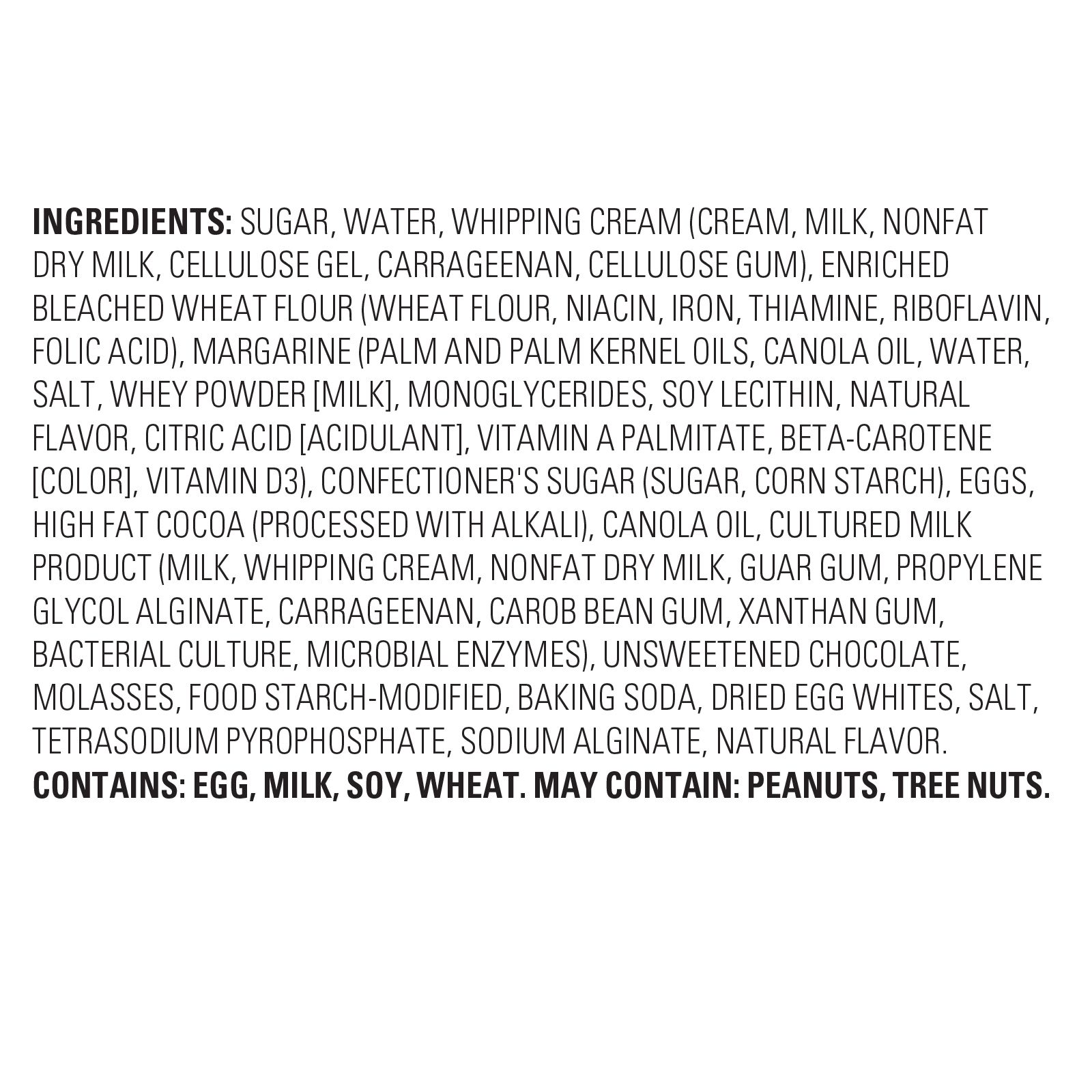 Ingredients: Sugar, Water, Whipping Cream (Cream, Milk, Nonfat Dry Milk, Cellulose Gel, Carrageenan, Cellulose Gum), Enriched Bleached Wheat Flour (Wheat Flour, Niacin, Iron, Thiamine, Riboflavin, Folic Acid), Margarine (Palm And Palm Kernel Oils, Canola Oil, Water, Salt, Whey Powder [milk], Monoglycerides, Soy Lecithin, Natural Flavor, Citric Acid [acidulant], Vitamin A Palmitate, Beta-carotene [color], Vitamin D3), Confectioner's Sugar (Sugar, Corn Starch), Eggs, High Fat Cocoa (Processed With Alkali), Canola Oil, Cultured Milk Product (Milk, Whipping Cream, Nonfat Dry Milk, Guar Gum, Propylene Glycol Alginate, Carrageenan, Carob Bean Gum, Xanthan Gum, Bacterial Culture, Microbial Enzymes), Unsweetened Chocolate, Molasses, Food Starch-modified, Baking Soda, Dried Egg Whites, Salt, Tetrasodium Pyrophosphate, Sodium Alginate, Natural Flavor. Contains: Egg, Milk, Soy, And Wheat. May Contain: Peanuts, Other Tree Nuts.