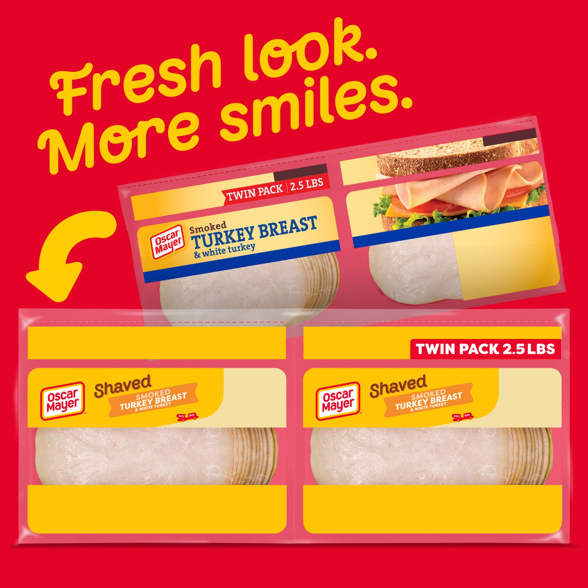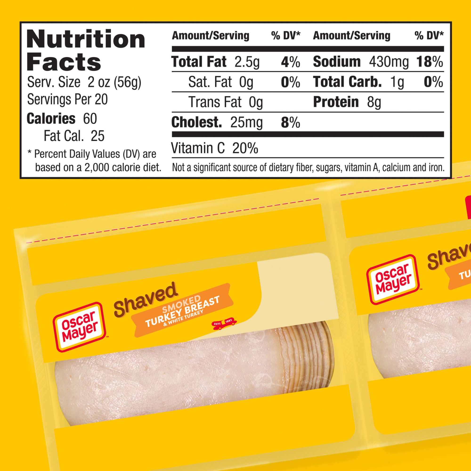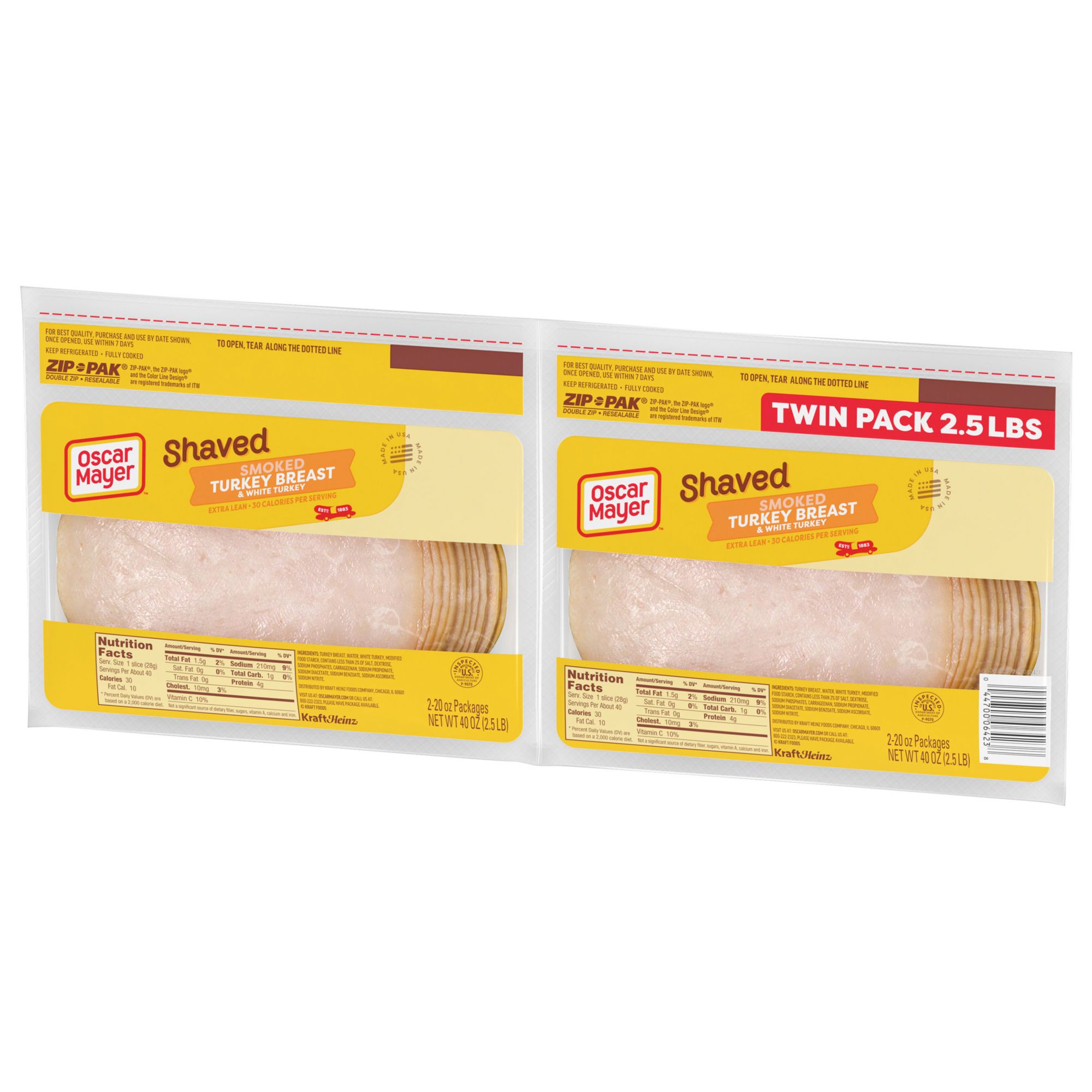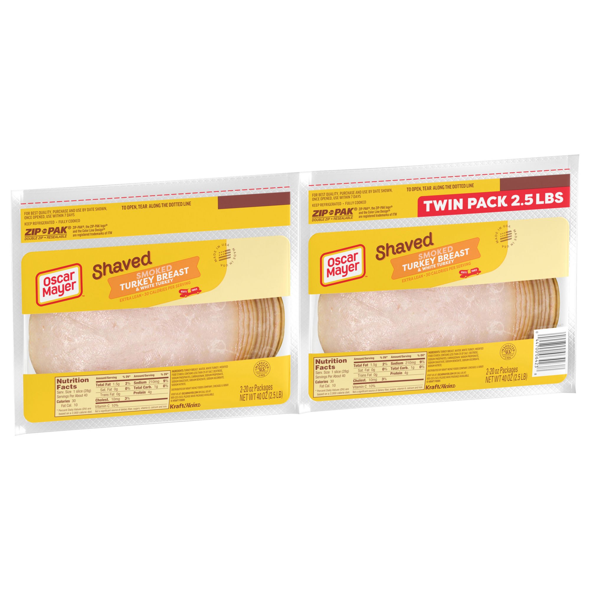 Keep your fridge stocked with Oscar Mayer Extra-Lean Smoked Turkey Breast Sliced Lunch Meat containing quality turkey breast and white turkey meat. With 30 calories per serving, this sliced white turkey makes a tasty addition to your favorite sandwich. This smoked turkey and white turkey deli meat is fully cooked and ready to eat. Enjoy delicious smoky flavor in every bite. Use slices of turkey to make a deli sandwich, or turkey melt sandwich as part of your lunch. Smoked turkey breast and white turkey also makes the perfect addition to a variety of salads and adds great flavor to standard cheese and crackers. This turkey lunch meat comes packaged in two 20-ounce resealable zip-packs to ensure freshness. If you enjoy this smoked turkey, be sure to try the other varieties of Oscar Mayer turkey lunch meat.