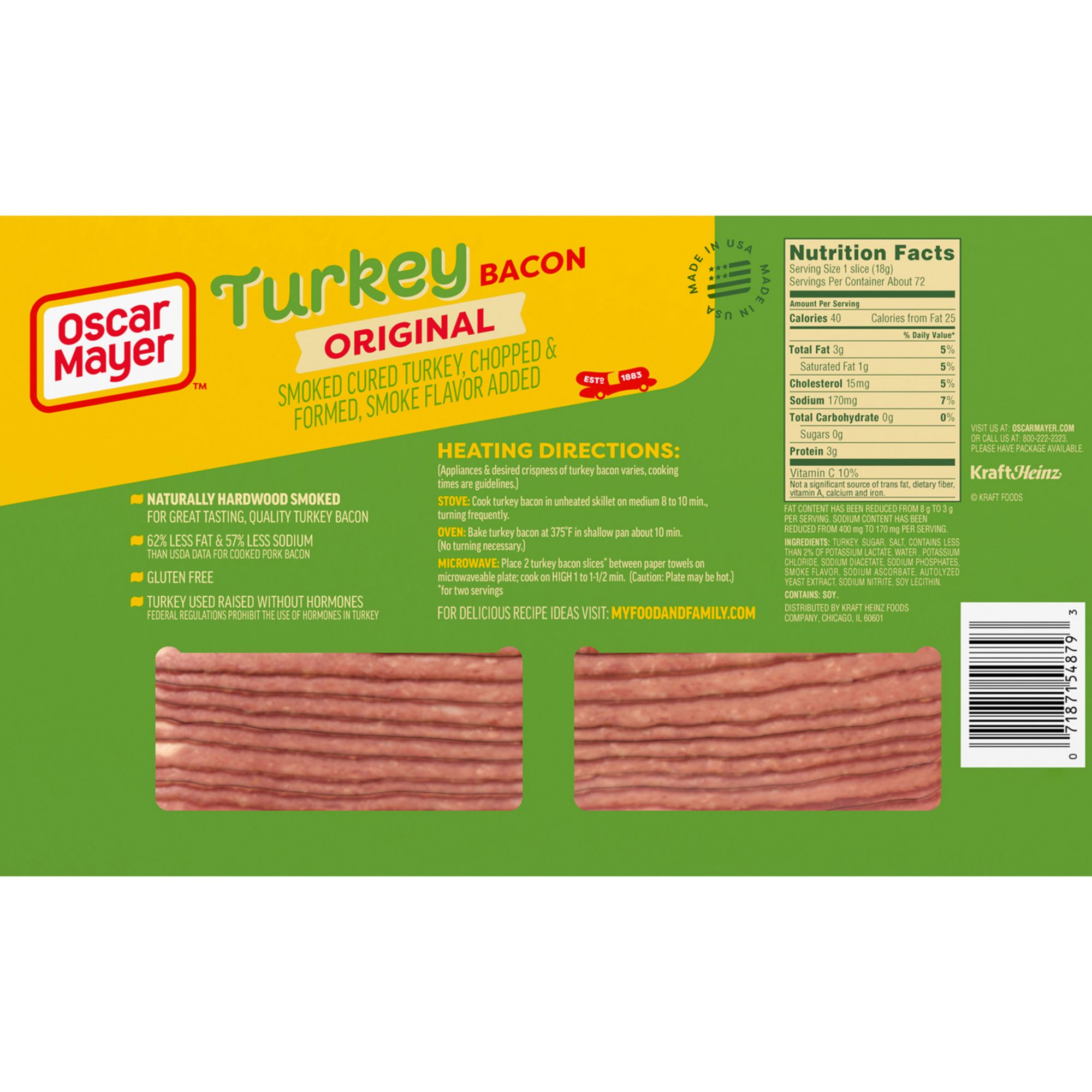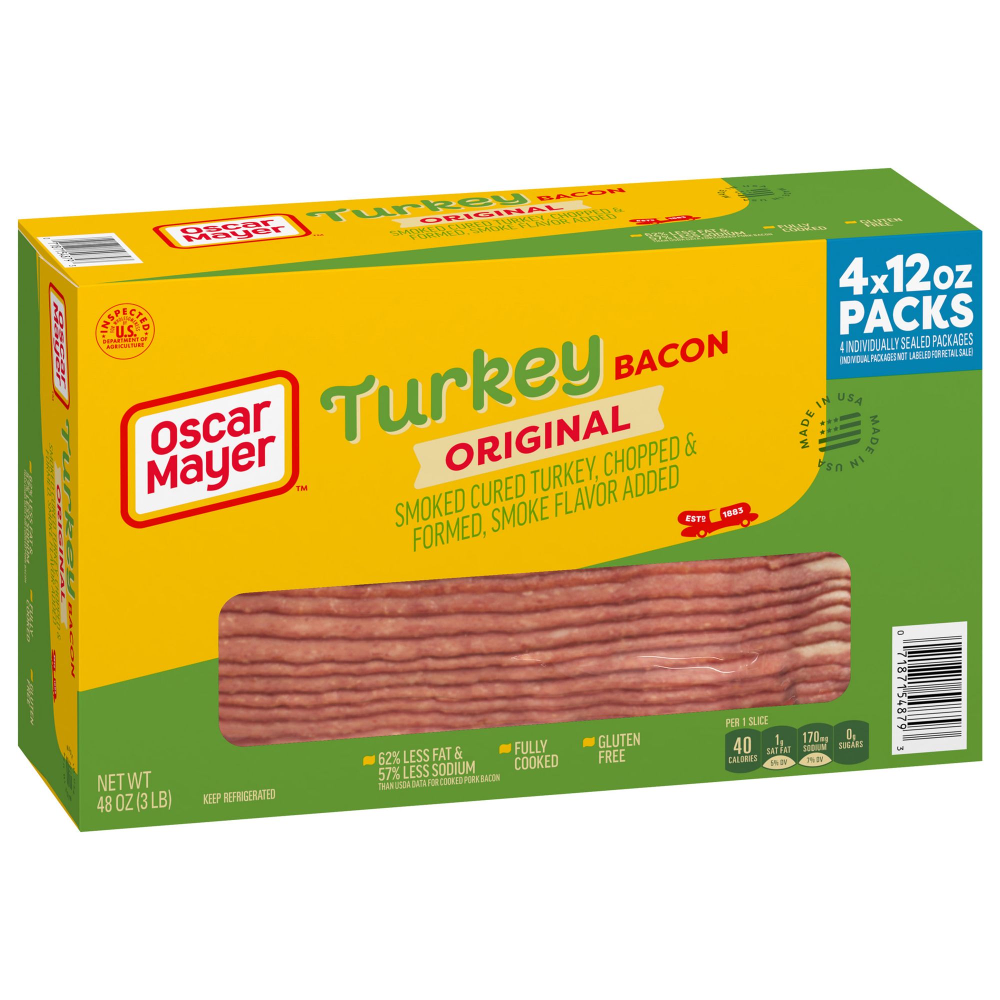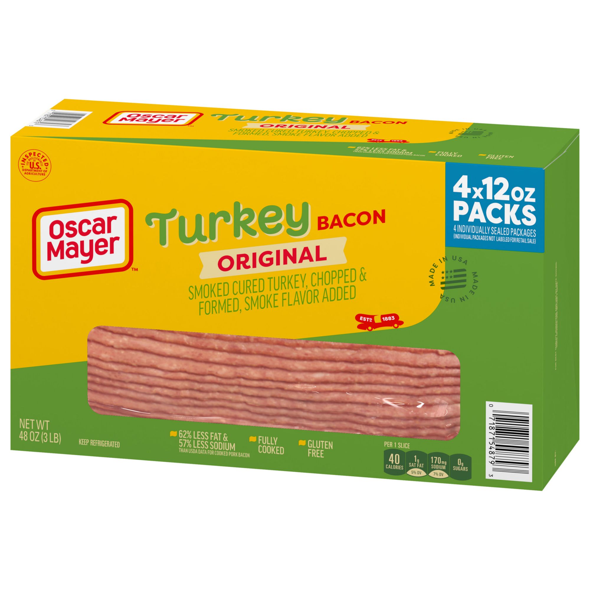 Everything is better with turkey bacon. Oscar Mayer Fully Cooked Smoked Turkey Bacon has 63% less fat and 57% less sodium than USDA data for pork bacon without sacrificing the flavor you crave. This fully cooked turkey bacon is raised without hormones as federal regulations prohibit the use of hormones of turkey. Each package of fully cooked turkey bacon minimizes prep time, making it easier to create delicious meals in a hurry. Heat this smoked cured turkey bacon on the stove, in the oven or microwave to your desired crispness. Taste the natural hardwood smoke flavor that makes Oscar Mayer turkey bacon the perfect addition to breakfast sandwiches and BLTs. Enjoy turkey bacon with eggs, try it as a savory salad topping or add some slices to your next turkey burger. Discover the endless possibilities of precooked turkey bacon. Oscar Mayer Smoked Cured Gluten Free Fully Cooked Turkey Bacon is vacuum packed in four resealable 12-ounce packages, with 71-73 slices total.