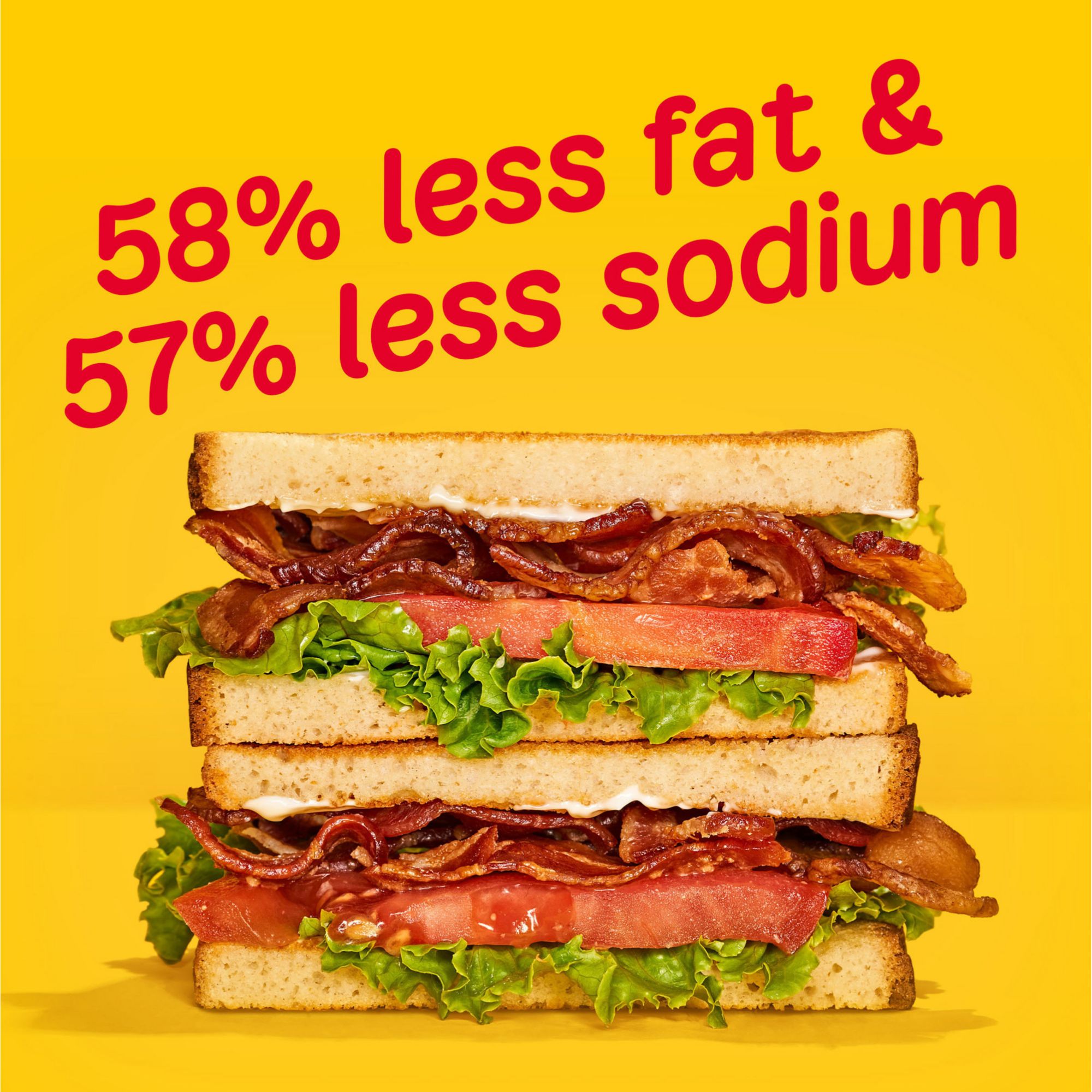 62% less fat and 57% less sodium than USDA data for cooked pork bacon, 71-73 slices
