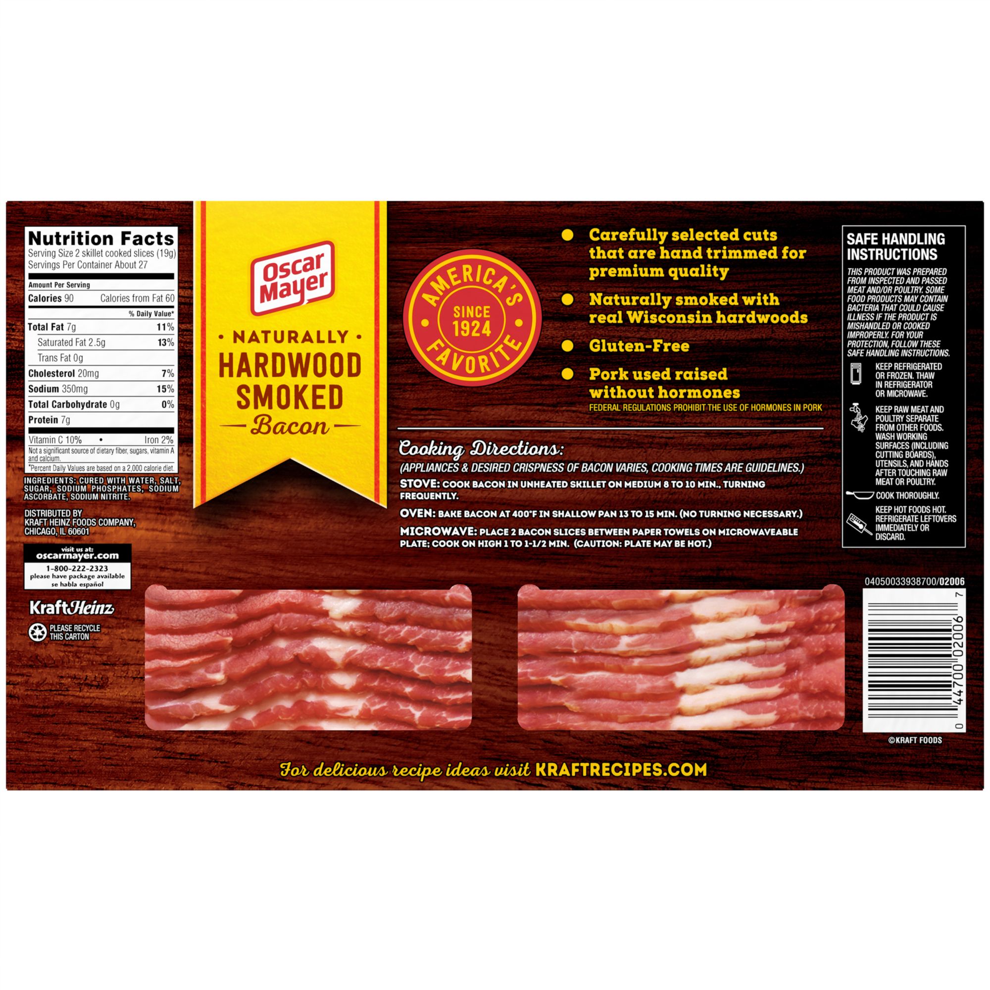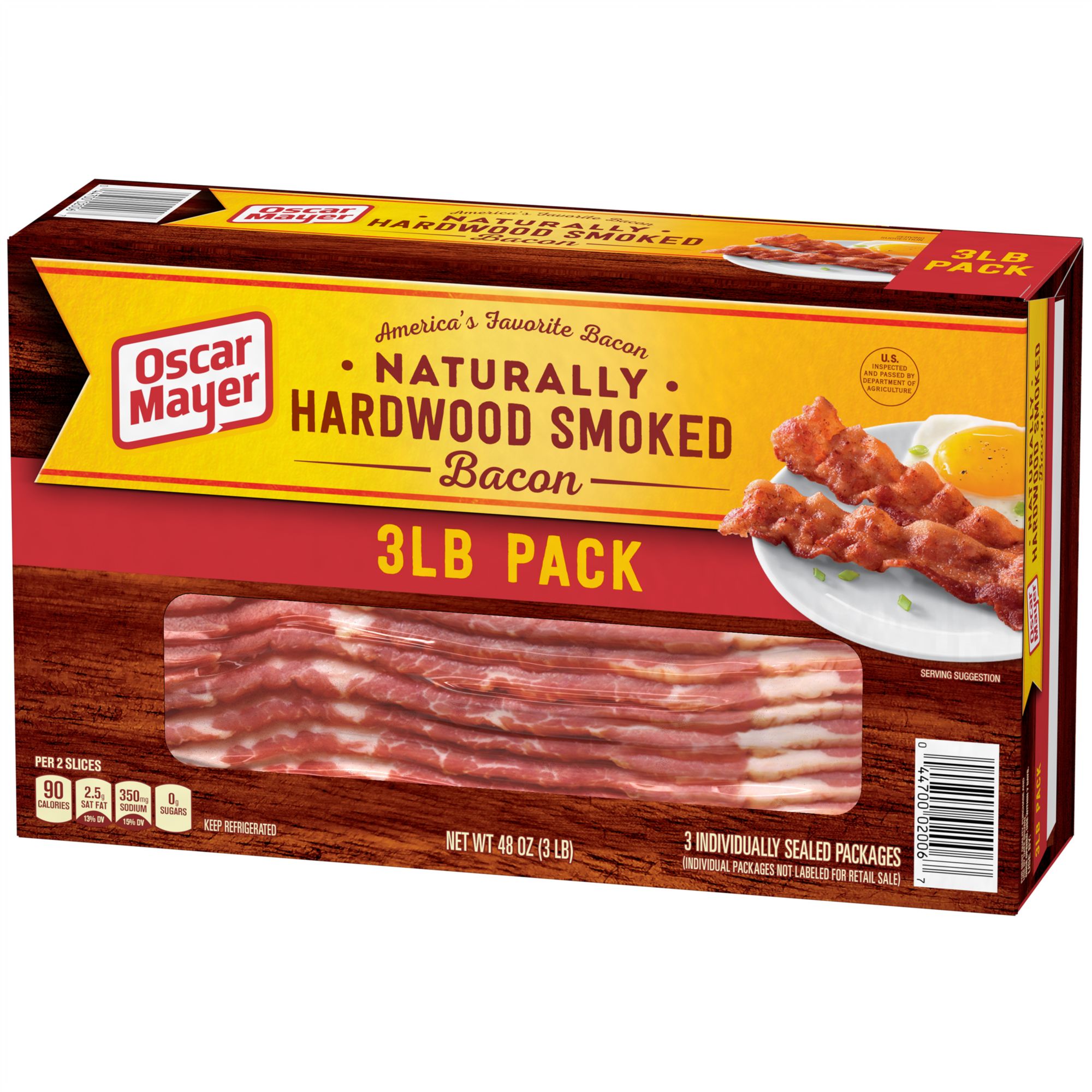 Oscar Mayer Naturally Hardwood Smoked Bacon delivers smoky bacon flavor in consistent slice sizes that cook up crisp in minutes. Naturally smoked with real Wisconsin hardwoods for a premium and delicious flavor, this fresh bacon is made from carefully selected, hand-trimmed cuts of pork raised without hormones. Use this naturally smoked bacon as part of a hearty breakfast of bacon and eggs, or to top your favorite dishes like salads or baked potatoes. This package of bacon comes in an 48 ounce package size so you can feed your entire family with the fresh, smokey flavor of America's Favorite Bacon. If you want a perfect slice of bacon every time, you've come to the right place! Oscar Mayer Naturally Hardwood Smoked Bacon is slow smoked and hand-trimmed from the finest cuts of pork. With all this great flavor, everything you make will be better. America's favorite bacon is great with breakfast, in recipes, and more!