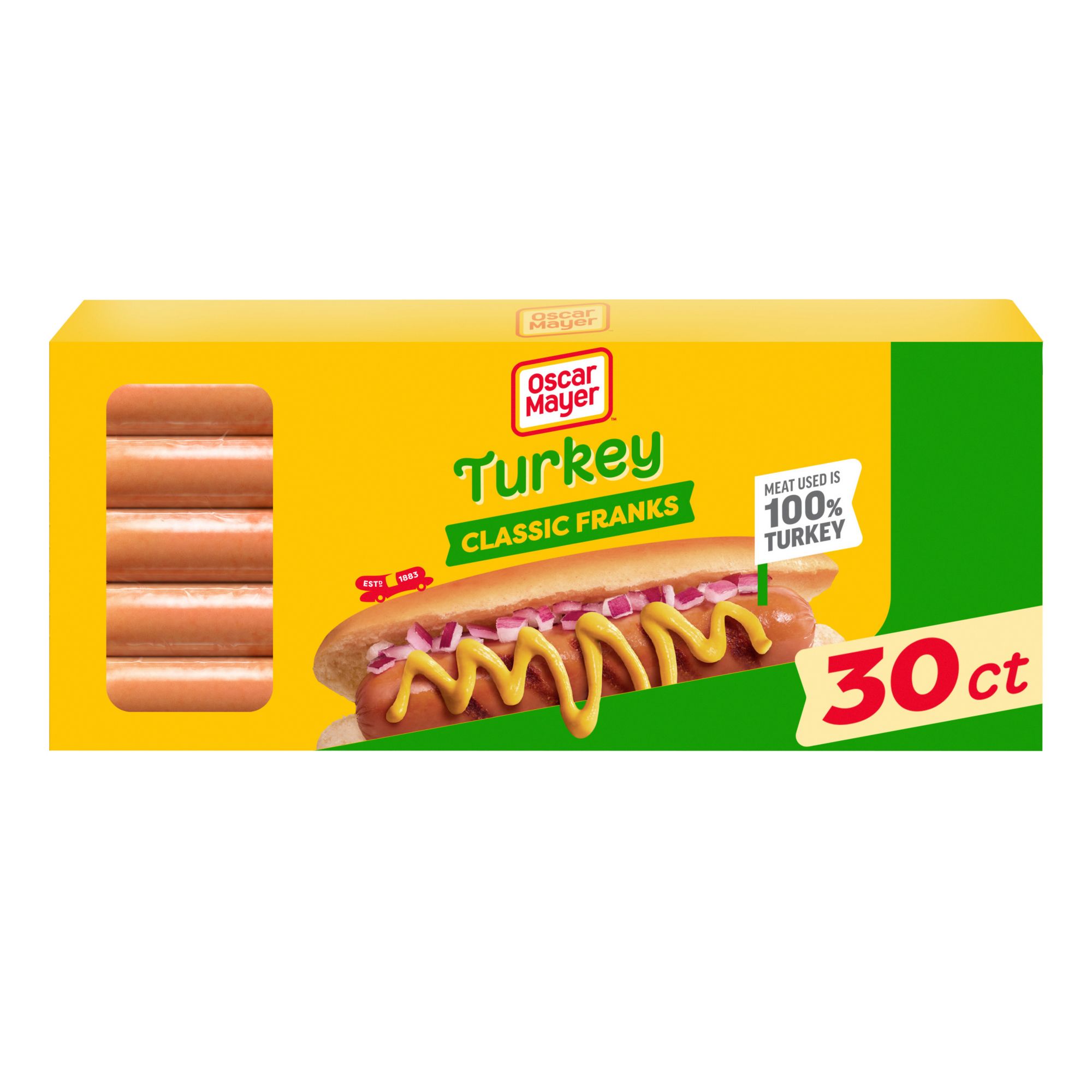 Grill up a winner. Oscar Mayer Turkey Franks Hot Dogs are fully cooked, making mealtime a breeze with their quick prep and delicious taste. Try grilling these turkey dogs for a family BBQ, roasting over a campfire or cooking in your kitchen for a quick breakfast with eggs. Top these turkey hot dogs with ketchup, mustard and relish, or try a regional favorite like chili or sauerkraut. Each 48-ounce box contains 6 packages of 5 turkey franks each, for a total of 30 turkey franks. Keep refrigerated until ready to prepare.