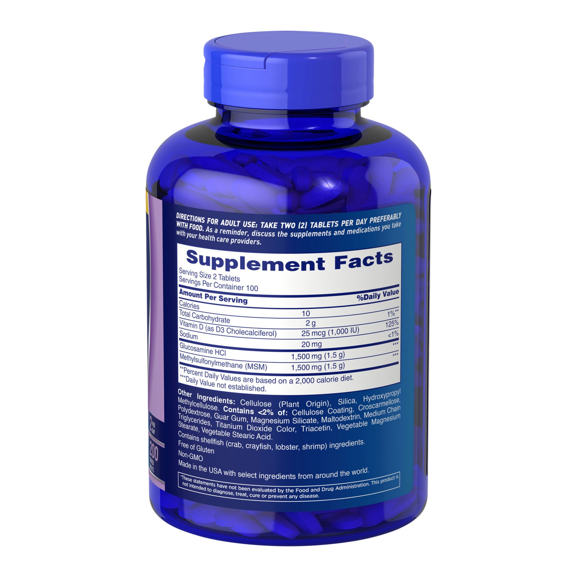 Ease arthritis pain with this dietary supplement that helps promote joint health and comfort within just 7 days of use. Each serving delivers 1,500mg of glucosamine, 1,500mg of MSM and 1,000 IU of vitamin D3. The coated caplets are easy to swallow.