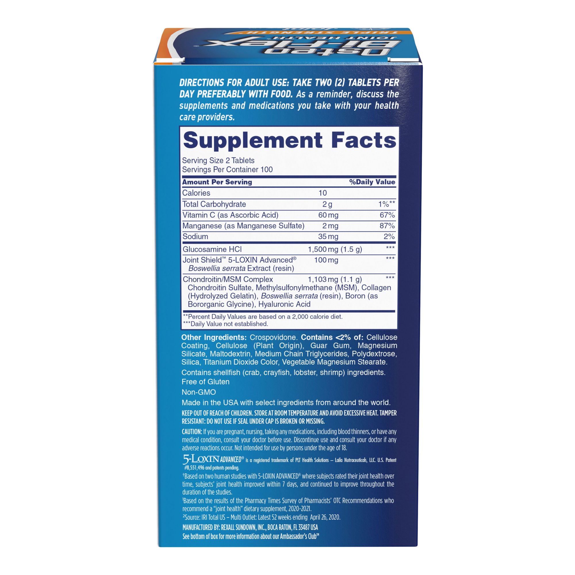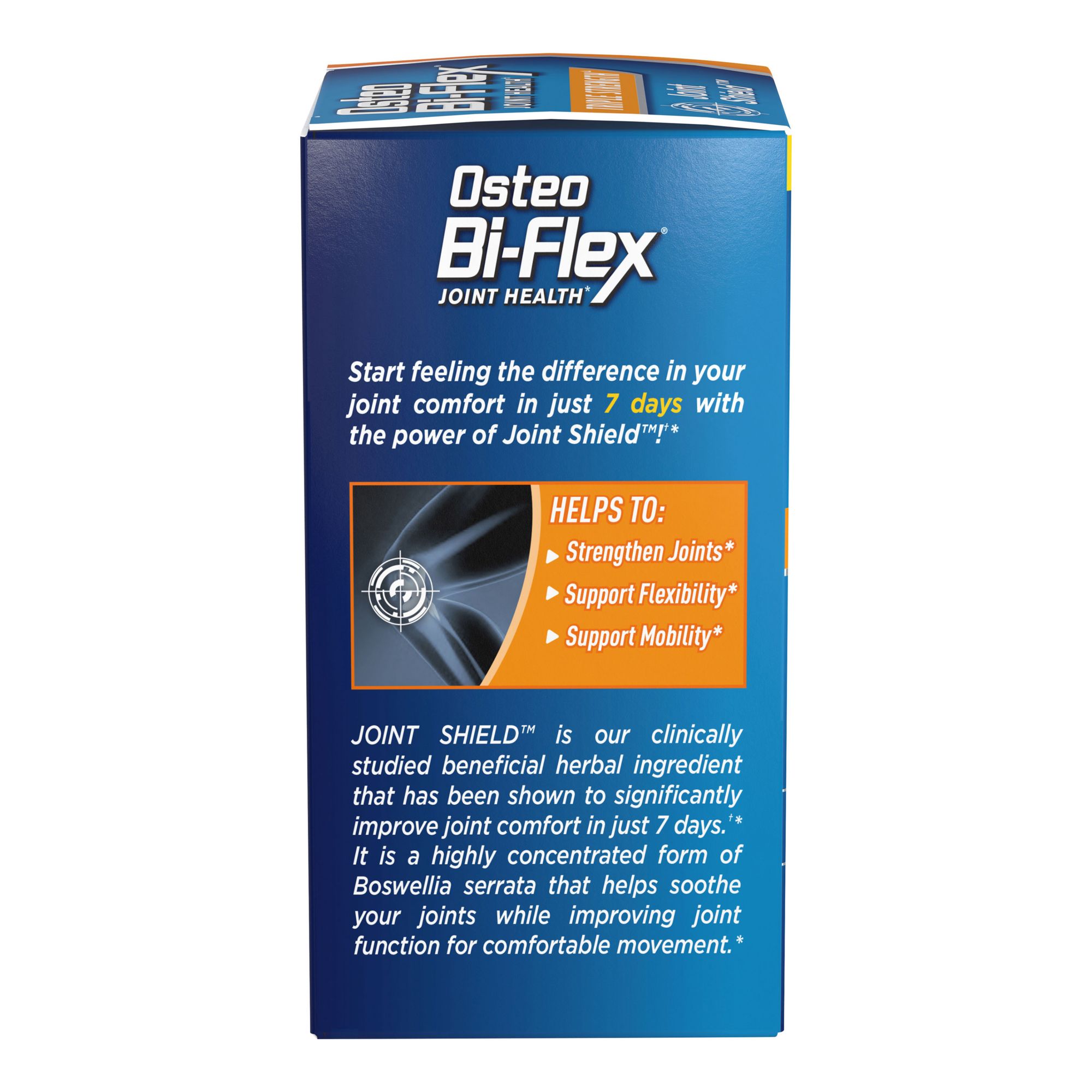 Triple strength joint supplement helps protect cartilage and helps with annoying flare-ups while renewing the cellular components within joints* Contains 5-Loxin which is shown to improve joint comfort within 7 days** #1 doctor and #1 pharmacist† recommended brand Coated caplets are easy to swallow Take 2 caplets per day with food Contains 1,500mg of glucosamine, 1,350mg of Joint Shield proprietary blend, 1,250mg of chondroitin/MSM complex, 100mg of 5-Loxin and 3mg of boron Free of yeast, wheat, milk, milk derivatives, lactose, sugar, preservatives, soy and artificial flavor