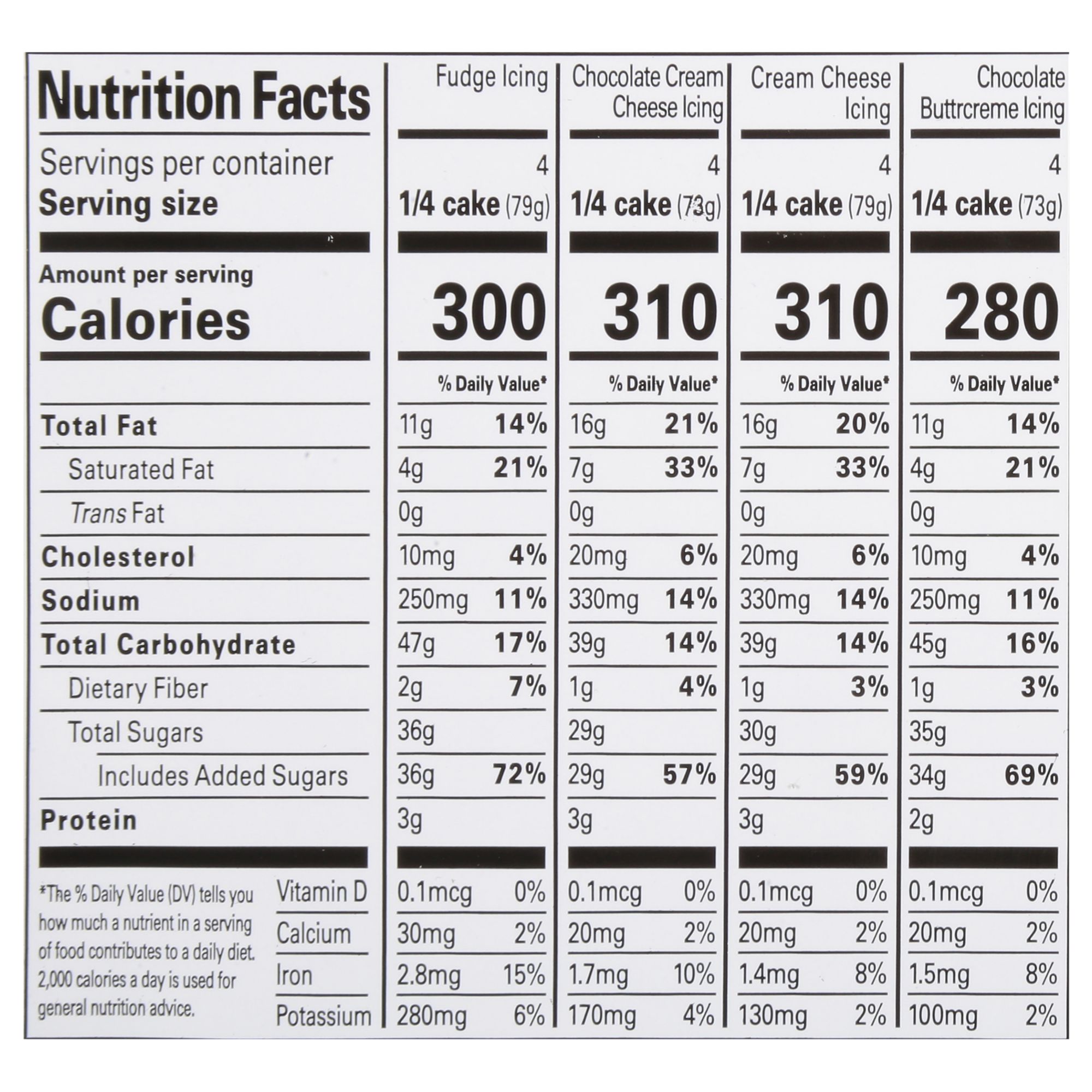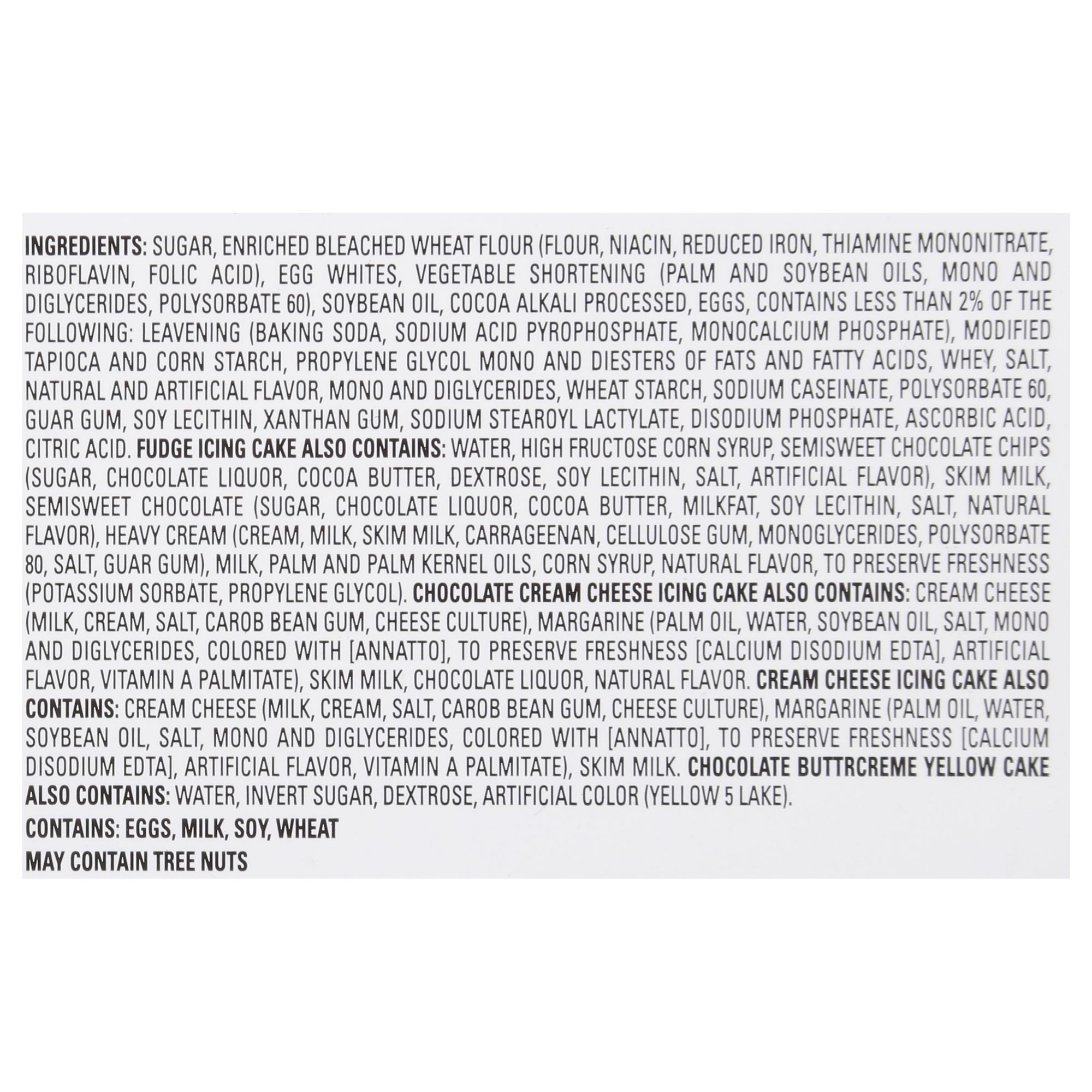 Ingredients: Sugar, Enriched Bleached Wheat Flour (Flour, Niacin, Reduced Iron, Thiamine Mononitrate, Riboflavin, Folic Acid), Egg Whites, Vegetable Shortening (Palm And Soybean Oils, Mono And Diglycerides, Polysorbate 60), Soybean Oil, Cocoa Alkali Processed, Eggs, Contains Less Than 2% Of The Following: Leavening (Baking Soda, Sodium Acid Pyrophosphate, Monocalcium Phosphate), Modified Tapioca And Corn Starch, Propylene Glycol Mono And Diesters Of Fats And Fatty Acids, Whey, Salt, Natural And Artificial Flavor, Mono And Diglycerides, Wheat Starch, Sodium Caseinate, Polysorbate 60, Guar Gum, Soy Lecithin, Xanthan Gum, Sodium Stearoyl Lactylate, Disodium Phosphate, Ascorbic Acid, Citric Acid. Fudge Icing Cake Also Contains: Water, High Fructose Corn Syrup, Semisweet Chocolate Chips (Sugar, Chocolate Liquor, Cocoa Butter, D Extrose, Soy Lecithin, Salt, Artificial Flavor), Skim Milk, Semisweet Chocolate (Sugar, Chocolate Liquor, Cocoa Butter, Milkfat, Soy Lecithin, Salt, Natural Flavor), Heavy Cream (Cream, Milk, Skim Milk, Carrageenan, Cellulose Gum, Monoglycerides, Polysorbate 80, Salt, Guar Gum), Milk, Palm And Palm Kernel Oils, Corn Syrup, Natural Flavor, To Preserve Freshness (Potassium Sorbate, Propylene Glycol). Chocolate Cream Cheese Icing Cake Also Contains: Cream Cheese (Milk, Cream, Salt, Carob Bean Gum, Cheese Culture), Margarine (Palm Oil, Water, Soybean Oil, Salt, Mono And Diglycerides, Colored With [Annatto], To Preserve Freshness [Calcium Disodium Edta], Artificial Flavor, Vitamin A Palmitate), Skim Milk, Chocolate Liquor, Natural Flavor. Cream Cheese Icing Cake Also Contains: Cream Cheese (Milk, Cream, Salt, Carob Bean Gum, Cheese Culture), Margarine (Palm Oil, Water, Soybean Oil, Salt, Mono And Diglycerides, Colored With [Annatto], To Preserve Freshness [Calcium Disodium Edta], Artificial Flavor, Vitamin A Palmitate), Skim Milk. Chocolate Buttrcreme Yellow Cake Also Contains: Water, Invert Sugar, Dextrose, Artificial Color (Yellow 5 Lake).