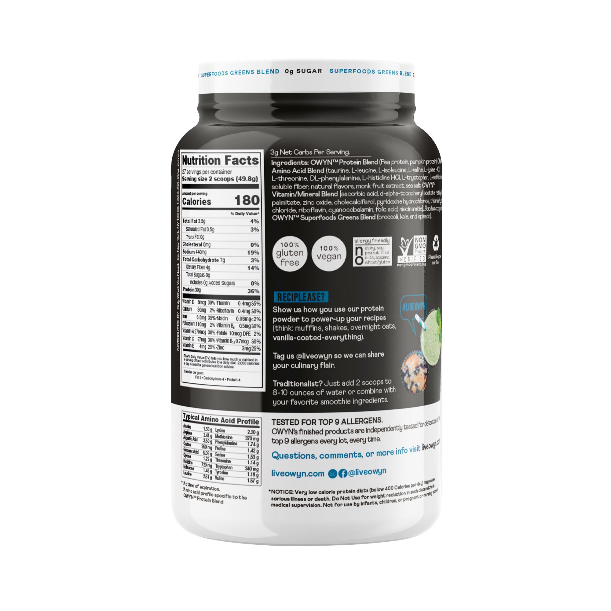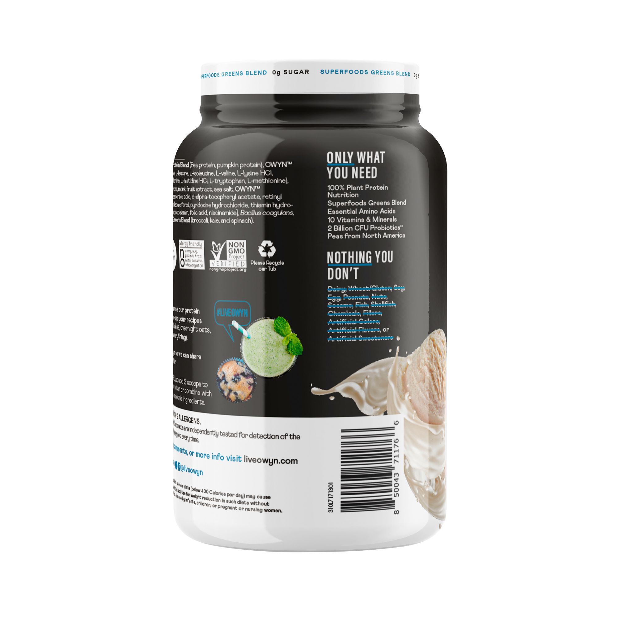 Ingredients: Owyn Protein Blend (Pea Protein, Pumpkin Protein), Owyn Amino Acid Blend (Taurine, L-leucine, L-isoleucine, L-valine, L-lysine Hci, L-threonine, Dl-phenylalanine, L-histidine Hci, L-tryptophan, L-methionine), Soluble Fiber, Natural Flavors, Monk Fruit Extract, Sea Salt, Owyn Vitamin/mineral Blend [Ascorbic Acid, D-alpha-to-copheryl Acetate, Retinyl Palmitate, Zinc Oxide, Chloecalciferol, Pyridoxine Hydrochloride, Thiamin Hydrochloride, Riboflavin, Cyanocobalamin, Folic Acid, Niacinamide], Bacillus Coagulans, Owyn Greens Blend (Broccoli, Kale, And Spinach).