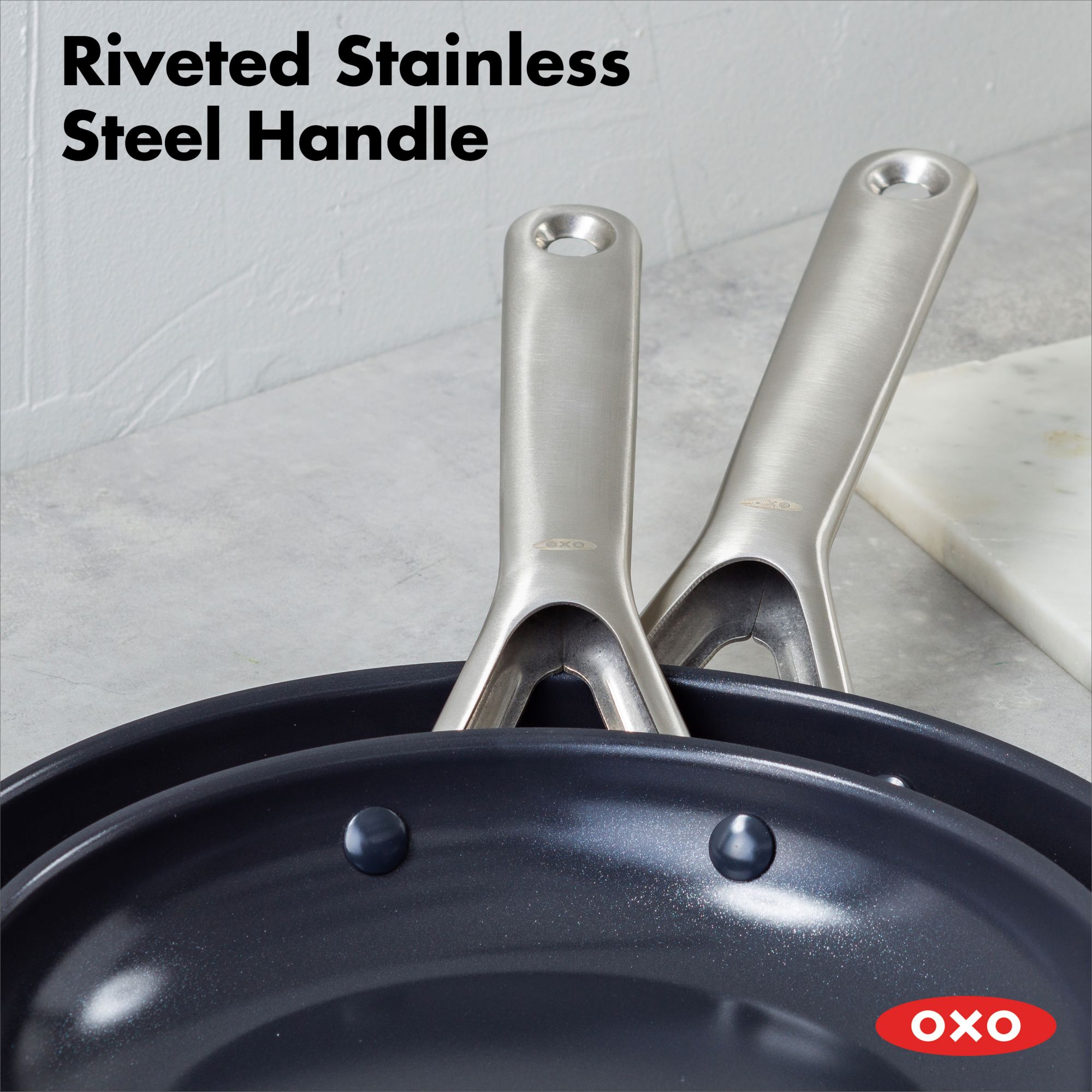 Stainless-steel Handles are contoured to keep cooking comfortable