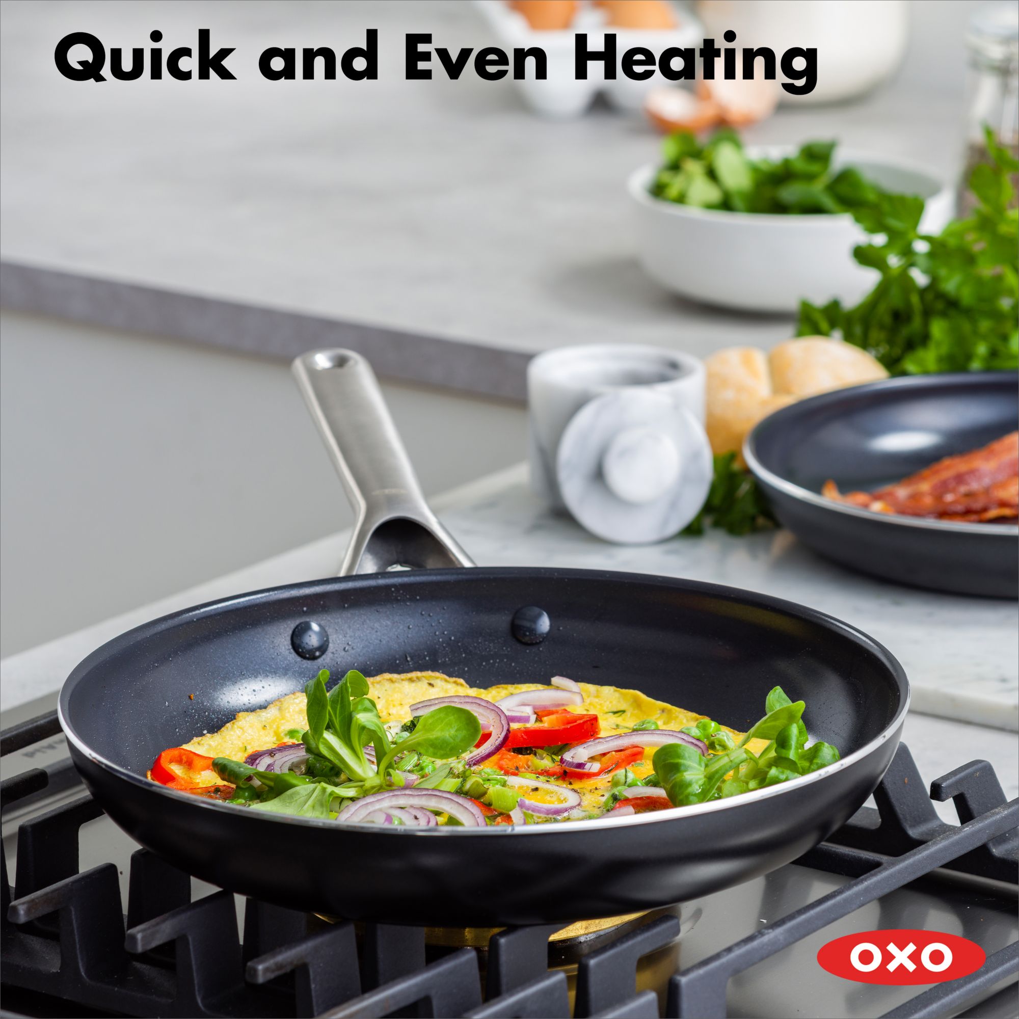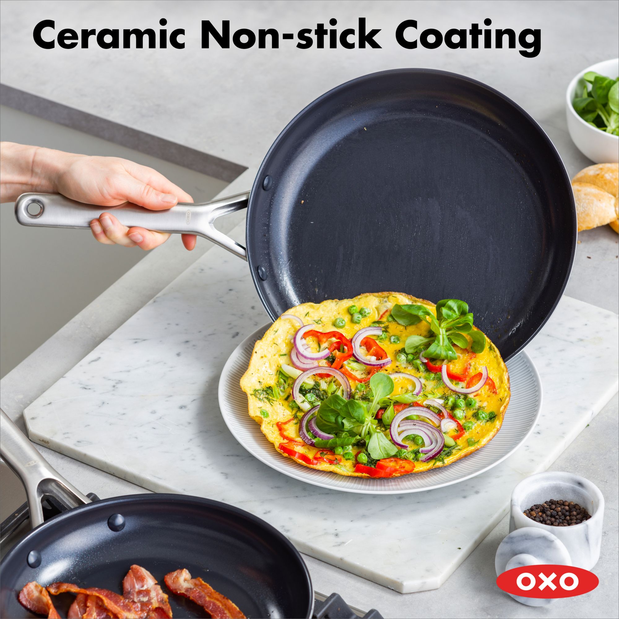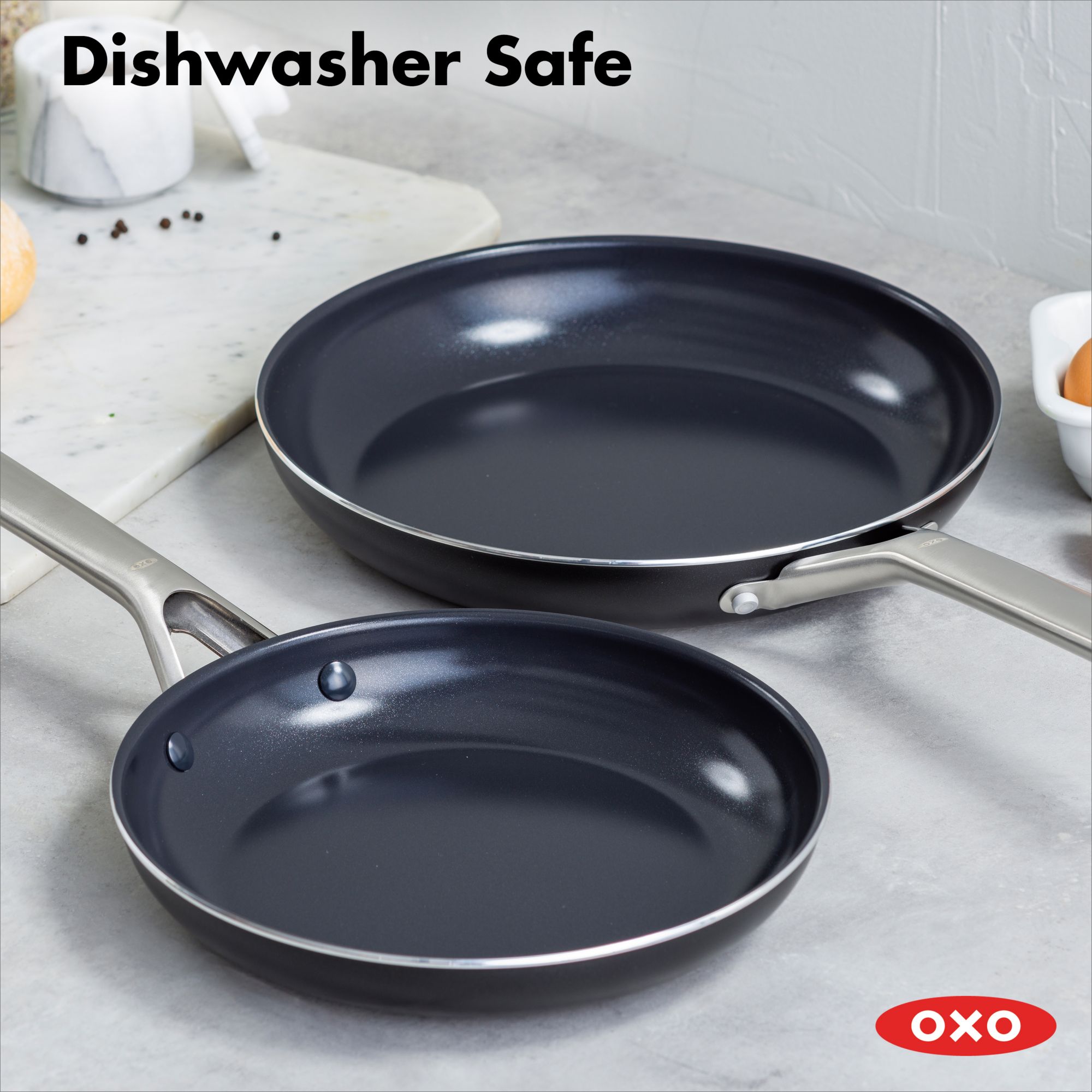 These PFAS-free ceramic non-stick pans are reinforced with diamonds for outstanding performance. The stainless-steel handles are contoured to keep cooking comfortable, while a safeguard rim is angled to help prevent chipping. These pans heat quickly and evenly and are oven safe up to 600 degrees and are suitable for all stovetops except induction.